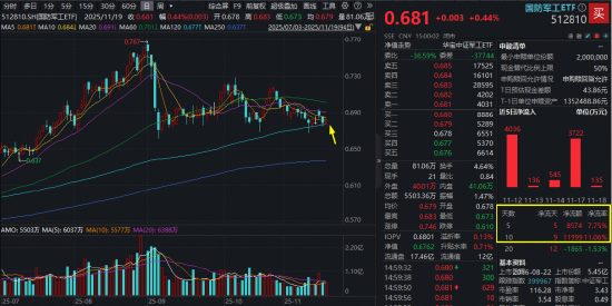 受光启技术、中航光电、中国长城等多只权重股收跌影响,国防军工ETF(512810)场内微涨0.44%报收,仍跑赢大市。场内连续第7日溢价交易,买盘活跃依旧。此前10个交易日,512810累计吸金1.2亿元。