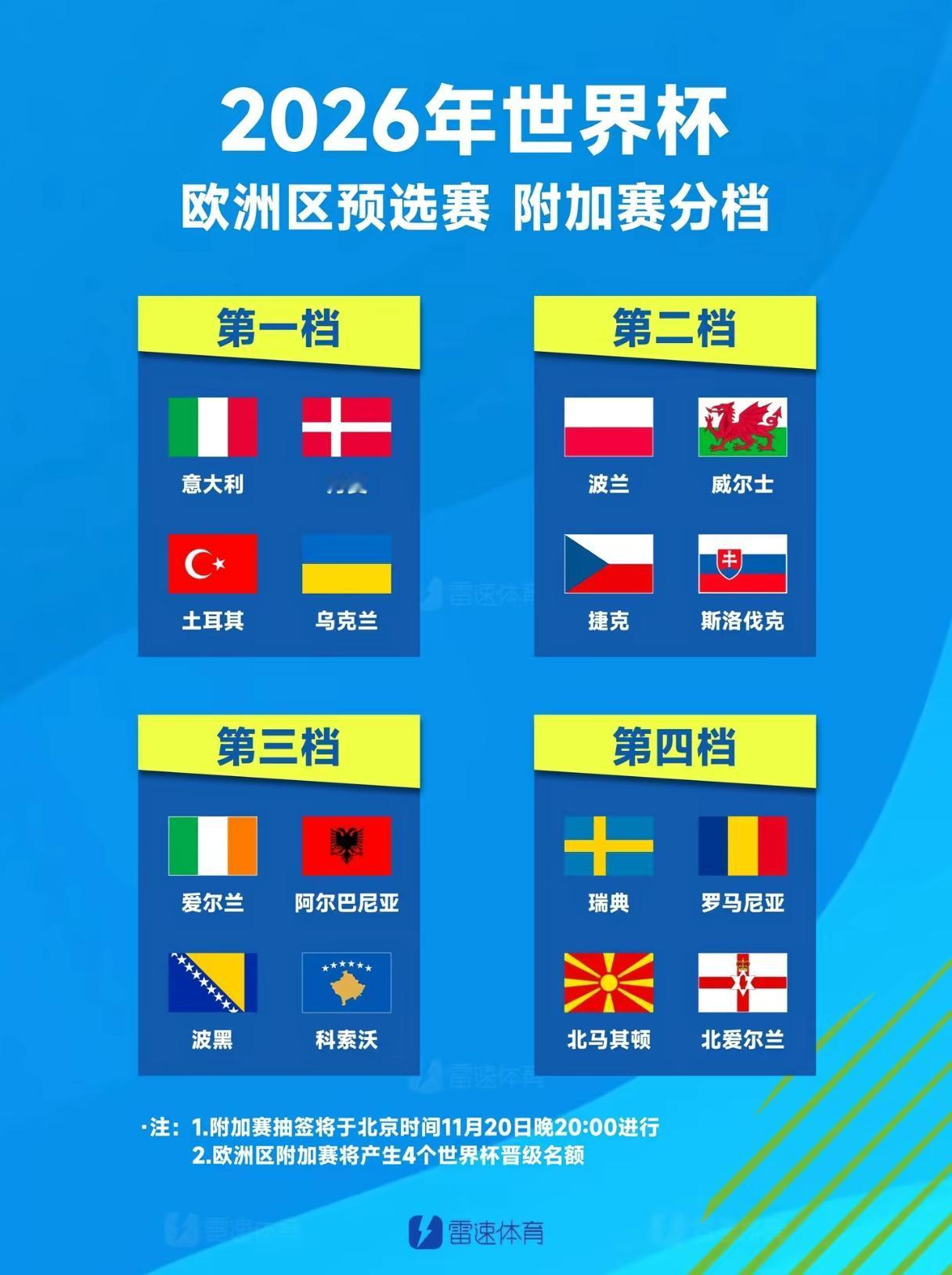 看看这张图,这就是世界杯欧洲区预选赛的强度,剩下的16支队伍要通过附加赛争取4张入场券。 意大利(世界杯4届冠军🥇,两届亚军🥈,一届季军🥉) 丹麦(1998年世界杯8强) 土耳其(2002年世界杯季军🥉,当届最大黑马) 乌克兰(2006年世界杯8强) 波兰(两届世界杯季军🥉) 捷克(两届世界杯亚军🥈) 瑞典(一次世界杯亚军🥈) 罗马尼亚(1994年世界杯8强) 这就是欧洲足球的厚度,欧洲区预选赛的激烈程度不亚于世界杯正赛
