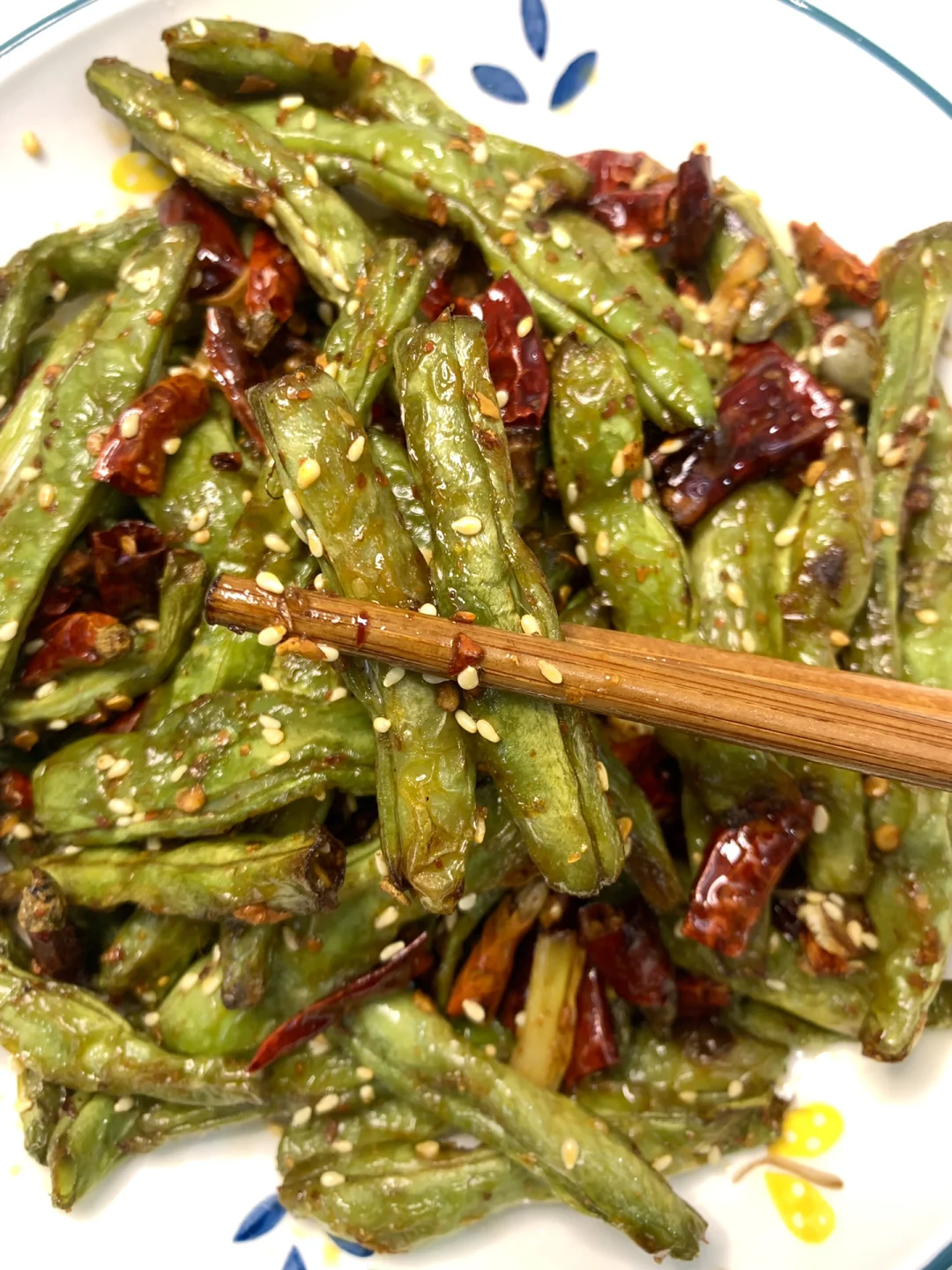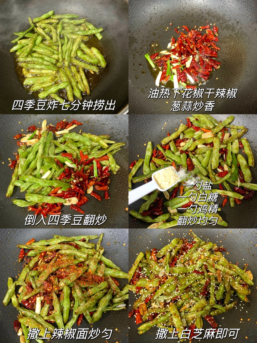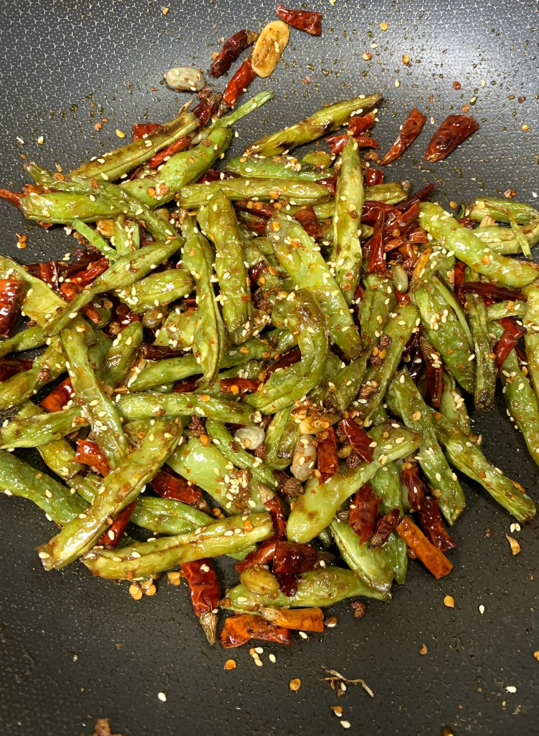 今天做了干煸四季豆,以前在饭店吃过一直念念不忘这个味道,今天居然完美复刻出来了[派对R][派对R]味道和饭店的一模一样!!☺️一定要保存下来试试~ 食材:四季豆、花椒、干辣椒、蒜片、葱段 做法: 1⃣️四季豆折成段,洗净沥干水分,油热下锅炸熟(七分钟左右)捞出备用 2⃣️另起锅烧油,下花椒、干辣椒、蒜片、葱段炒香,加入四季豆翻炒均匀,加入一勺盐、一勺白糖、一勺鸡精炒匀,再撒上花椒面翻炒几下,撒上白芝麻即可~