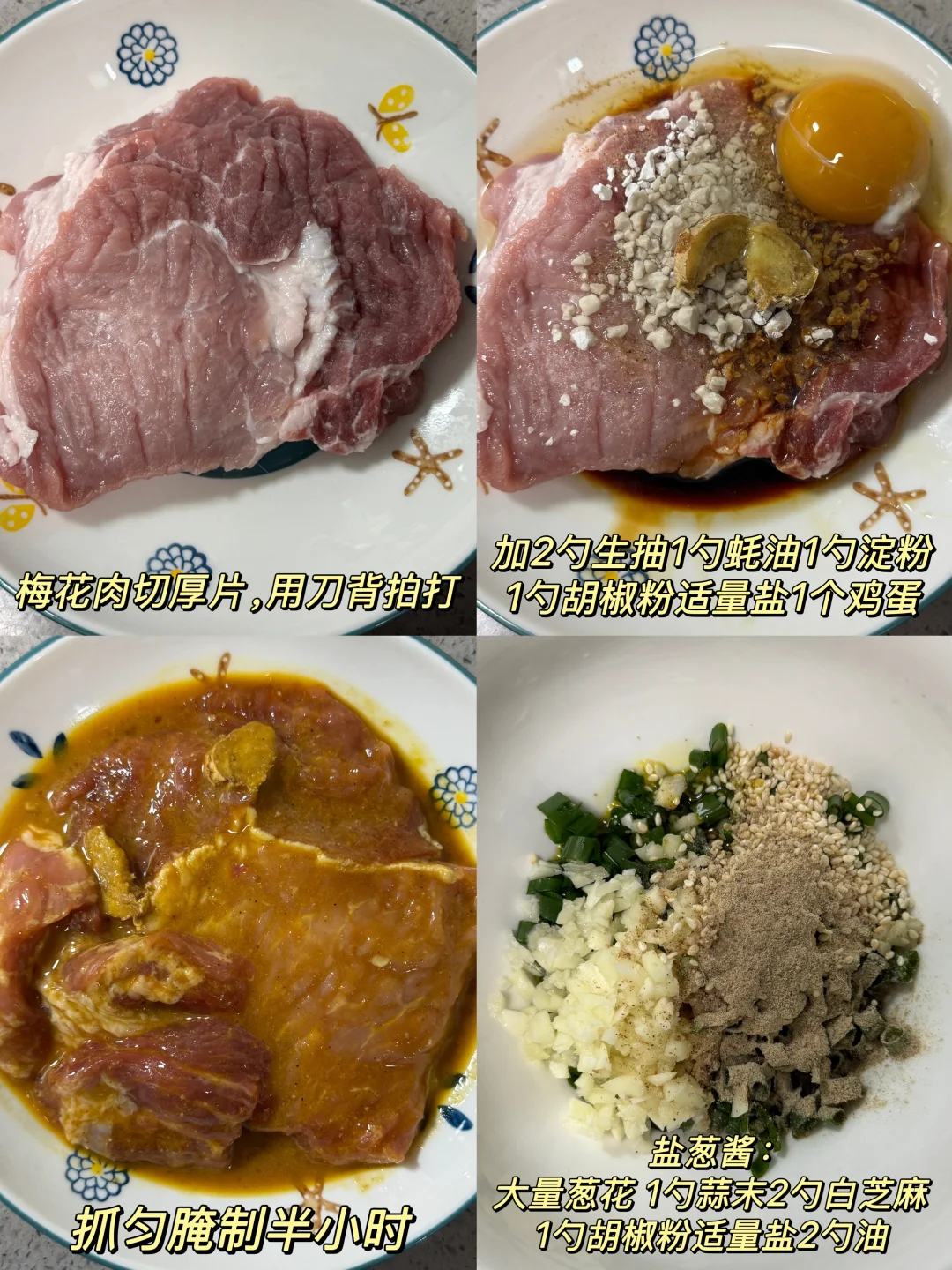 1️⃣梅花肉切厚片,用刀背拍打,加2勺生抽、1勺蚝油、1勺淀粉、1勺胡椒粉、适量盐、1个鸡蛋,抓匀腌制半小时