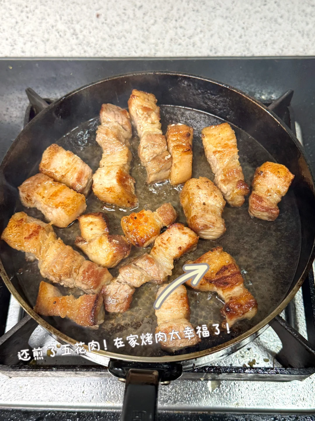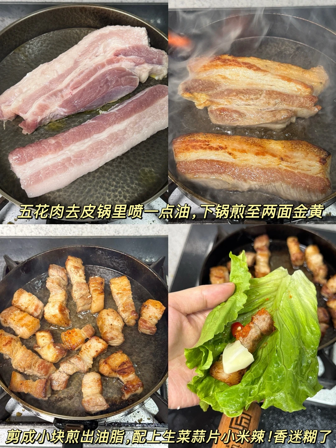 我还煎了两块五花肉,配上生菜蒜片和辣椒,香迷糊了~~