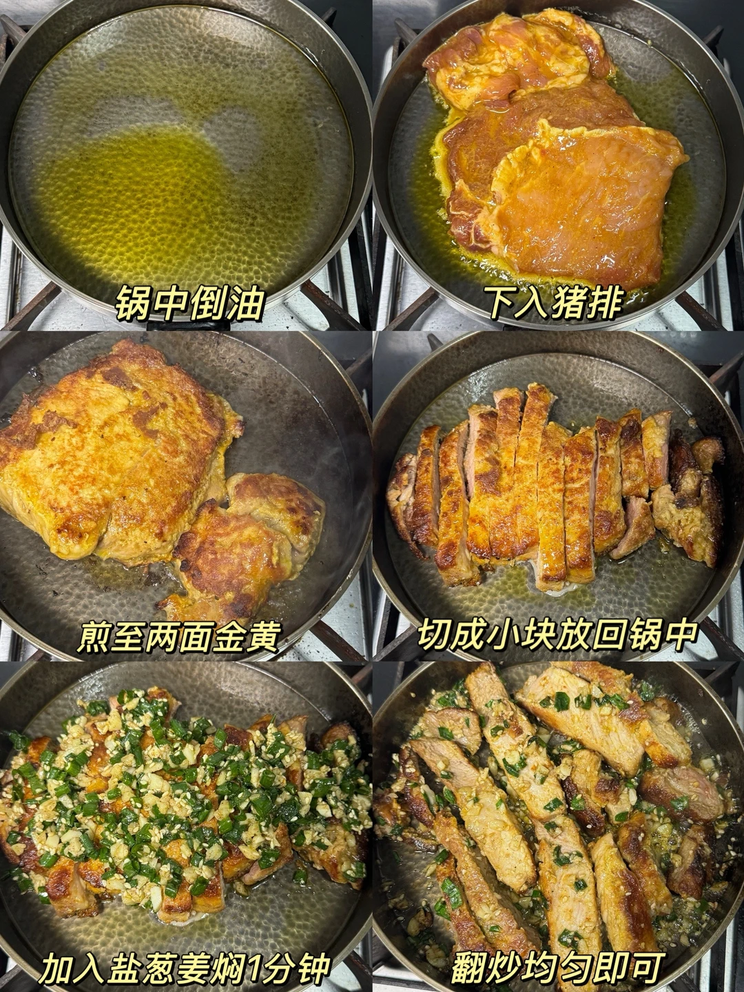 2️⃣油热下猪排煎至两面金黄,捞出改刀成小块放回锅中