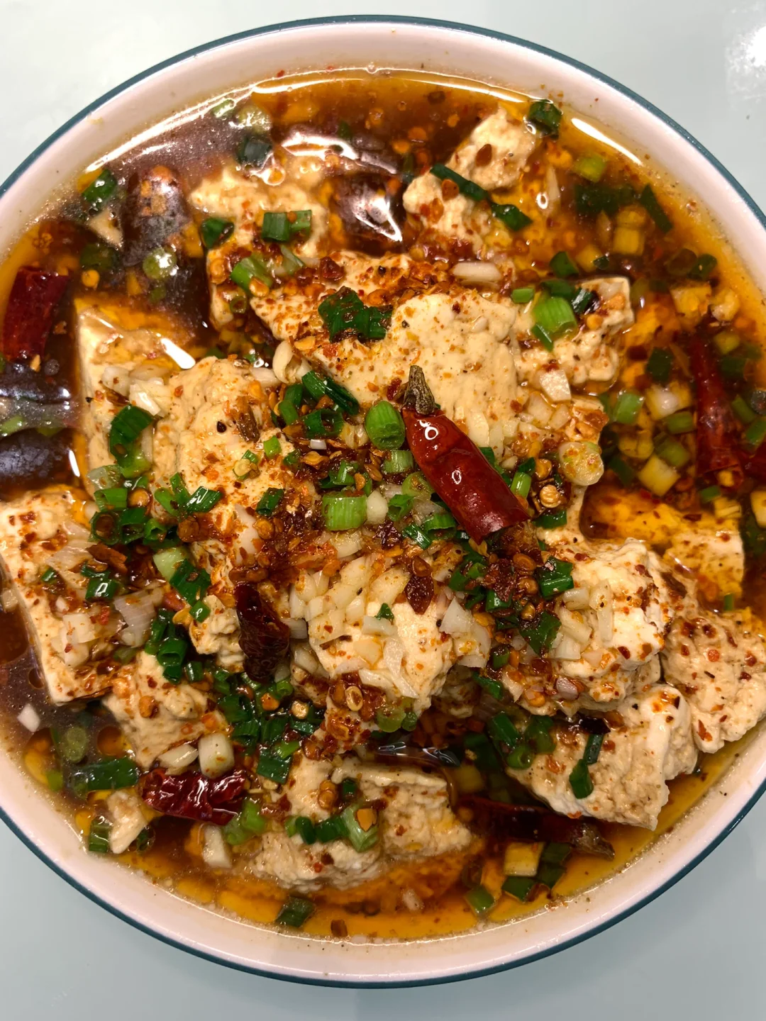 4⃣️把烧开的料汁浇在豆腐上,撒上葱花、蒜末、辣椒面、干辣椒,淋上热油即可~