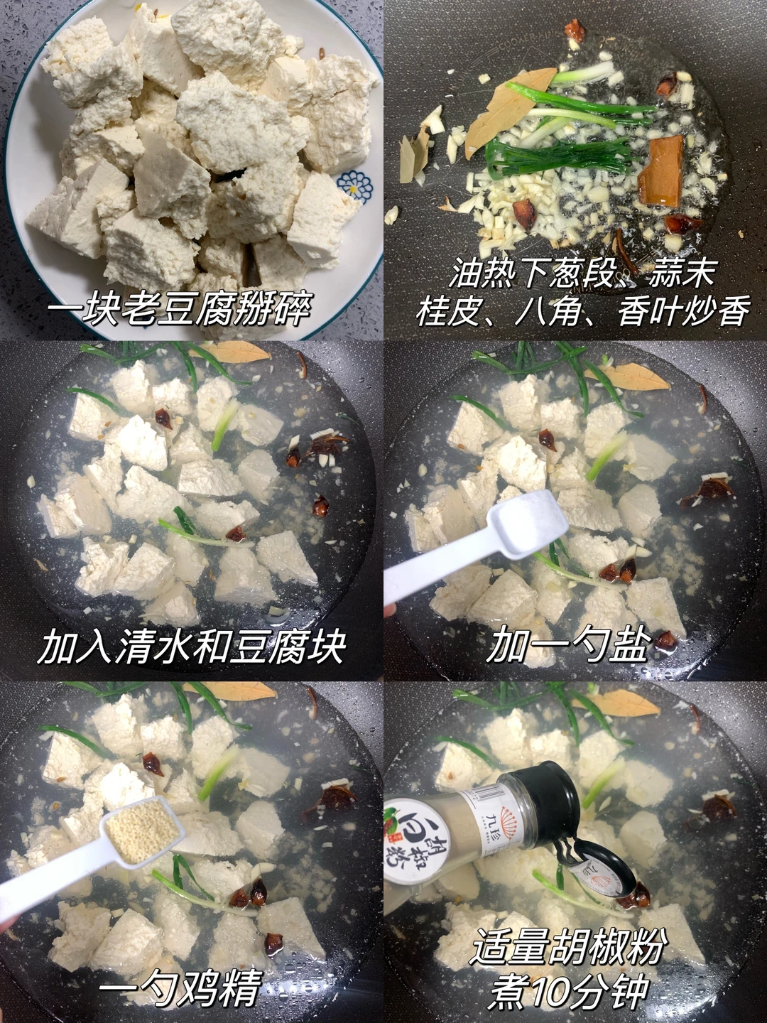 2⃣️加入清水和豆腐,水没过豆腐,加一勺盐、一勺鸡精、适量白胡椒粉,煮十分钟,捞出豆腐,并留出3勺豆腐汤。
