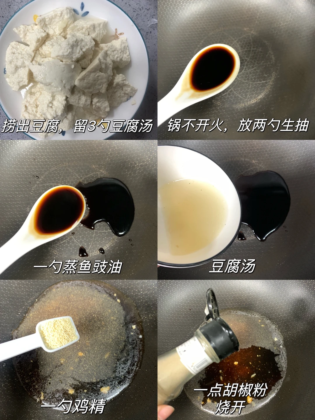 3⃣️锅洗净擦干,不开火,加两勺生抽、一勺蒸鱼豉油、豆腐汤、一勺鸡精、一点白胡椒粉烧开
