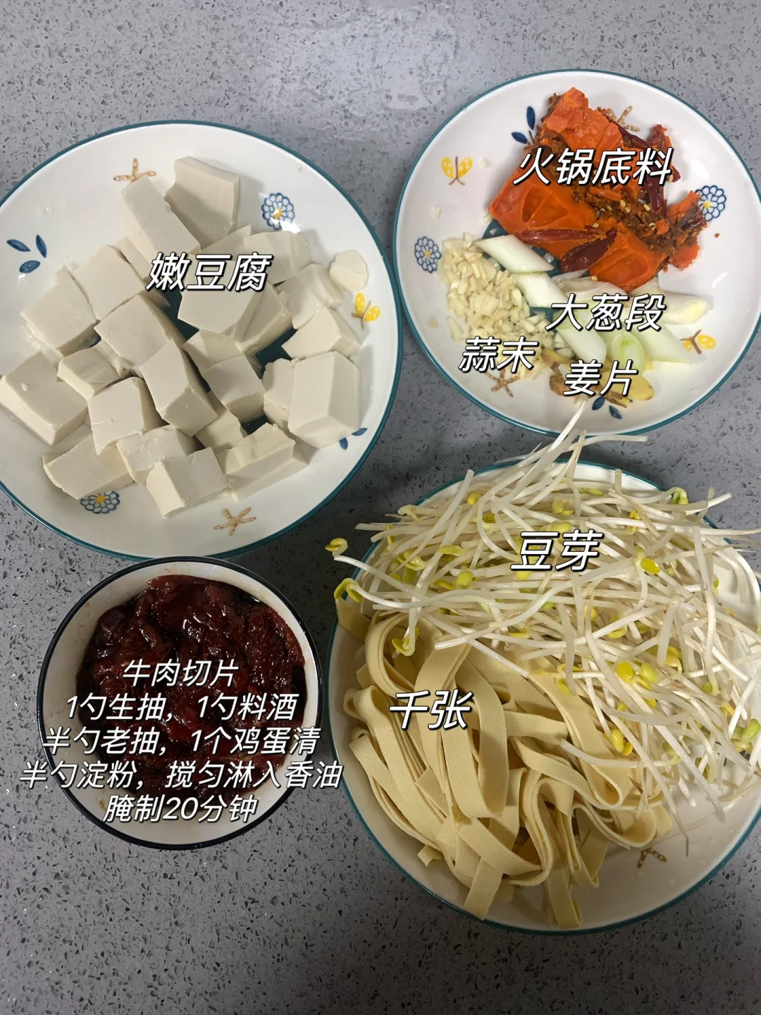 食材:牛肉、嫩豆腐、豆芽千张(可替换成自己喜欢的配菜)、蒜、姜、大葱、葱花、香菜