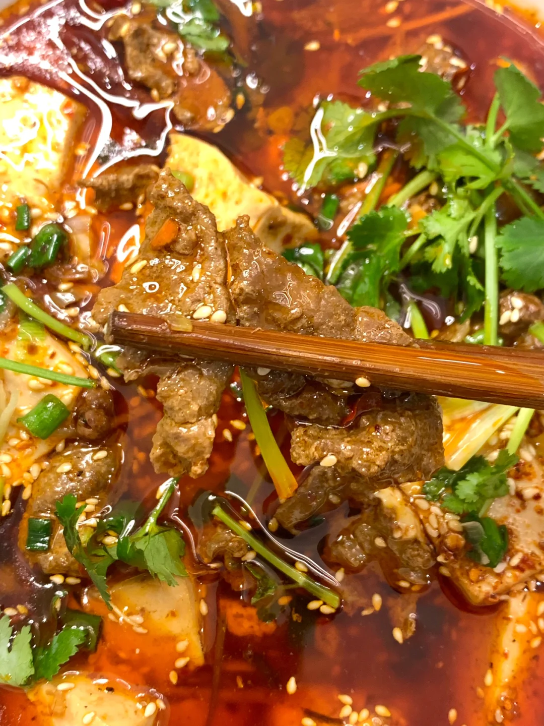 3⃣️下入配菜烫熟盛碗底,再下入嫩豆腐煮3分钟,加牛肉烫熟后一起倒入碗中,撒上蒜末、辣椒面、白芝麻和葱花,淋入热油,撒上香菜即可~