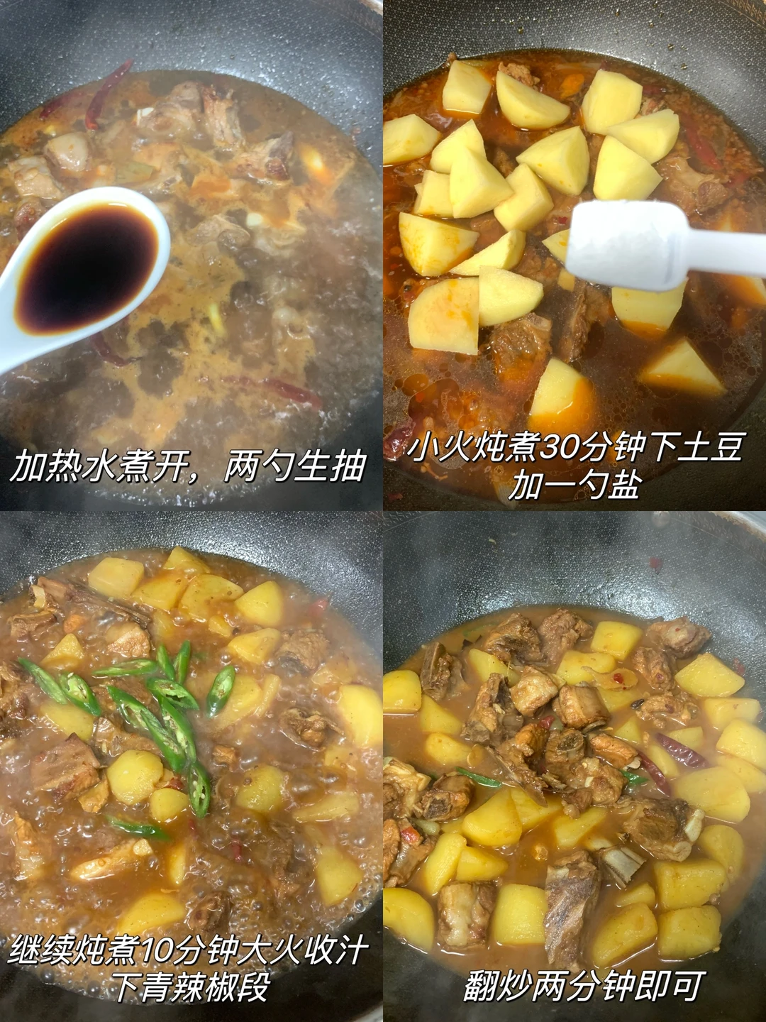 4⃣️加入土豆和一勺盐,继续炖煮10分钟,大火收汁下辣椒段翻炒一两分钟即可