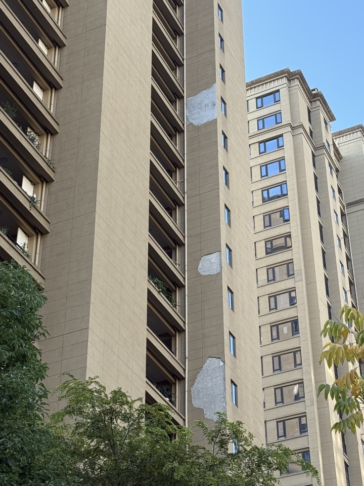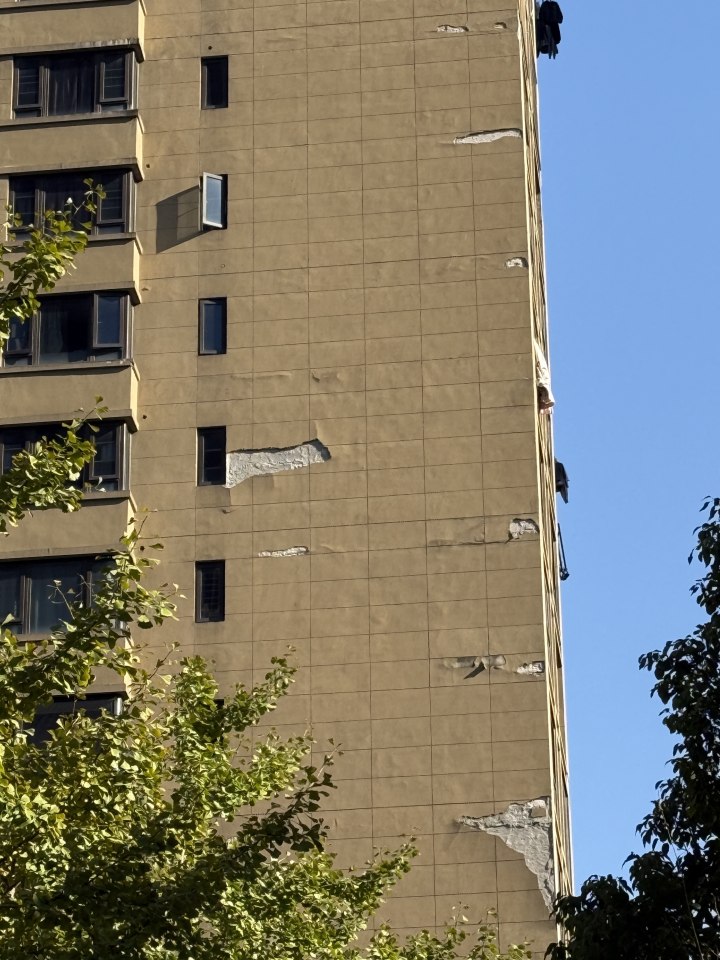 昨天下午,橙柿直通车记者在香悦郡国际公寓看到,小区为高层楼房,个别楼幢出现了大面积脱落,露出白色墙体。小区一位大伯告诉记者,前两天在1幢附近听到很大一块外立面从高空掉落的声音,“吓了一跳”。