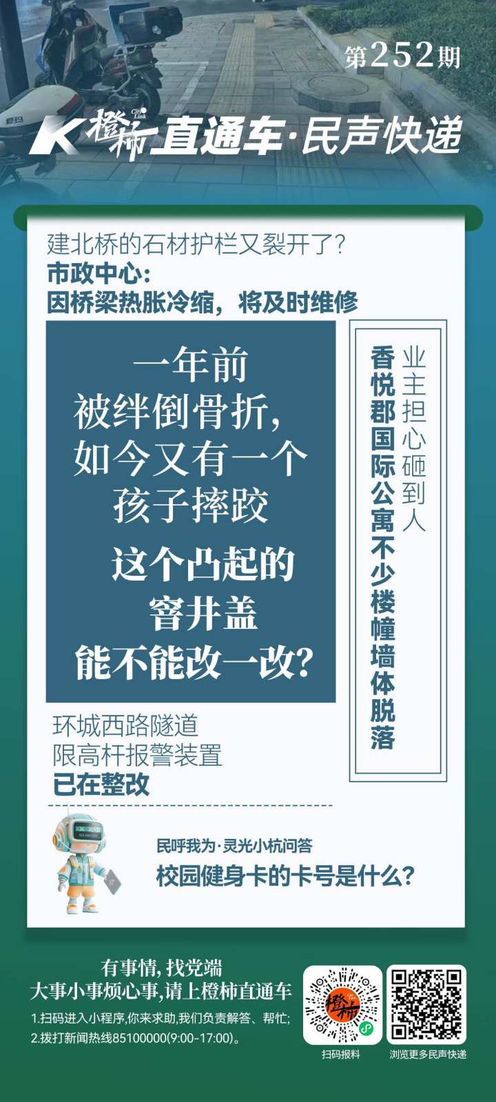 “前两天我们又路过了这段路,发现这块窨井盖还在这里,也没有贴上反光条。”橙友告诉记者,当时有一个小朋友,也因这块窨井盖被绊倒,“既然出了事情,我们也希望这个安全隐患能被消除掉,最好可以去掉这块凸起,或者是增加一些提醒”。