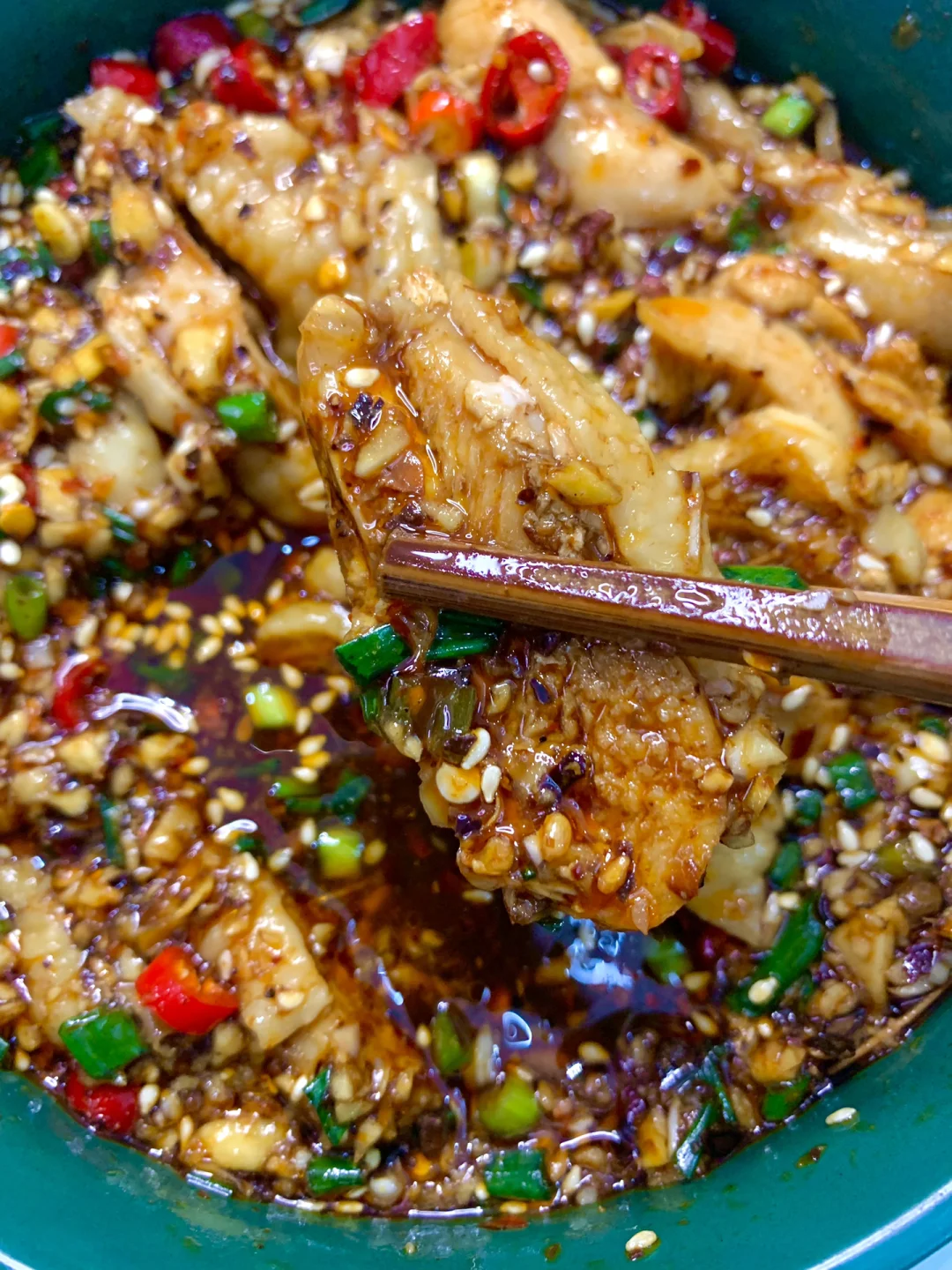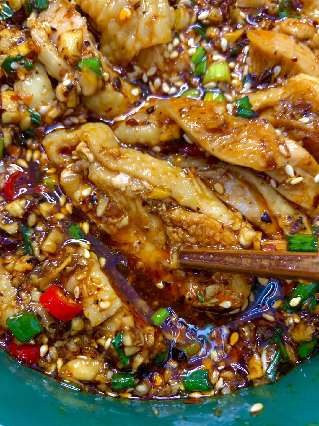 口水鸡这样做真的绝了[色色R][色色R]麻辣鲜香超级过瘾,鸡肉一点也不柴!!一定要多煮几个鸡腿,我两个鸡腿不够吃! 食材:鸡腿、蒜、姜、葱花、小米辣 做法: 1⃣️鸡腿去骨,冷水下锅加大葱、姜片、料酒,水开煮15分钟左右,捞出过凉水,切成小块 2⃣️调料汁:少许姜末加两勺水调成姜水、蒜末、2勺生抽、2勺醋、一勺老抽、一勺白芝麻、一小勺鸡精、一小勺白糖、小半勺盐、、两勺辣椒油、小半碗煮鸡汤的水、葱花、小米辣搅拌均匀 3⃣️把料汁浇在鸡块上即可