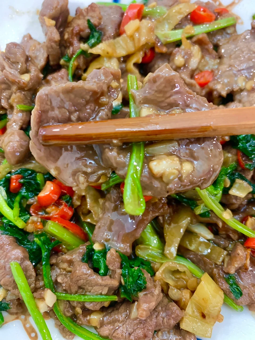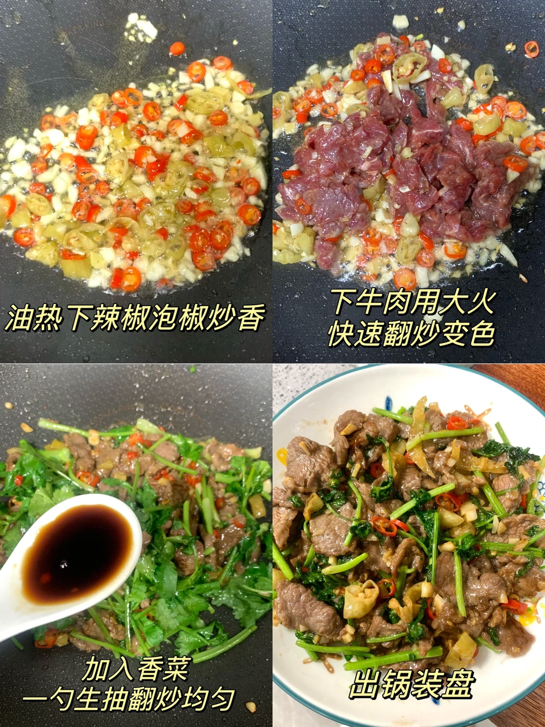 [彩虹R][彩虹R]这个配方做出来的牛肉一点也不柴,做法超级简单!吃过一次就忘不了的那种~ 食材:牛肉、小米辣、泡椒、姜、蒜 1⃣️牛肉逆着纹路切成薄片,加一勺生抽、一勺蚝油、一点点盐、适量胡椒粉、一勺淀粉搅拌均匀,再加入一勺食用油锁住水分腌制10分钟 2⃣️锅里烧油,油热下姜蒜末、泡椒小米辣炒香,下入牛肉大火快速炒至变色,加入香菜、一勺生抽翻炒均匀出锅即可