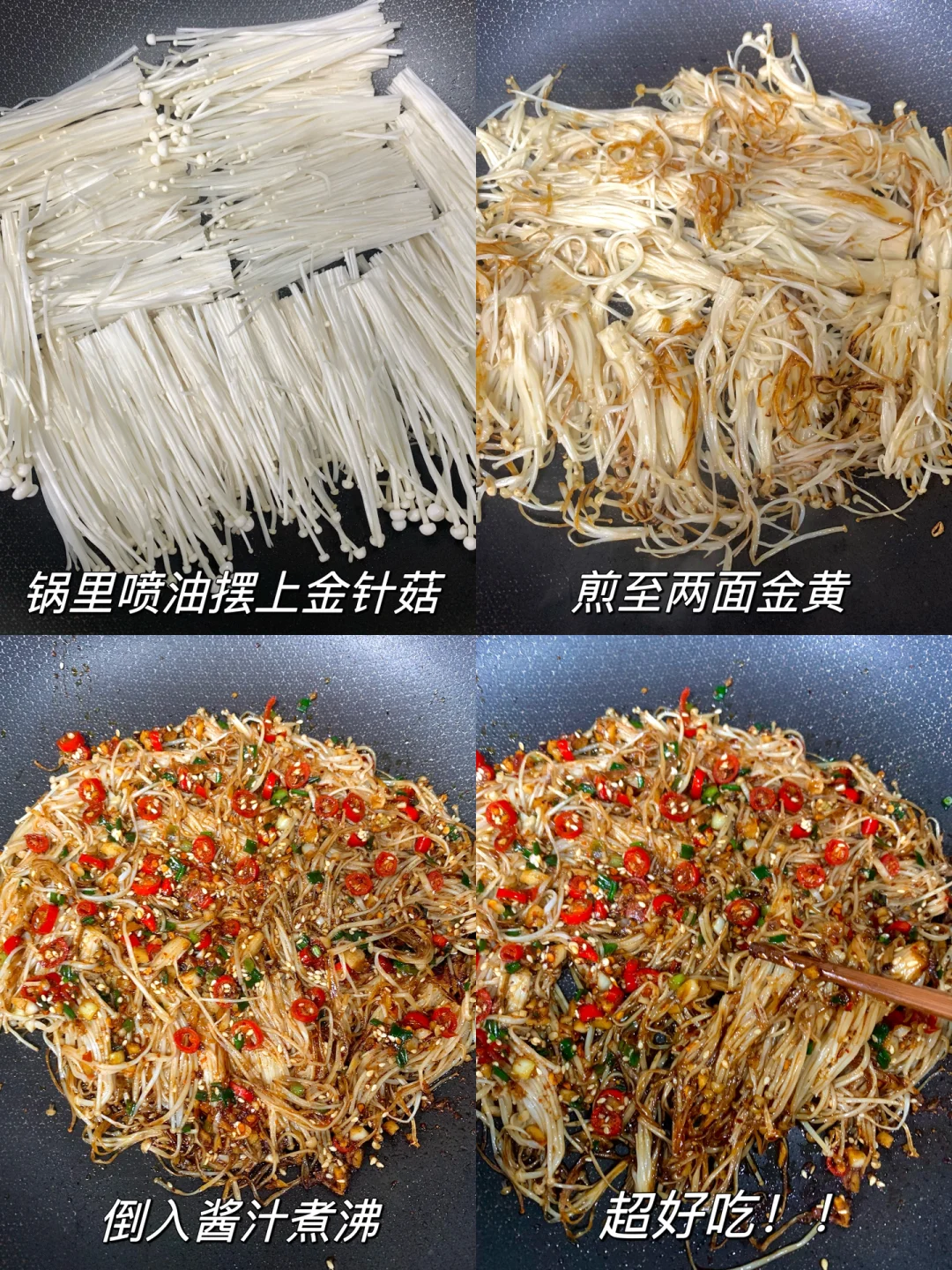 我劝你们真的要试一试这个做法,真的太香了[色色R][色色R]这个料汁做出来真的比路边摊好吃!香辣味十足!馋了就先保存哦[扯脸H][扯脸H] 食材:金针菇、小米辣、蒜末、葱花、白芝麻、烧烤料、辣椒面 做法: 1⃣️调料汁:盘中放入葱花、蒜末、小米辣、白芝麻、烧烤料、辣椒面,淋入热油激发出香气,加入三勺生抽、一勺蚝油、小半勺白糖搅匀备用 2⃣️锅中喷油,摆上金针菇,开火煎至两面金黄,倒入酱汁煮沸即可出锅
