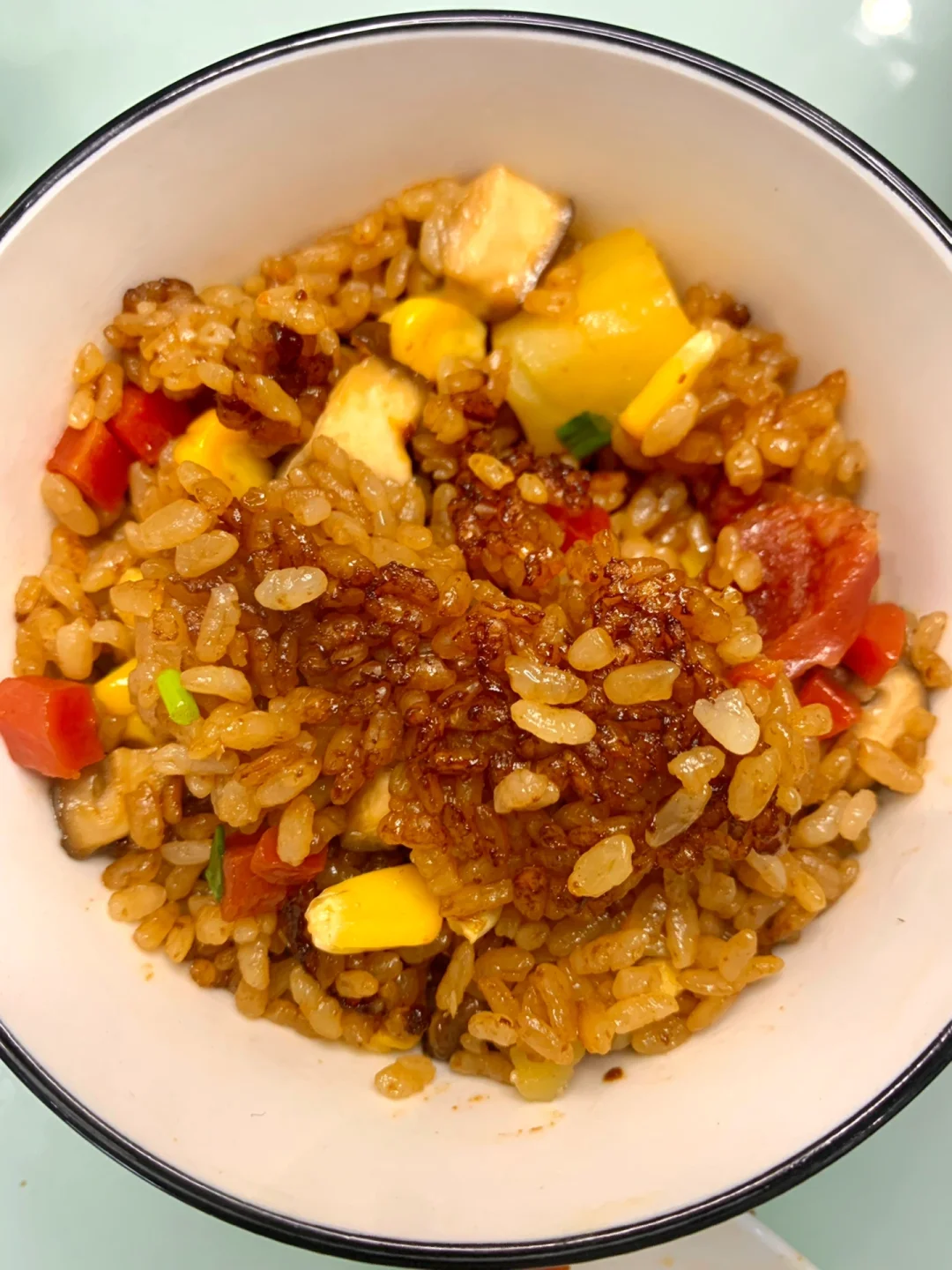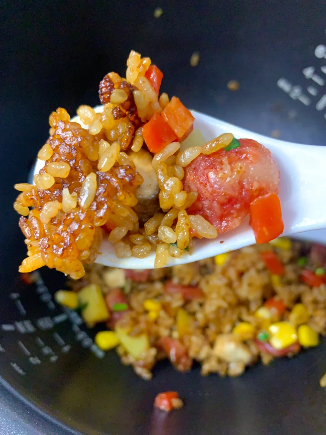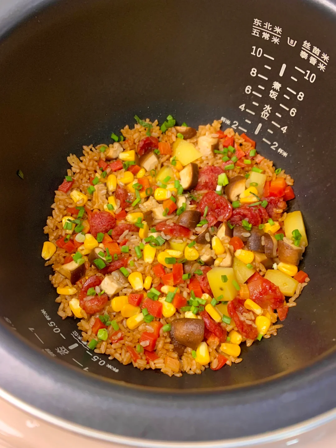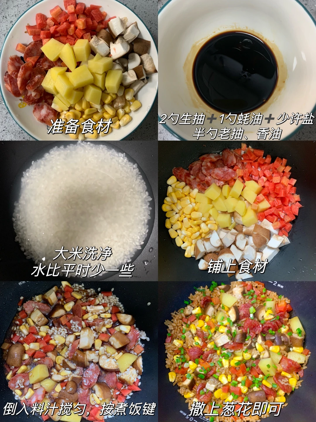 这个腊肠土豆焖饭真的巨巨巨好吃[色色R][色色R]水不要放多了,煮出焦焦的锅巴太香啦~超简单快捷,来上一碗超级满足[派对R] 食材:大米、土豆、腊肠、胡萝卜、玉米粒、香菇、葱花 做法: 1⃣️调个料汁:2勺生抽➕一勺蚝油➕半勺老抽➕半勺香油➕少许盐 2⃣️电饭锅中大米洗净,水比平时少一些,铺上食材,倒入料汁搅拌均匀,按煮饭键,煮好后撒上葱花即可 [彩虹R][彩虹R]这道懒人腊肠焖饭真的香迷糊了[色色R]姐妹们一定要试试~