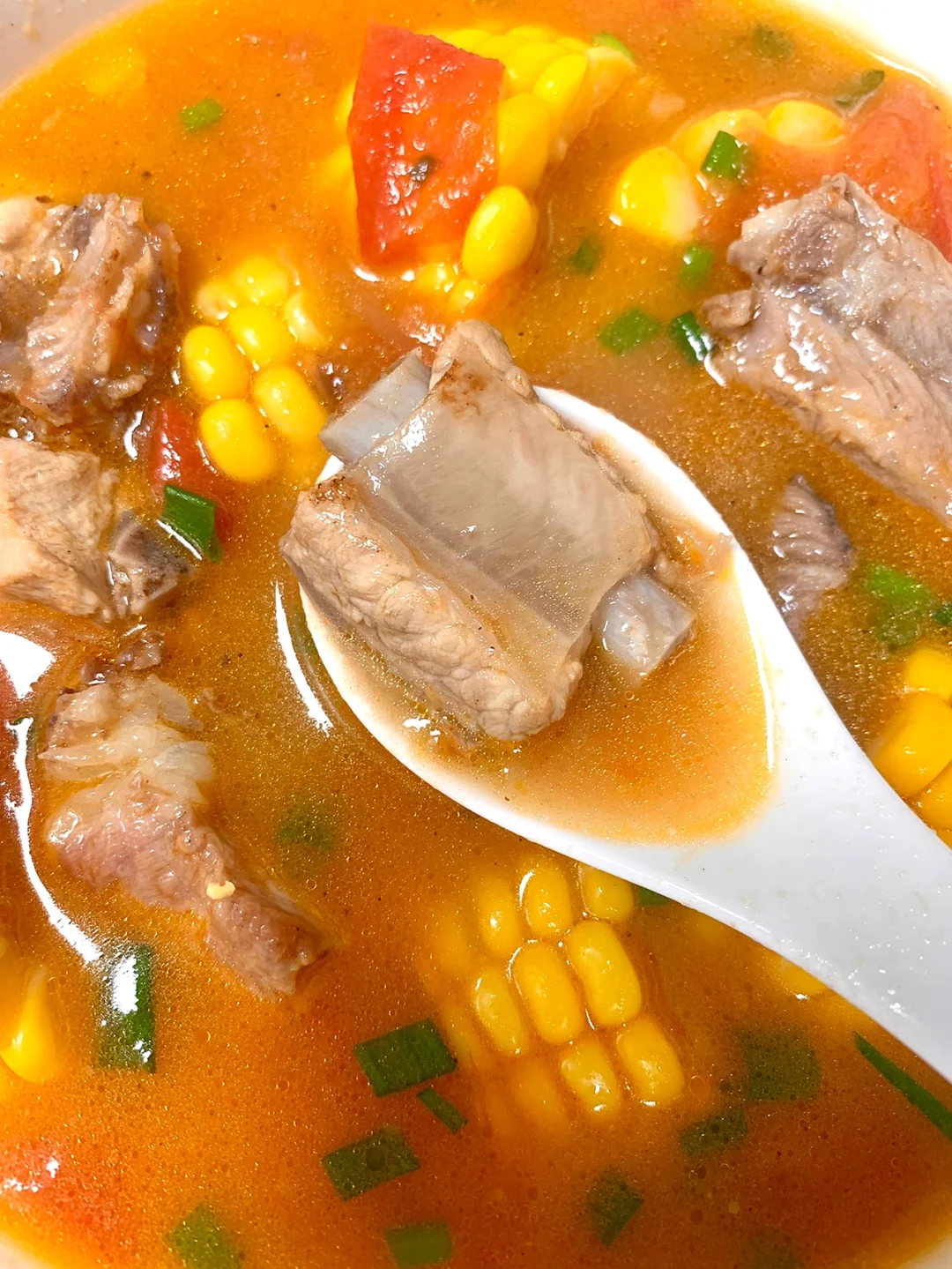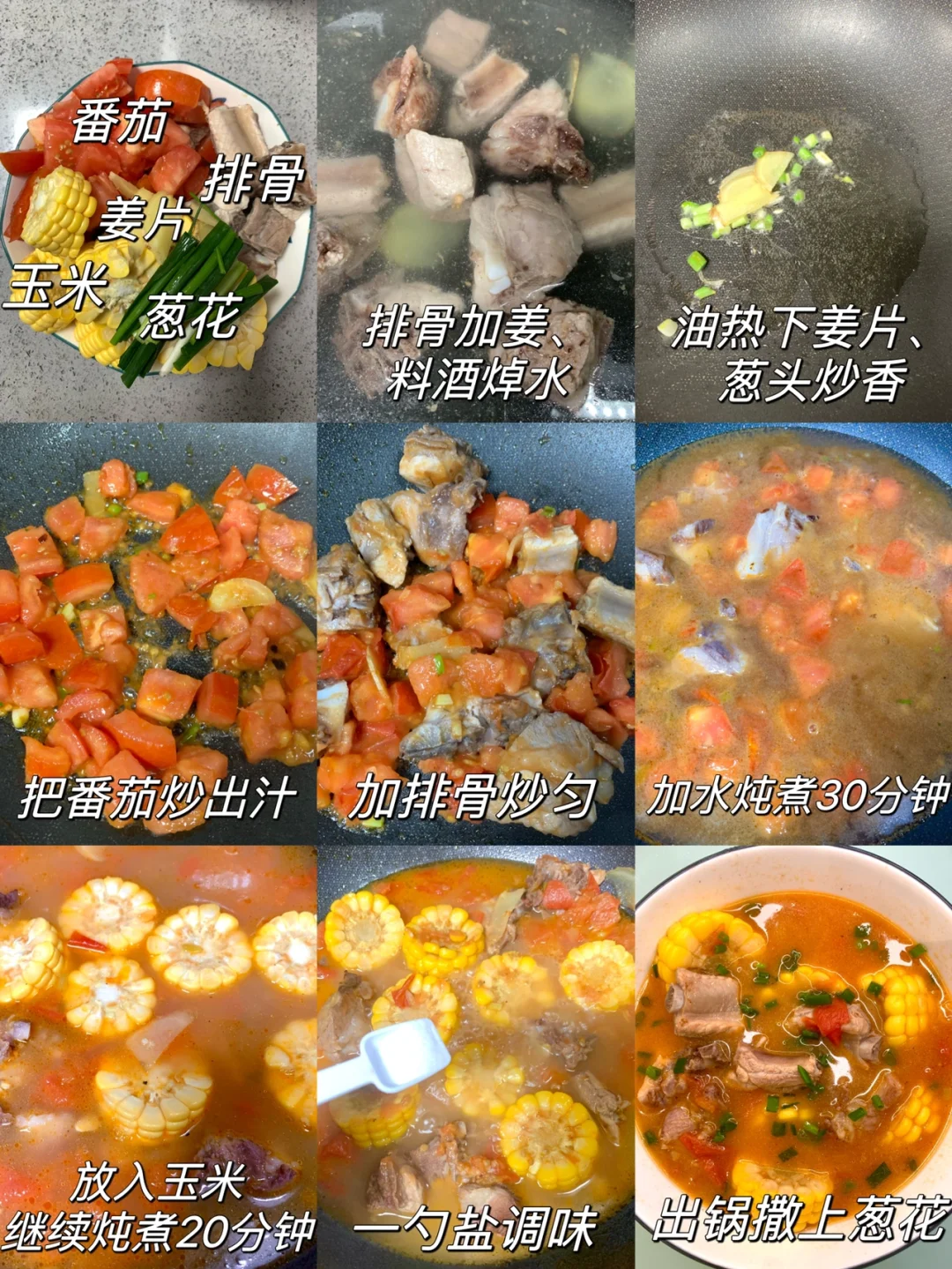 天气越来越冷了,来一锅热气腾腾的番茄玉米排骨汤暖暖身子吧~只用加一勺盐,眉毛都快鲜掉啦[派对R]我一个人能喝一锅谁懂!! 食材:排骨、番茄、玉米、小葱、姜片 1⃣️排骨洗净,冷水下锅加姜片、料酒去腥,捞出后清洗干净 2⃣️锅内烧油,油热下姜片、葱头炒香,加入番茄炒出汁 3⃣️倒入排骨炒匀,加水没过食材炖煮30分钟,再倒入玉米炖煮20分钟,加一勺盐调味即可