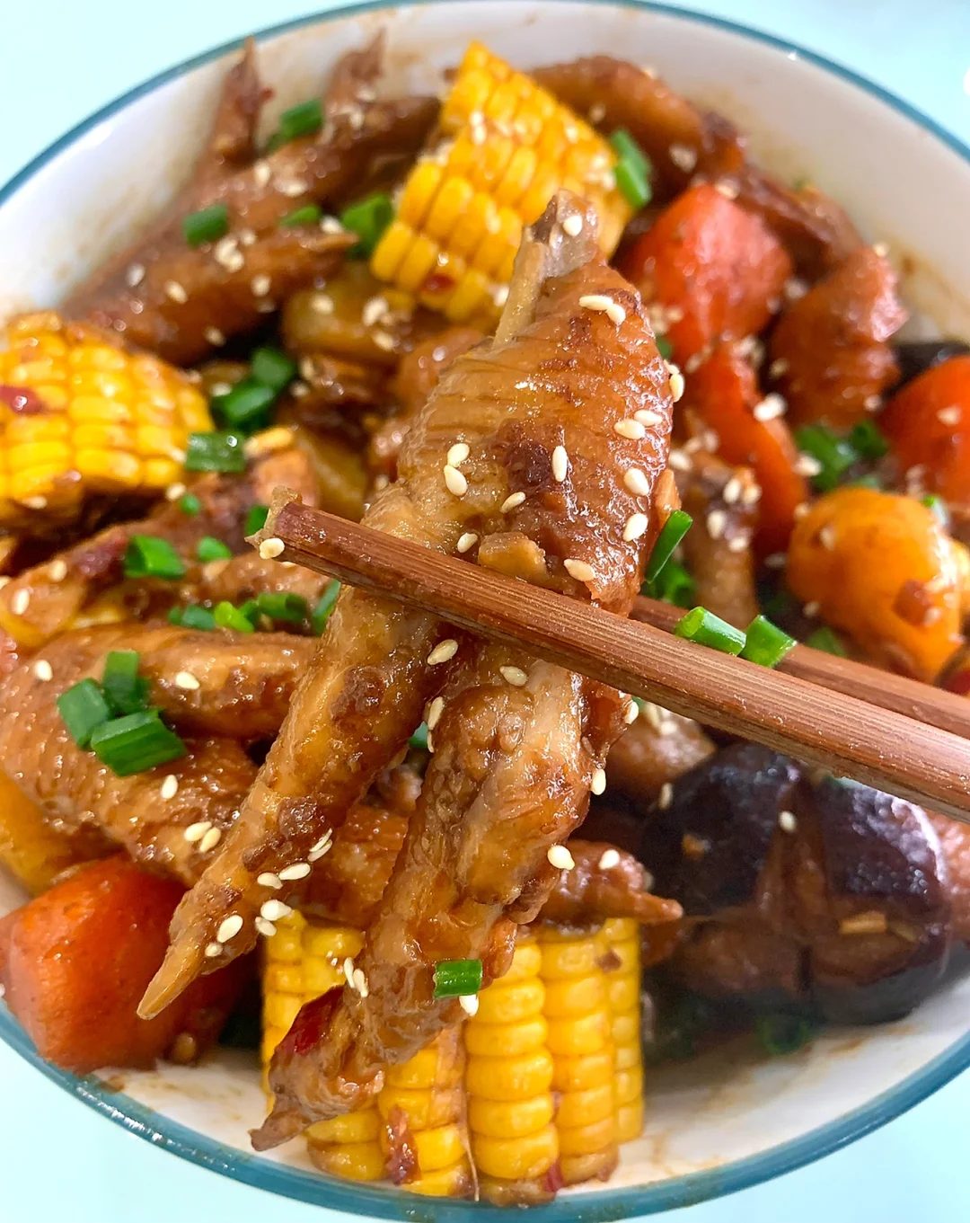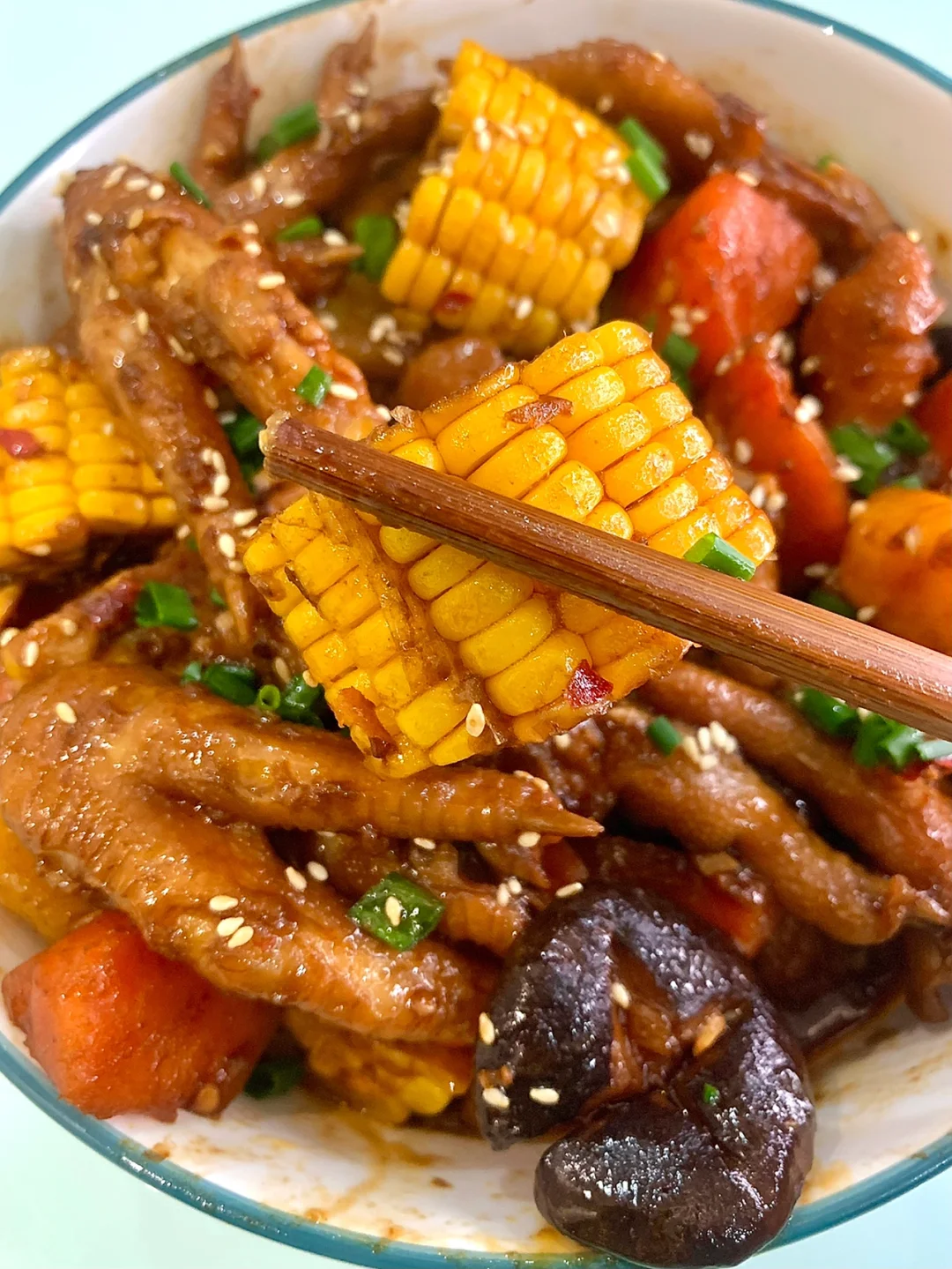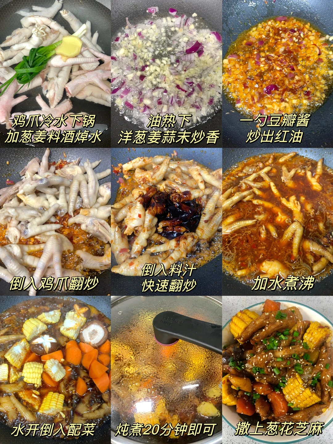 鸡爪煲这么做比饭店的还好吃😋汤汁用来泡饭真的太绝了!!!做法非常简单 [彩虹R][彩虹R]食材:鸡爪、土豆、胡萝卜、玉米、香菇、洋葱、葱、姜、蒜 调个料汁:盐和鸡精少许、3勺生抽、一勺老抽、一勺蚝油、一勺黄豆酱、一勺甜面酱搅拌均匀备用 1⃣️鸡爪冷水下锅,加葱姜料酒焯水捞出,油热下洋葱姜蒜末炒香,加一勺豆瓣酱炒出红油,倒入鸡爪翻炒,倒入料汁快速翻炒 2⃣️加水没过鸡爪,水开下入配菜,盖盖炖煮20分钟,大火收汁即可,出锅撒上葱花芝麻