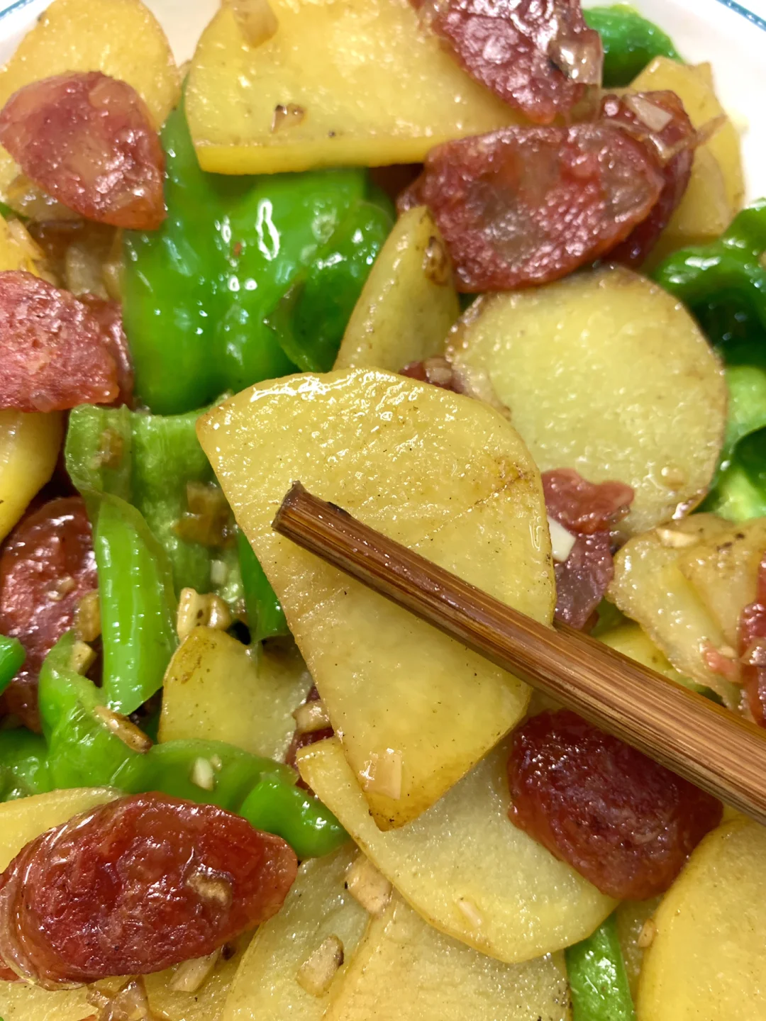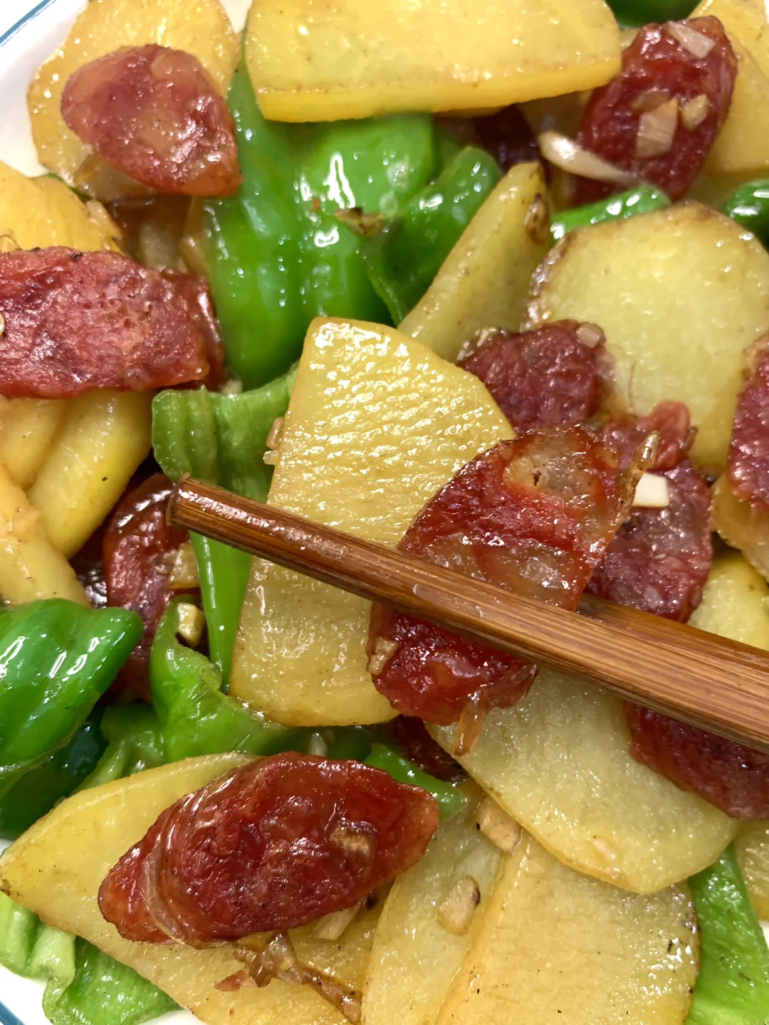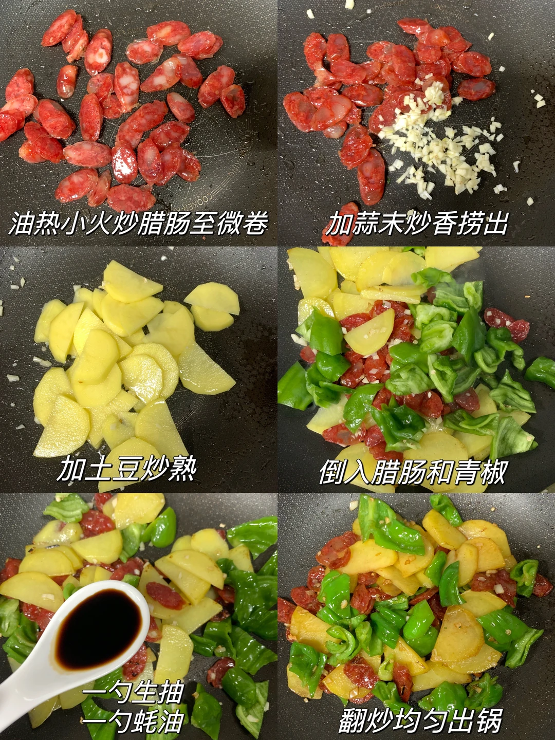 超简单的食材和做法,没想到做出来这么好吃😆😆属于上班族一定要学的十分钟快手菜啦[色色R] 食材:腊肠、土豆、青椒、蒜 做法: 1⃣️腊肠、土豆切片,青椒切小块,油热小火炒腊肠,炒至腊肠微微卷起,加蒜末炒香捞出 2⃣️用余油把土豆炒熟,倒入腊肠和青椒翻炒,加一勺生抽、一勺蚝油翻炒均匀即可