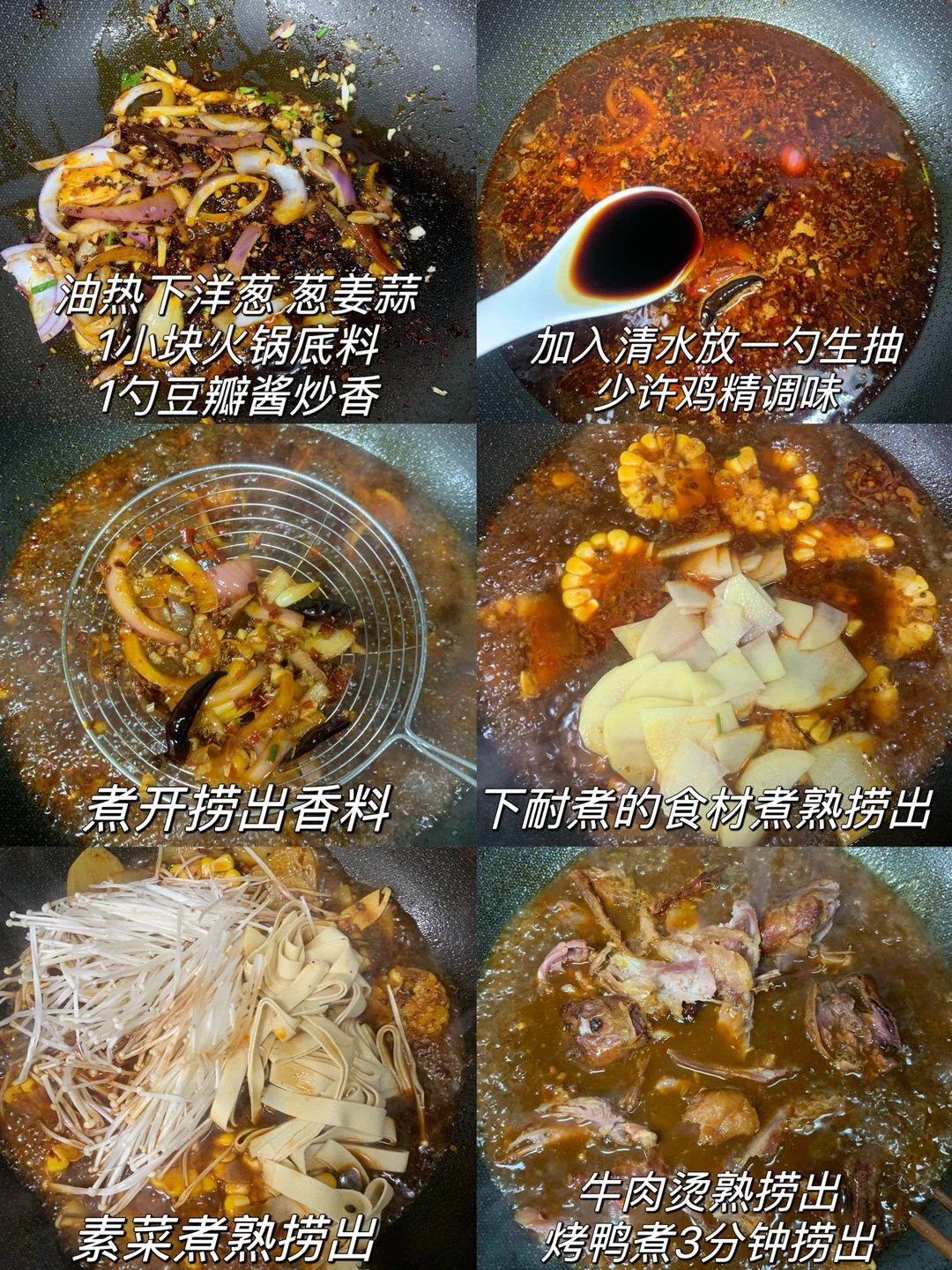 4⃣️下难熟的配菜煮熟捞出放碗底,再依次下青菜和牛肉烫熟,烤鸭煮3分钟捞出,倒入一半的汤底