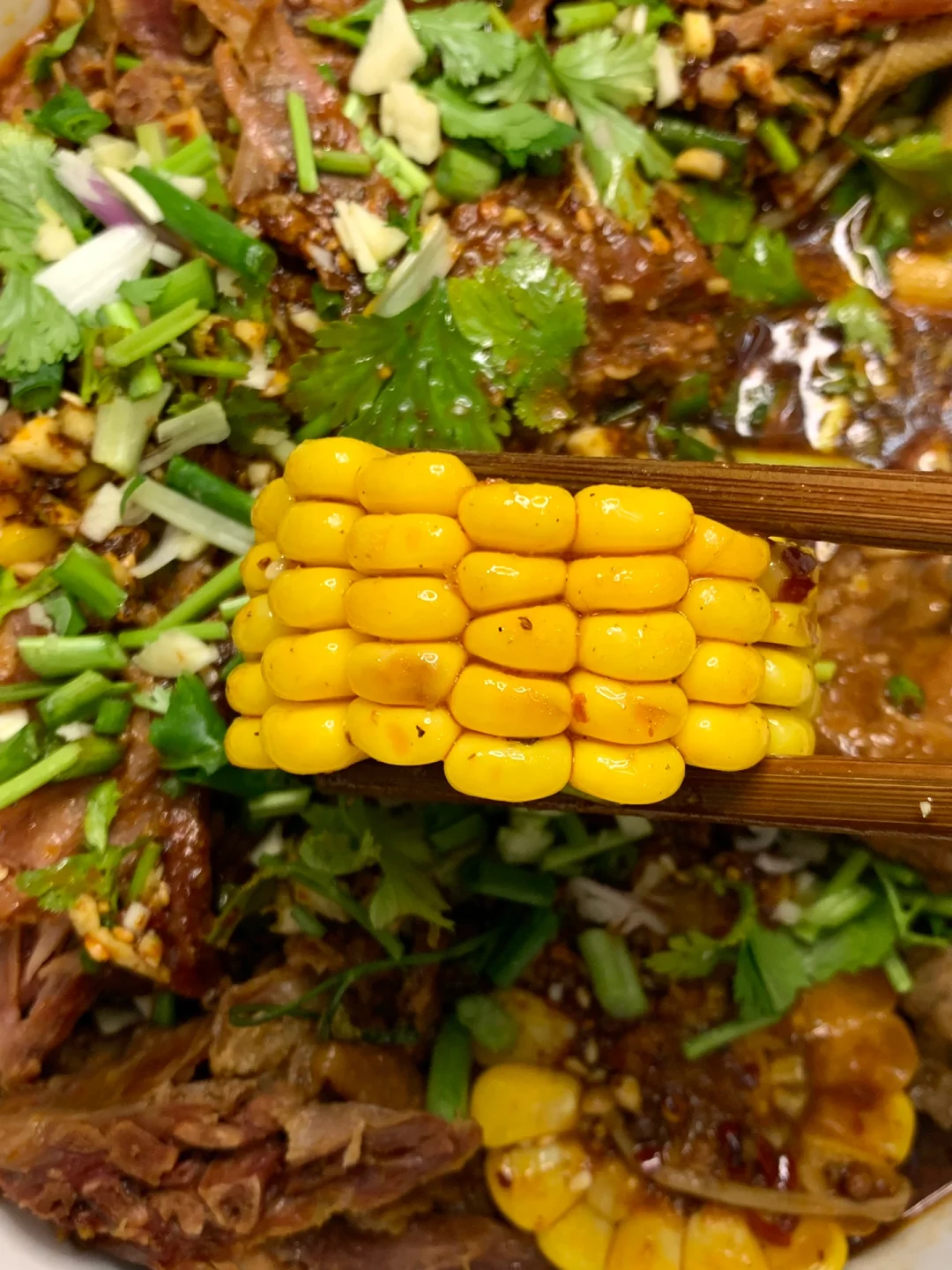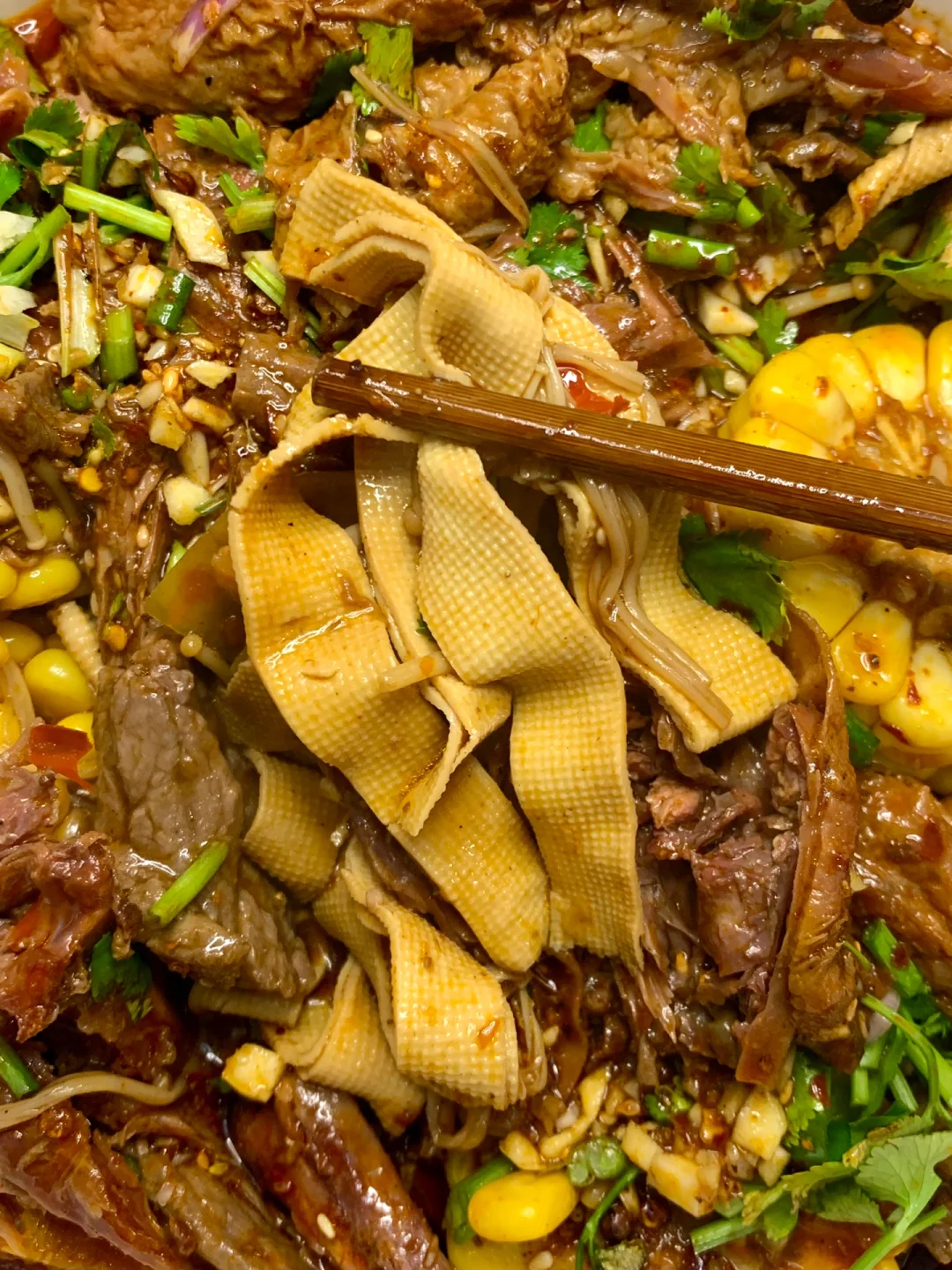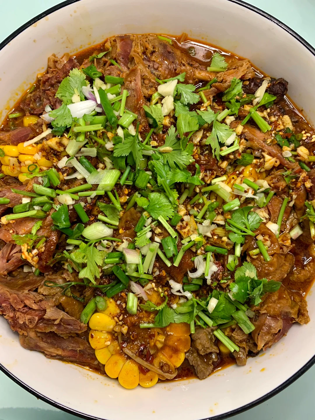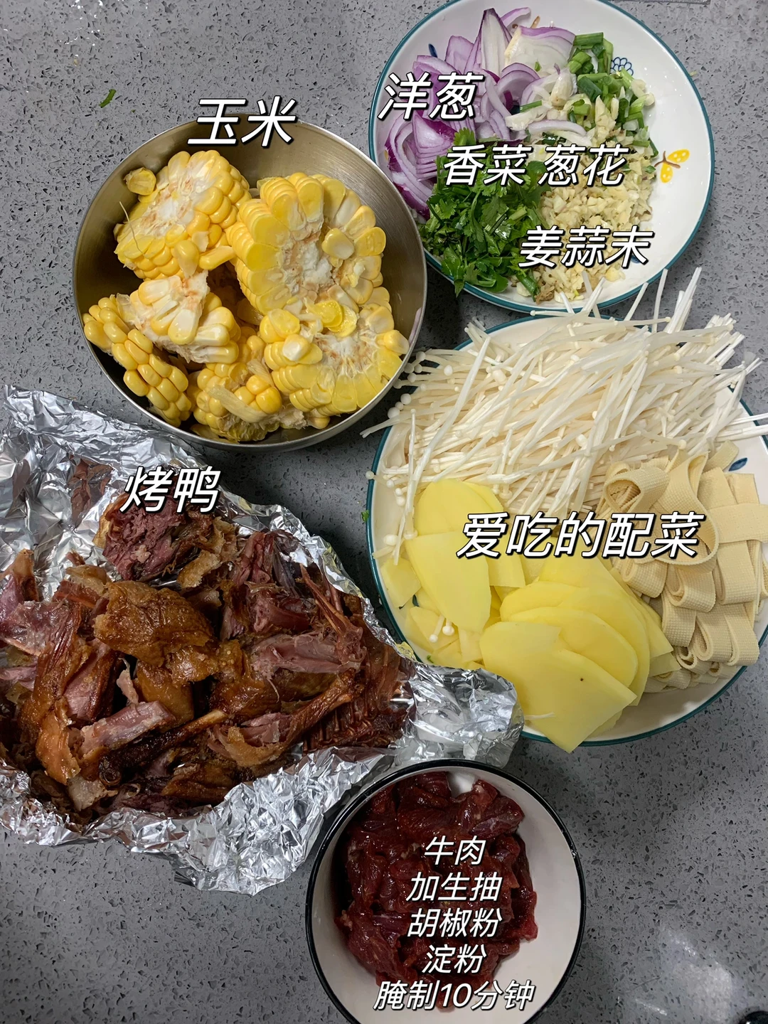 烤鸭半只、牛肉、玉米、豆皮(自己爱吃的配菜都可以)、火锅底料一小块、葱末、蒜末、姜末、香菜末、洋葱