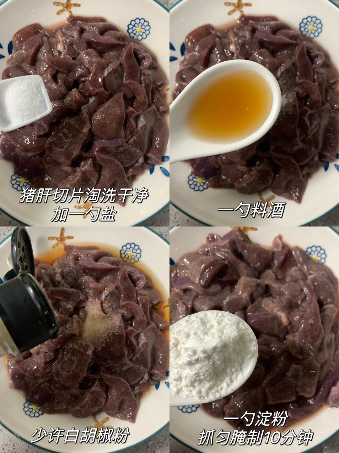 1⃣️猪肝切片淘洗干净,加一勺盐、一勺料酒、少许胡椒粉、一勺玉米淀粉抓匀腌制10分钟