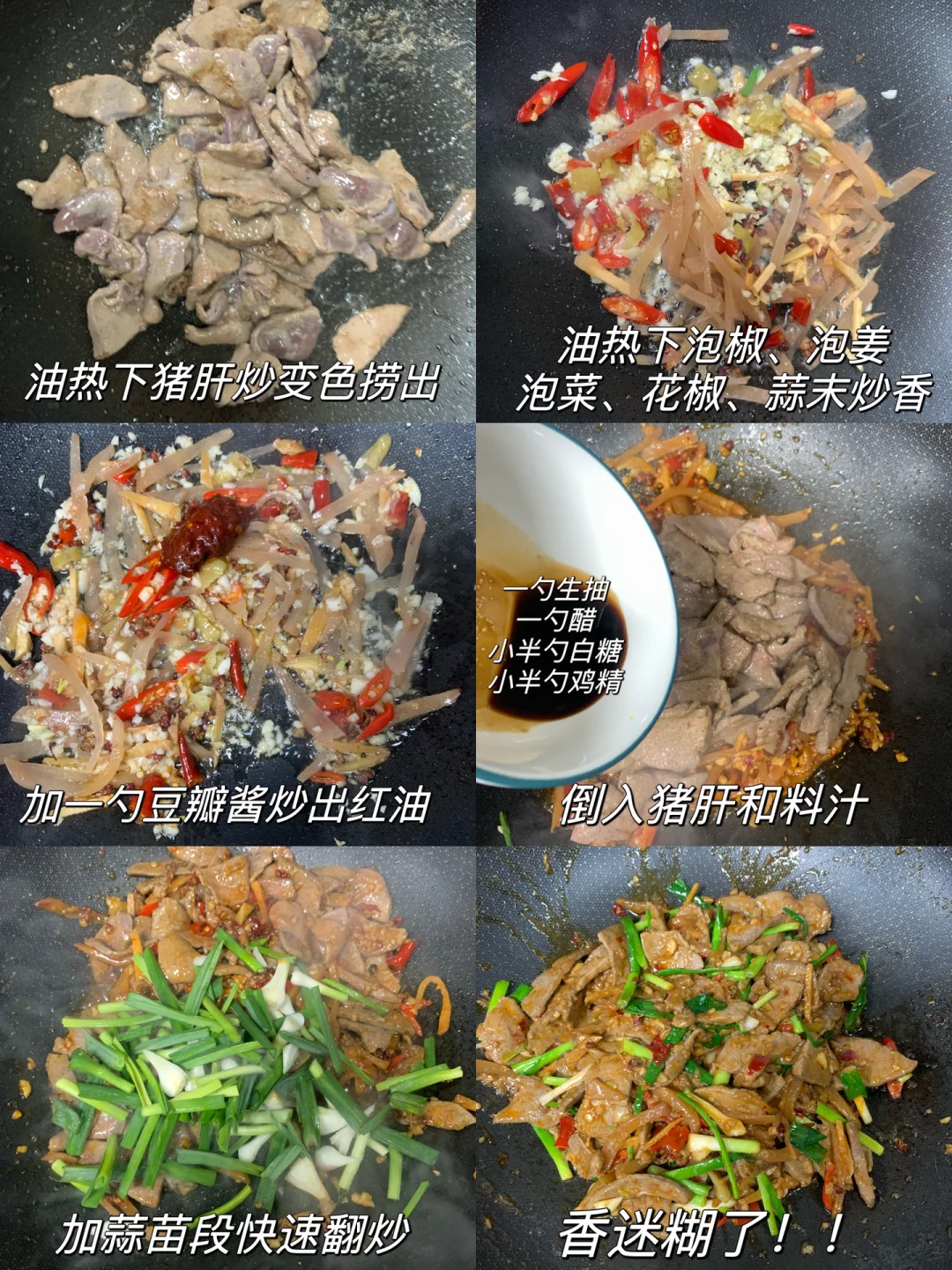 食材:猪肝半斤、泡椒、泡姜、泡菜、蒜末、花椒、蒜苗