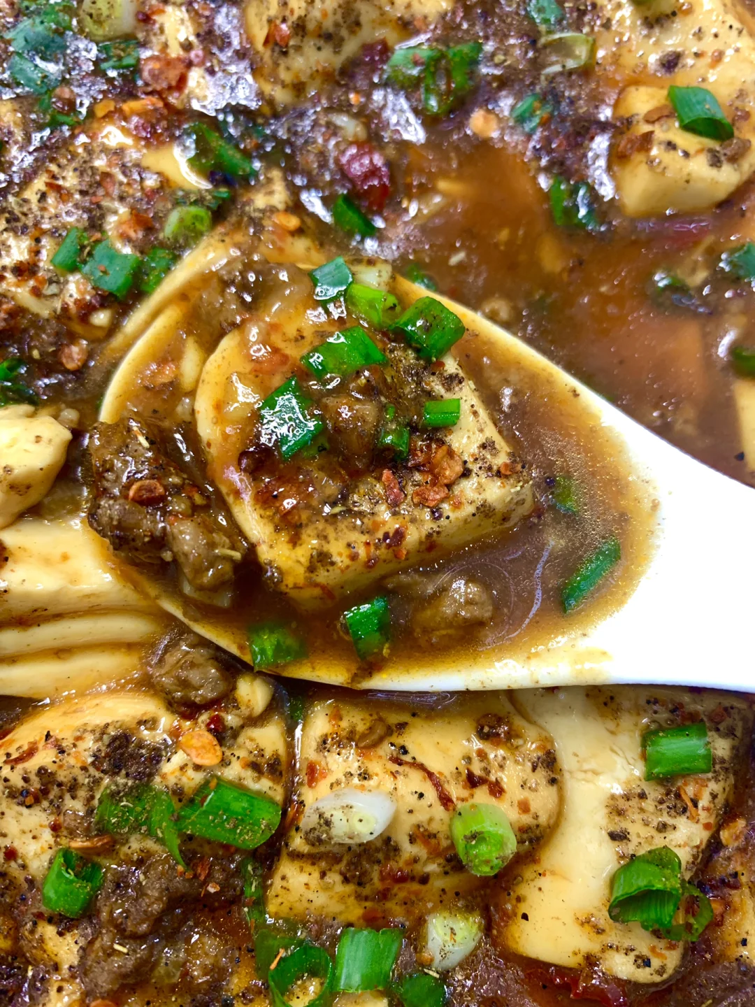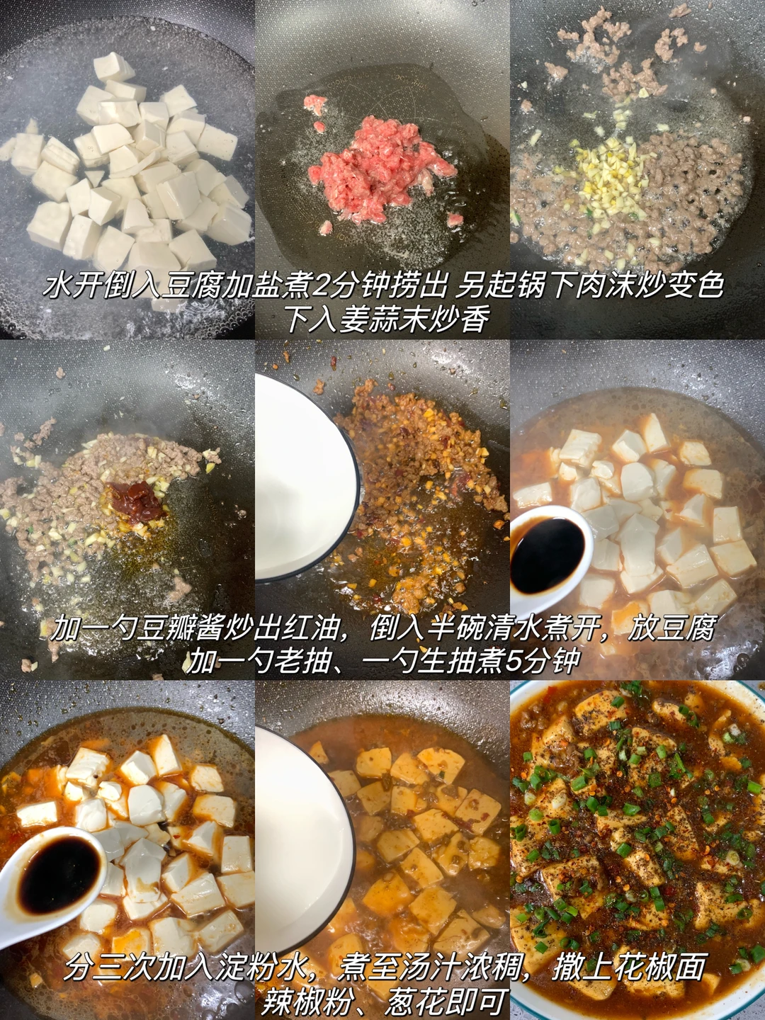 麻婆豆腐这么做好吃到流泪😭麻辣鲜香,超级入味,泡着汤汁连干了两碗米饭[色色R][色色R]看一遍就会的做法,一定要试试 食材:豆腐、肉沫、蒜末、姜末、葱花 做法: 1⃣️豆腐切小块,水开加盐煮两分钟捞出 2⃣️油热下肉沫炒至变色,加入姜蒜末炒香,一勺豆瓣酱炒出红油,加半碗清水煮开 3⃣️倒入豆腐,加一勺生抽、一勺老抽煮5分钟,分三次加入半碗淀粉水,煮至汤汁浓稠,出锅撒上花椒面、辣椒粉和葱花即可