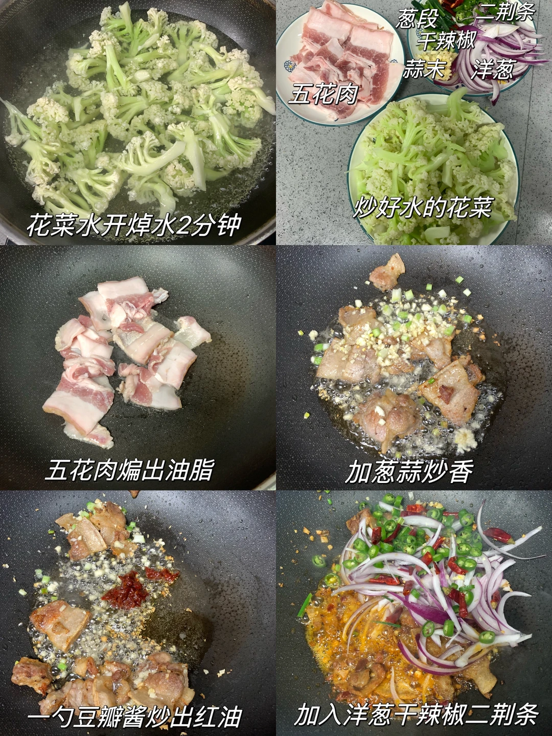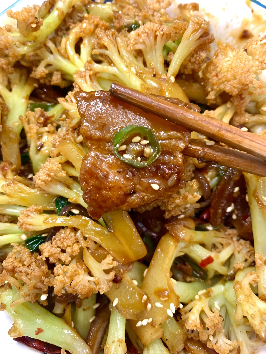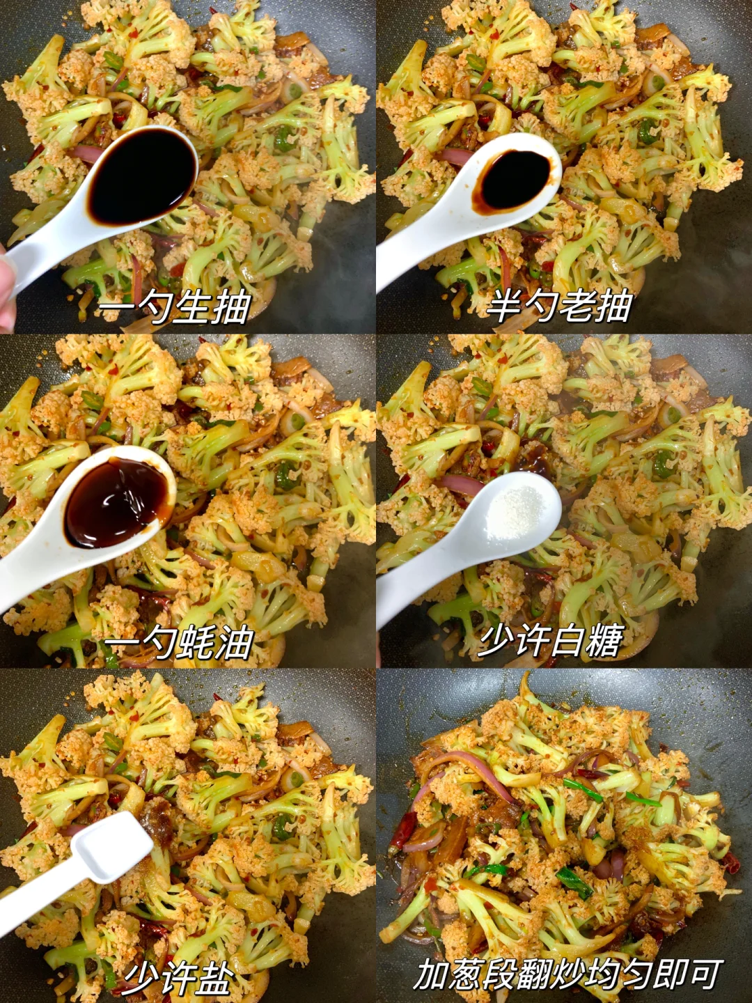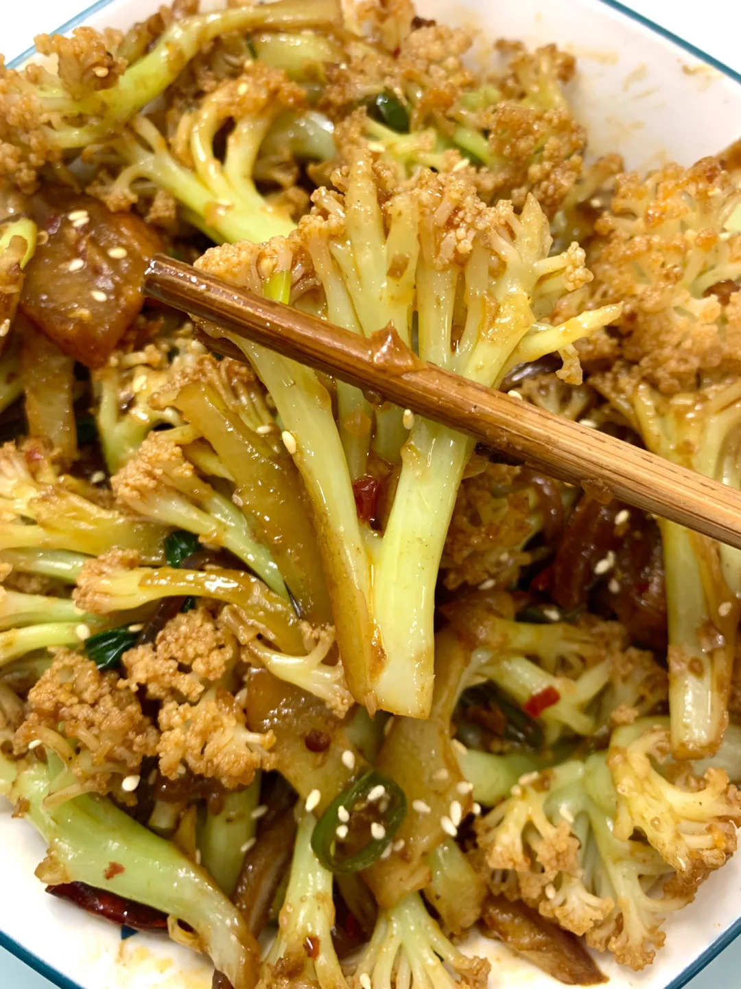 干锅花菜这样做太好吃了吧!!下饭菜中的天花板[赞R][赞R]花菜根根爽脆入味,做法也很简单哦,家人们学起来[派对R] 食材:花菜、五花肉、二荆条、葱花、葱段、干辣椒、洋葱、蒜末 做法: 1⃣️花菜切小块,水开焯水两分钟捞出备用 2⃣️锅中加少许油下五花肉煸出油脂,加葱蒜炒香,加一勺豆瓣酱炒出红油,再加入洋葱、二荆条和干辣椒炒匀 3⃣️倒入花菜翻炒,加入一勺生抽、半勺老抽、一勺蚝油、少许白糖和盐翻炒入味,加入葱段炒匀即可