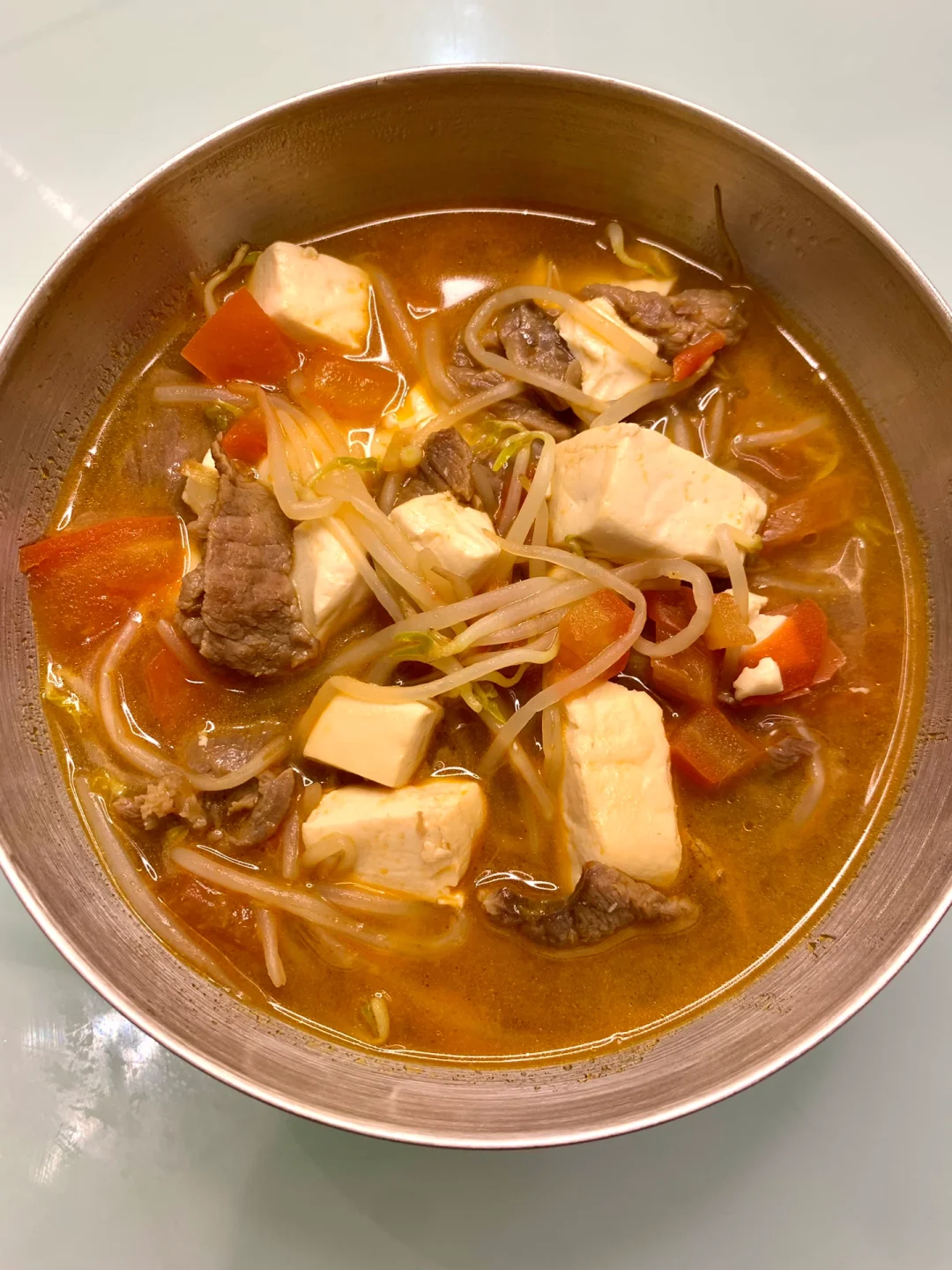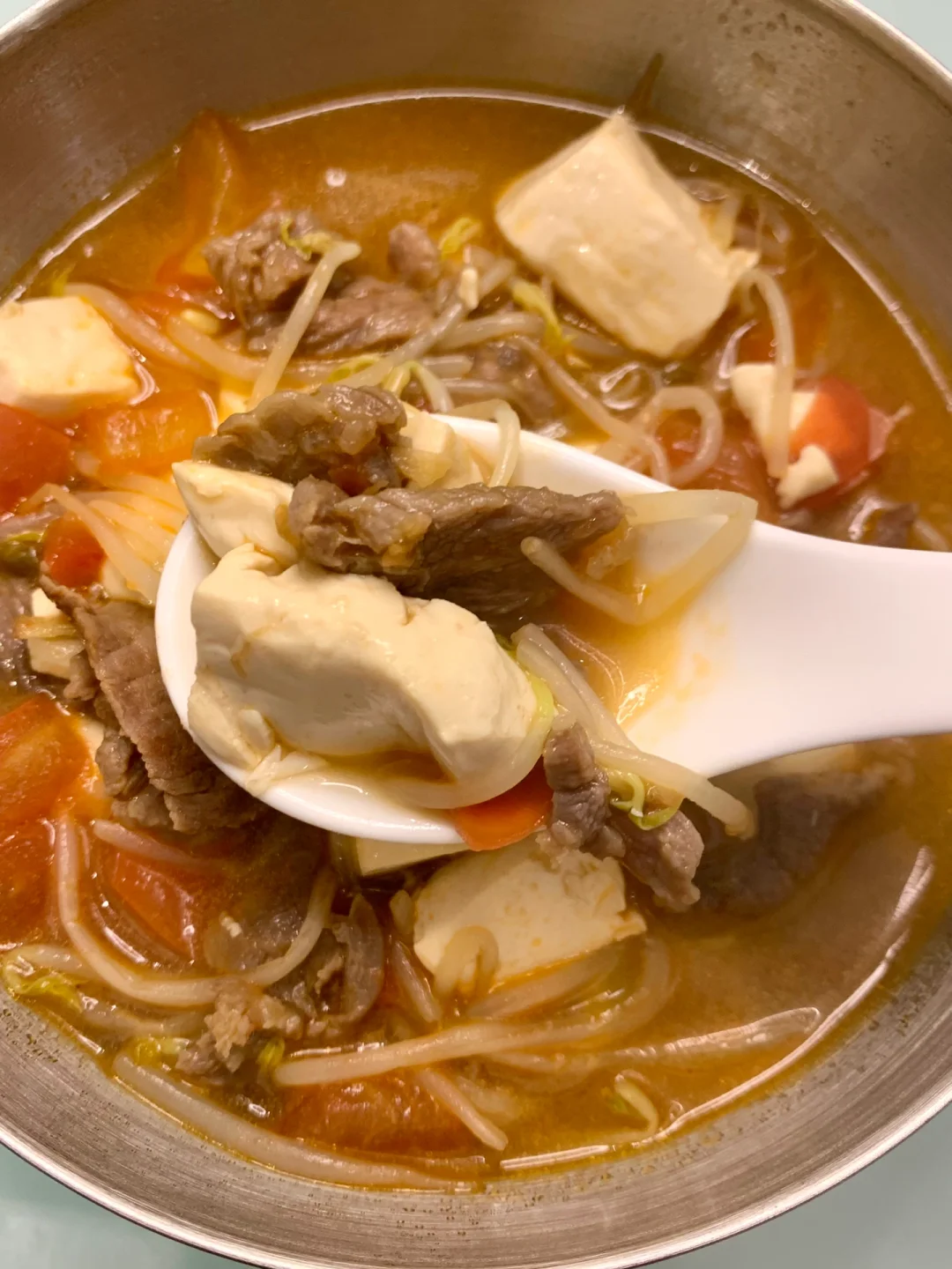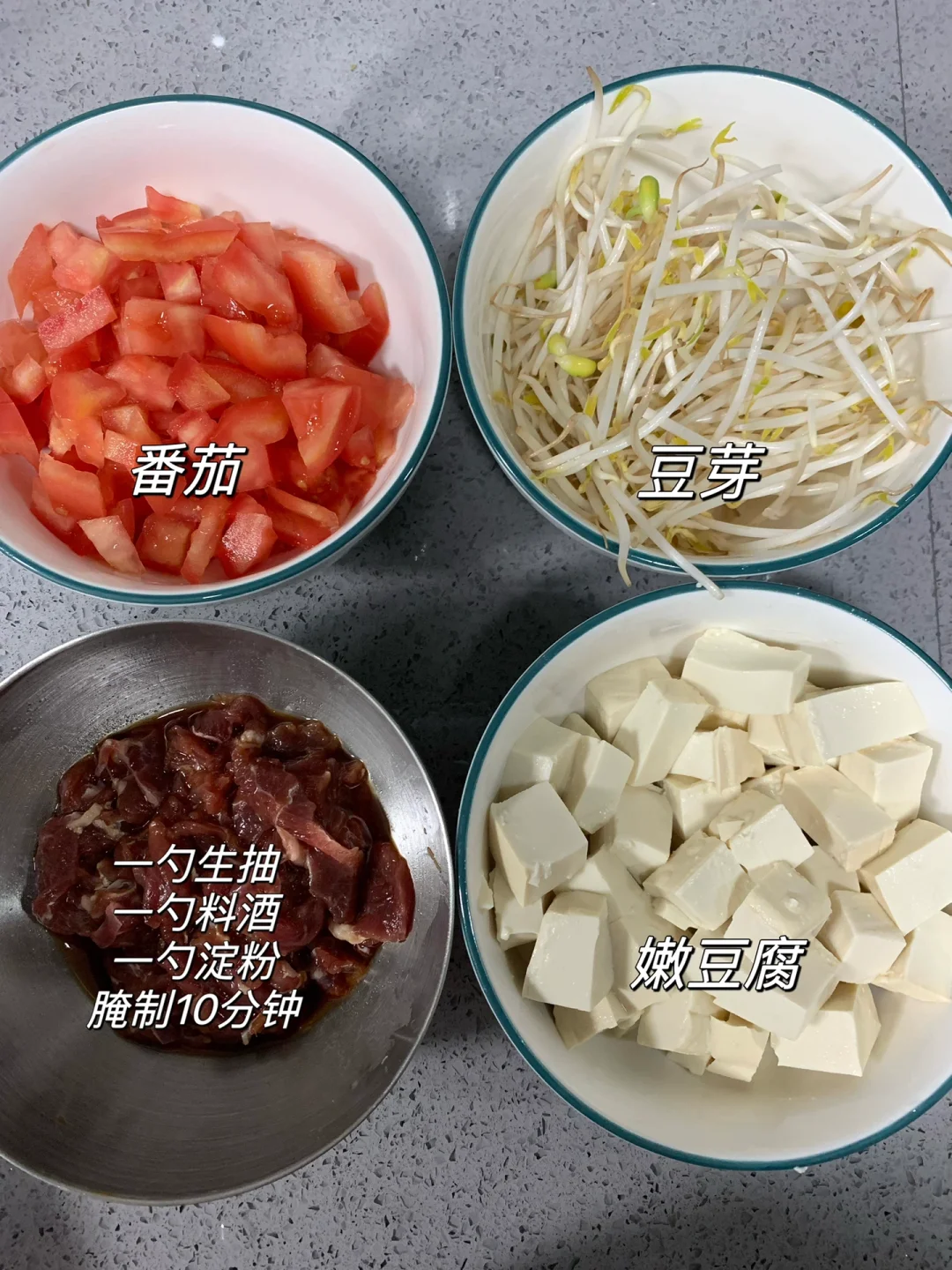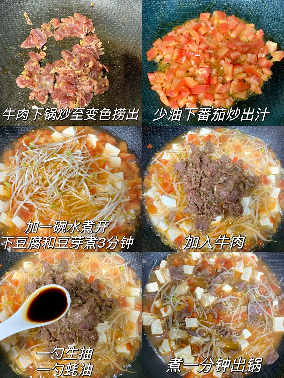 想要饱腹感又怕长胖的姐妹们,试试这道番茄牛肉豆芽豆腐汤(名字有点hhhhh),蔬菜蛋白质都有,很适合当作主食来吃!! 食材:牛肉、豆腐、番茄、豆芽 做法: 1⃣️牛肉洗净沥干水分,加一勺生抽、一勺料酒、一勺淀粉搅拌均匀,腌制10分钟 2⃣️锅中少油下牛肉炒至变色捞出,下番茄炒出汁水,搭配一碗清水煮开 3⃣️加入豆芽和豆腐煮3分钟左右,加入牛肉,加一勺生抽、一勺蚝油煮1分钟即可