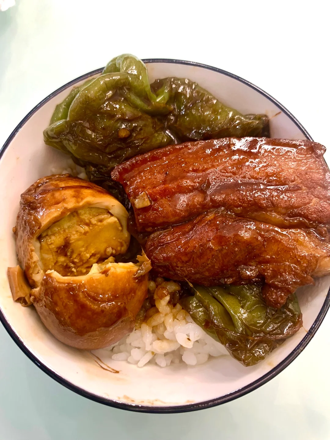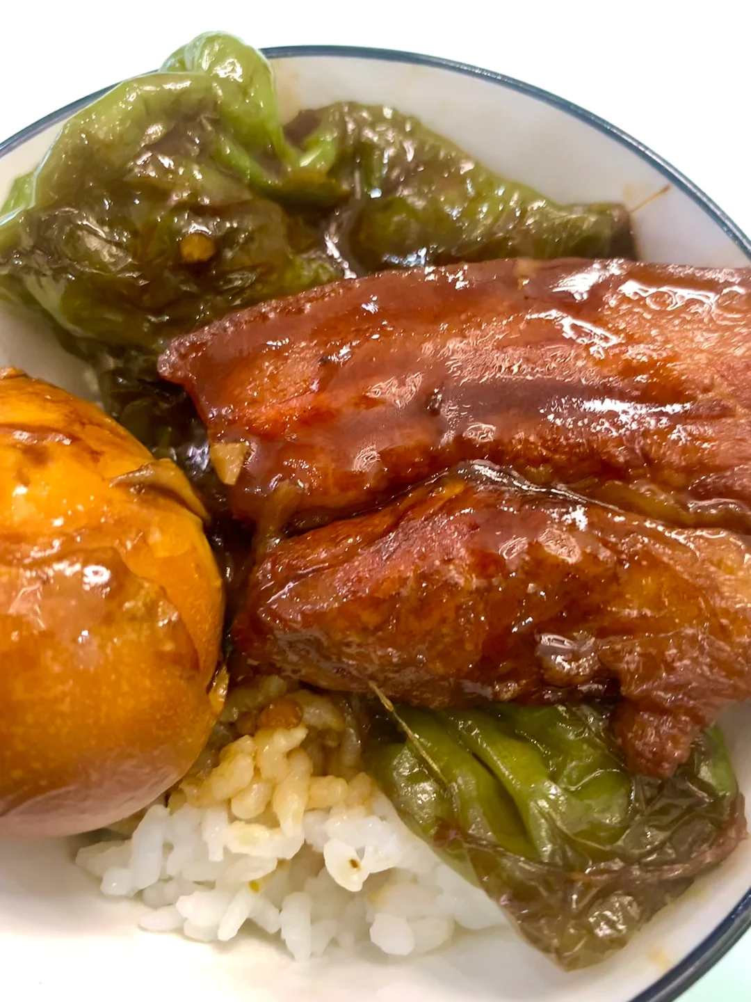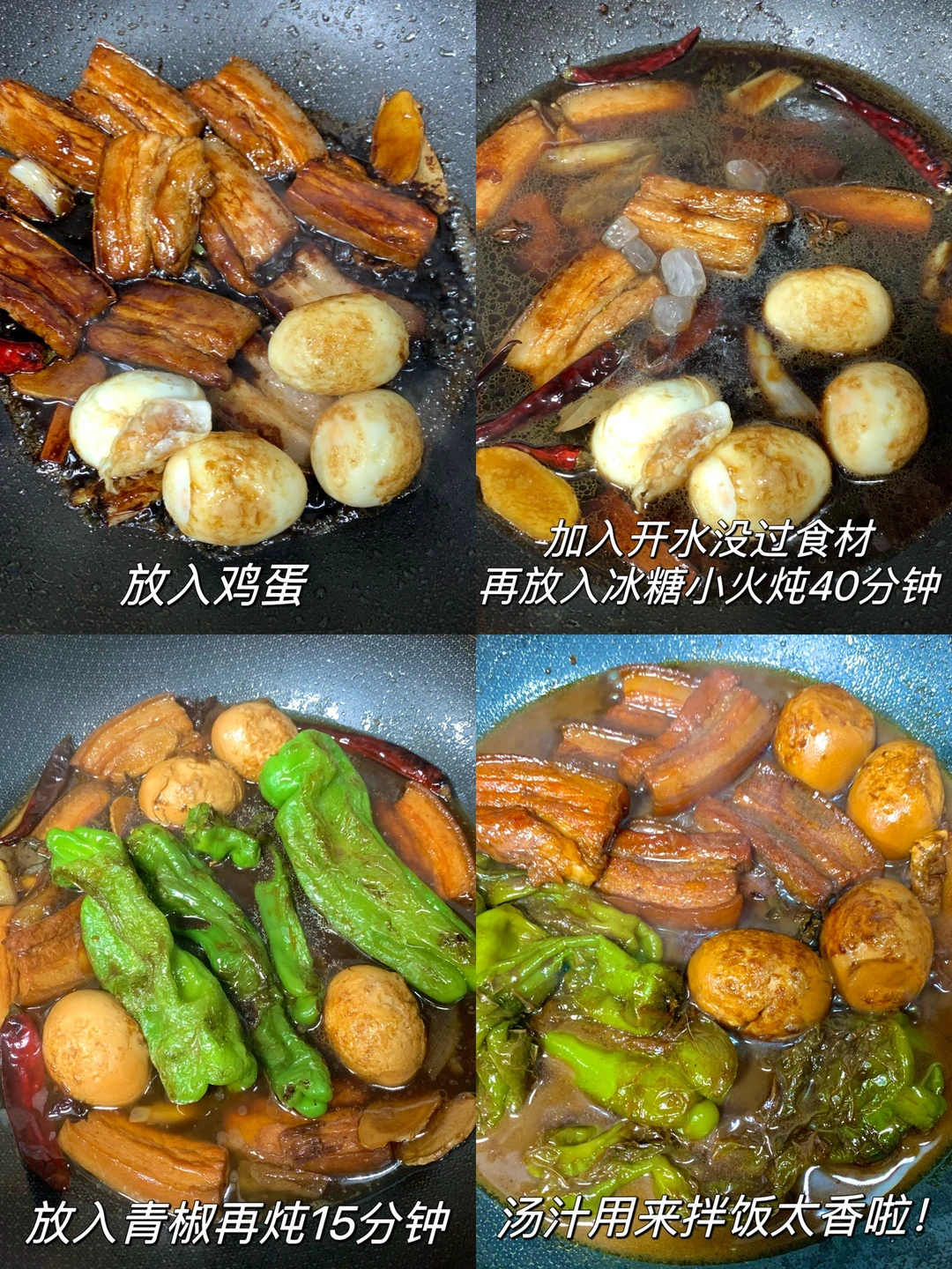 2⃣️锅留少许油,下入姜片、桂皮、八角、香叶、干辣椒、葱段炒香,再加入五花肉片和调好的料汁炒匀,加入鸡蛋,倒入开水没过食材,加几粒冰糖,小火炖40分钟,最后放入青椒再炖15分钟即可。