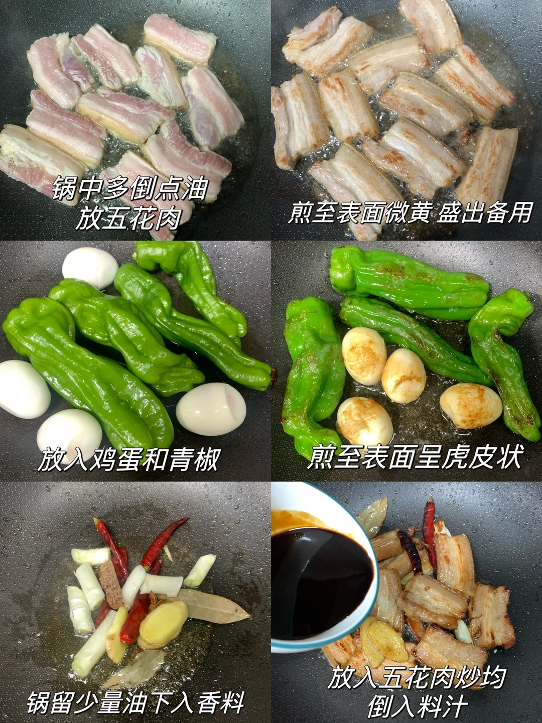 1⃣️五花肉洗净切成厚片,锅中多加一些油,把五花肉片煎成两面微微金黄捞出,接着把鸡蛋和青椒煎至虎皮状捞出。