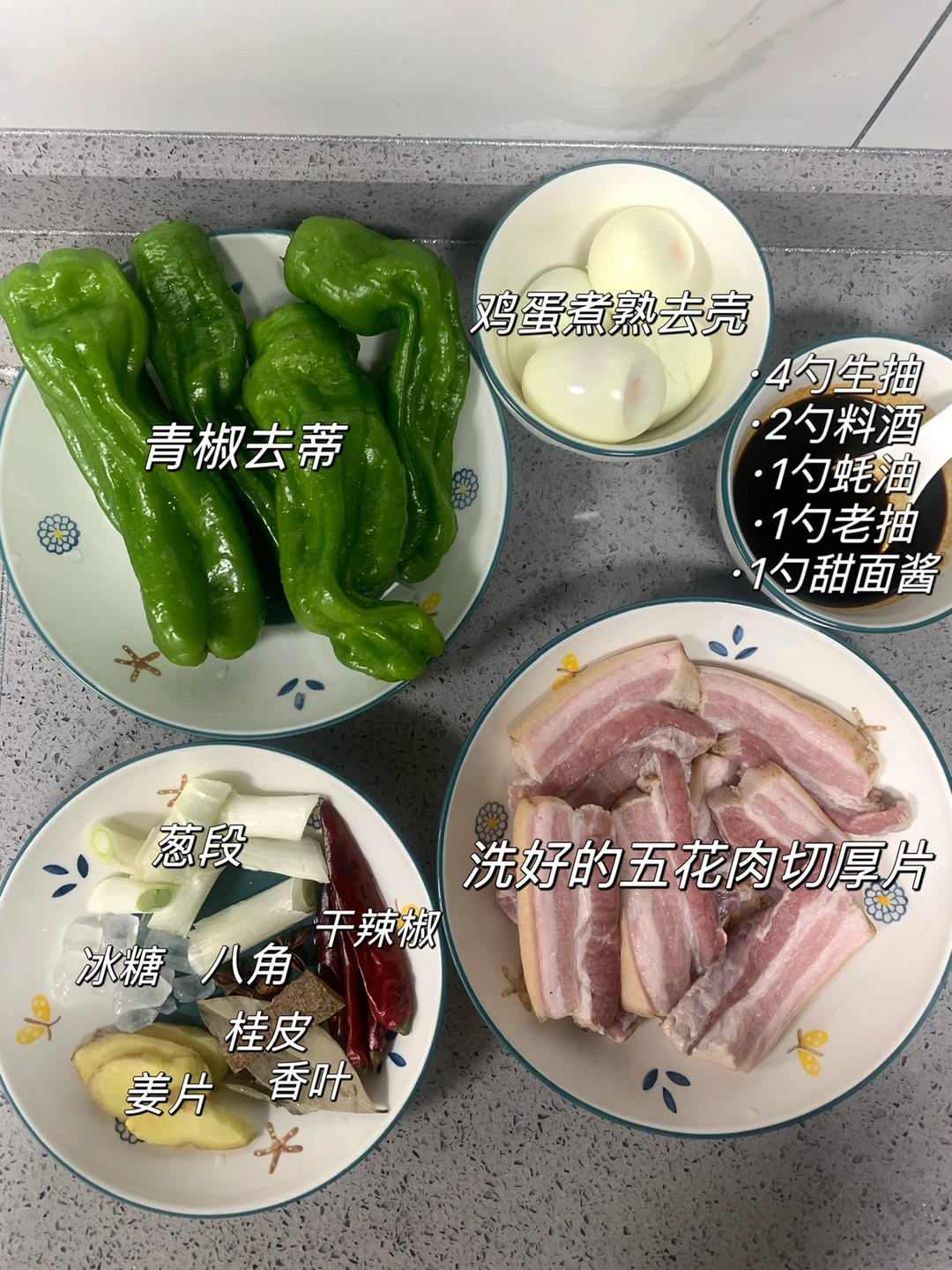 食材:五花肉、青椒、鸡蛋、姜片、葱段、冰糖、桂皮、八角、香叶、干辣椒