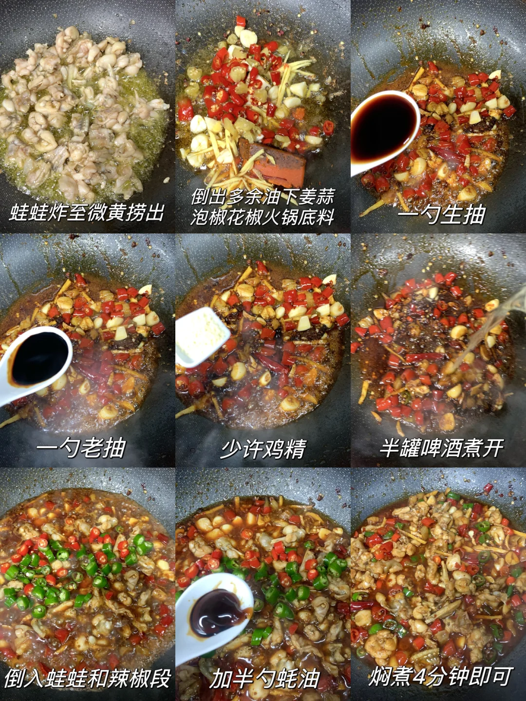 4⃣️倒入牛蛙和辣椒段,加半勺蚝油焖煮4分钟,出锅即可~
