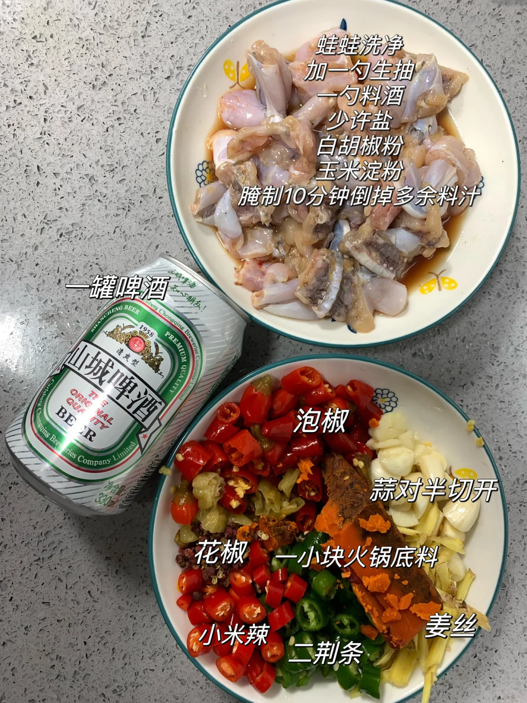 食材:牛蛙、泡椒、啤酒、火锅底料、蒜、姜、花椒、二荆条、小米辣