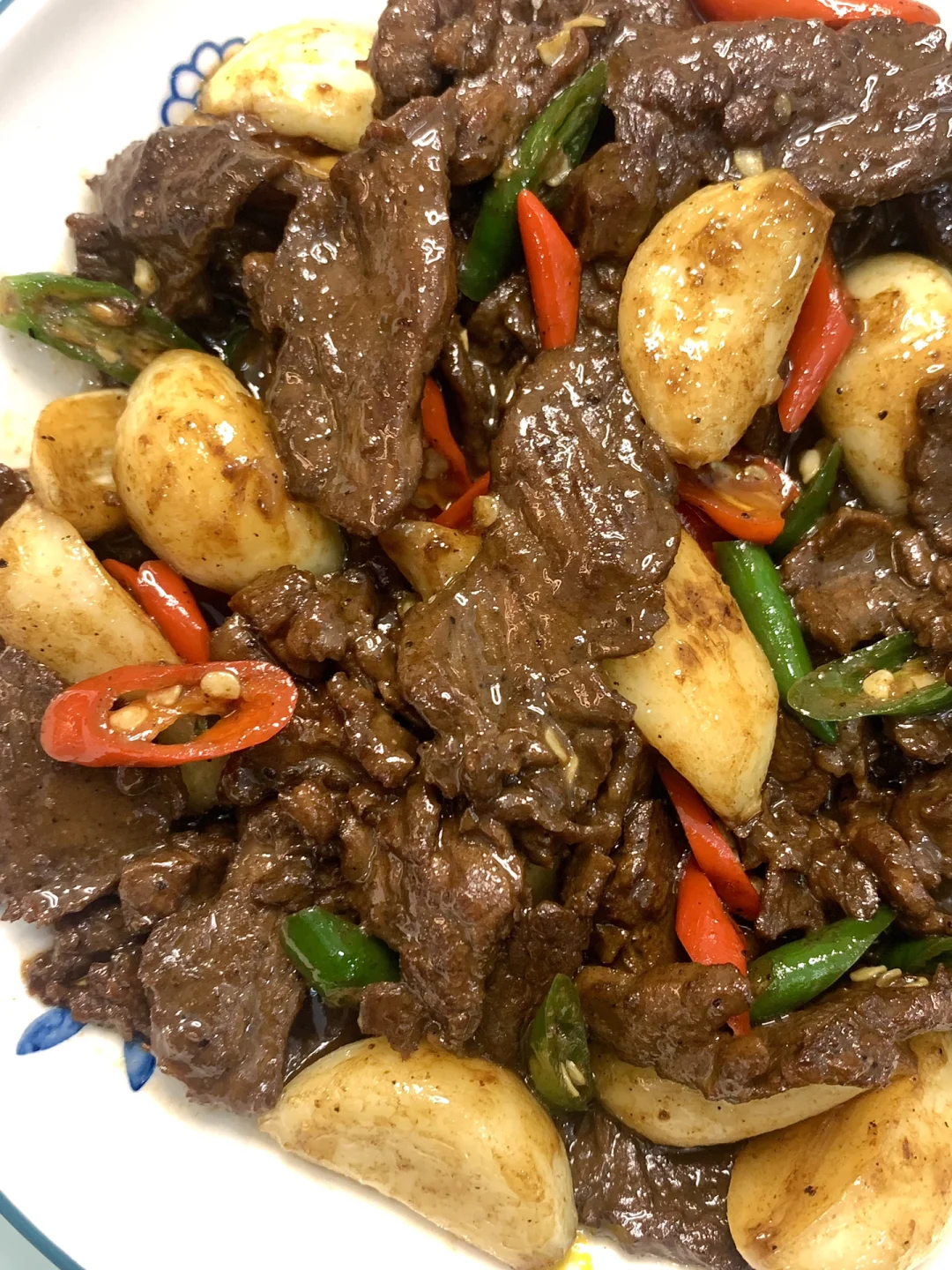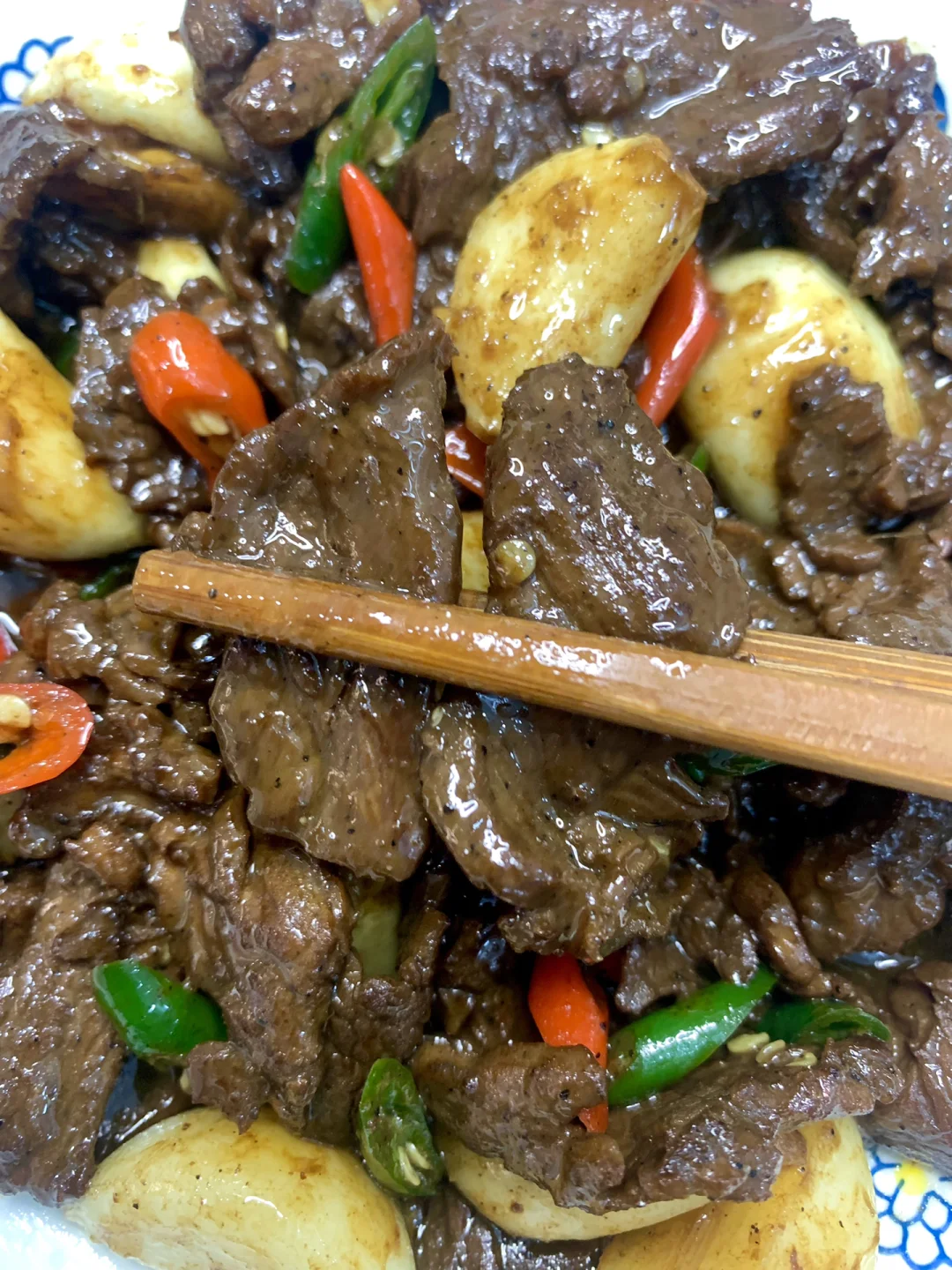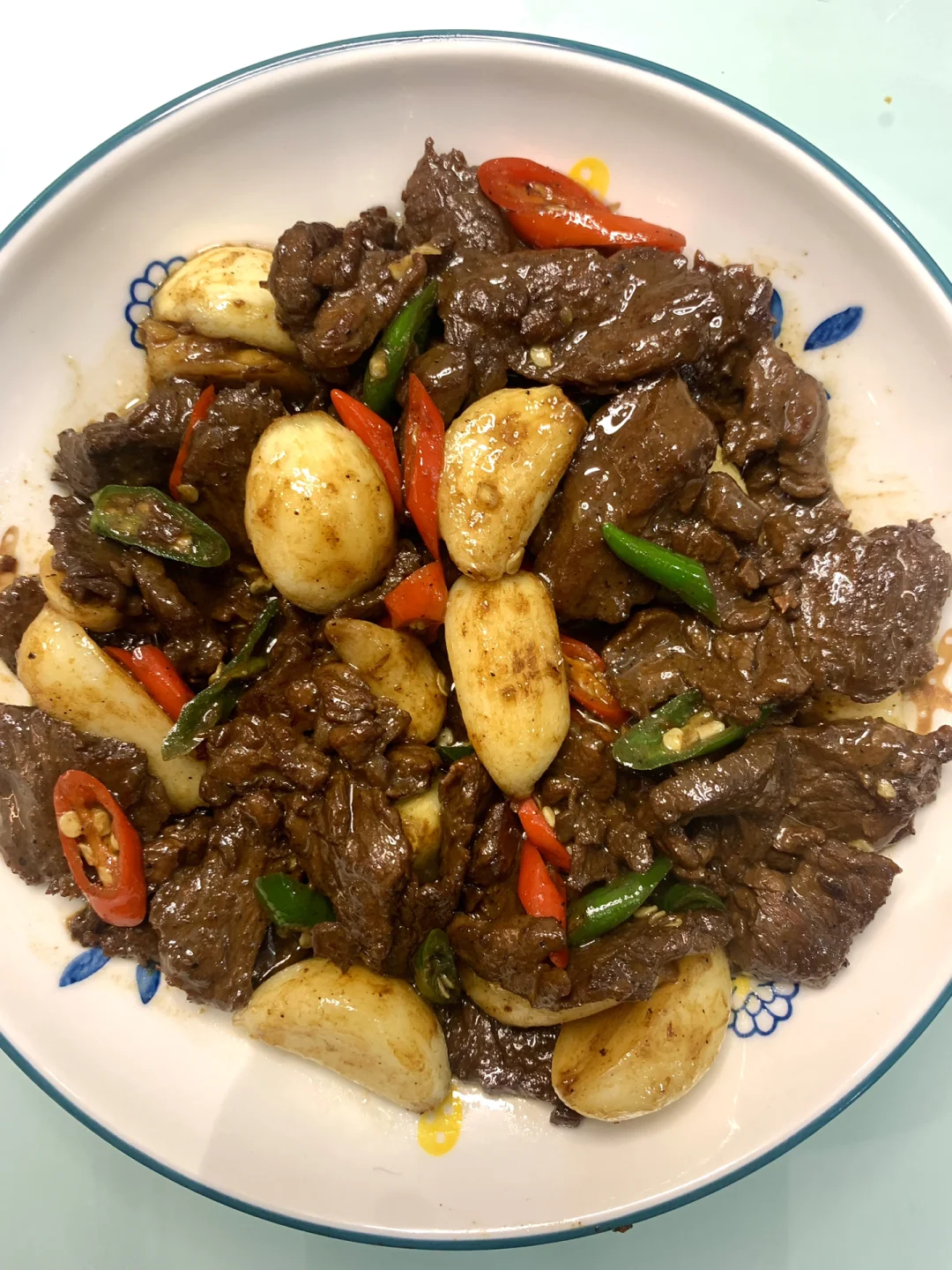 家人们听我说!!牛肉这样做真的好好吃[哭惹R][哭惹R]蒜香味十足,谁爱了[害羞R]牛肉嫩滑入味,一点也不柴!![色色R]简单好吃的10分钟快手菜,快学起来~ 食材:牛肉、大蒜、青红辣椒 食材: 1⃣️牛肉切片,加一勺生抽、一勺料酒、一勺老抽、一勺玉米淀粉、适量黑胡椒粉搅匀,再加入一勺食用油,腌制15分钟 2⃣️油热下牛肉炒至七分熟盛出,油热下蒜粒,煎至两面金黄,倒入牛肉翻炒,加一勺生抽、一勺蚝油、适量黑胡椒粉炒匀即可