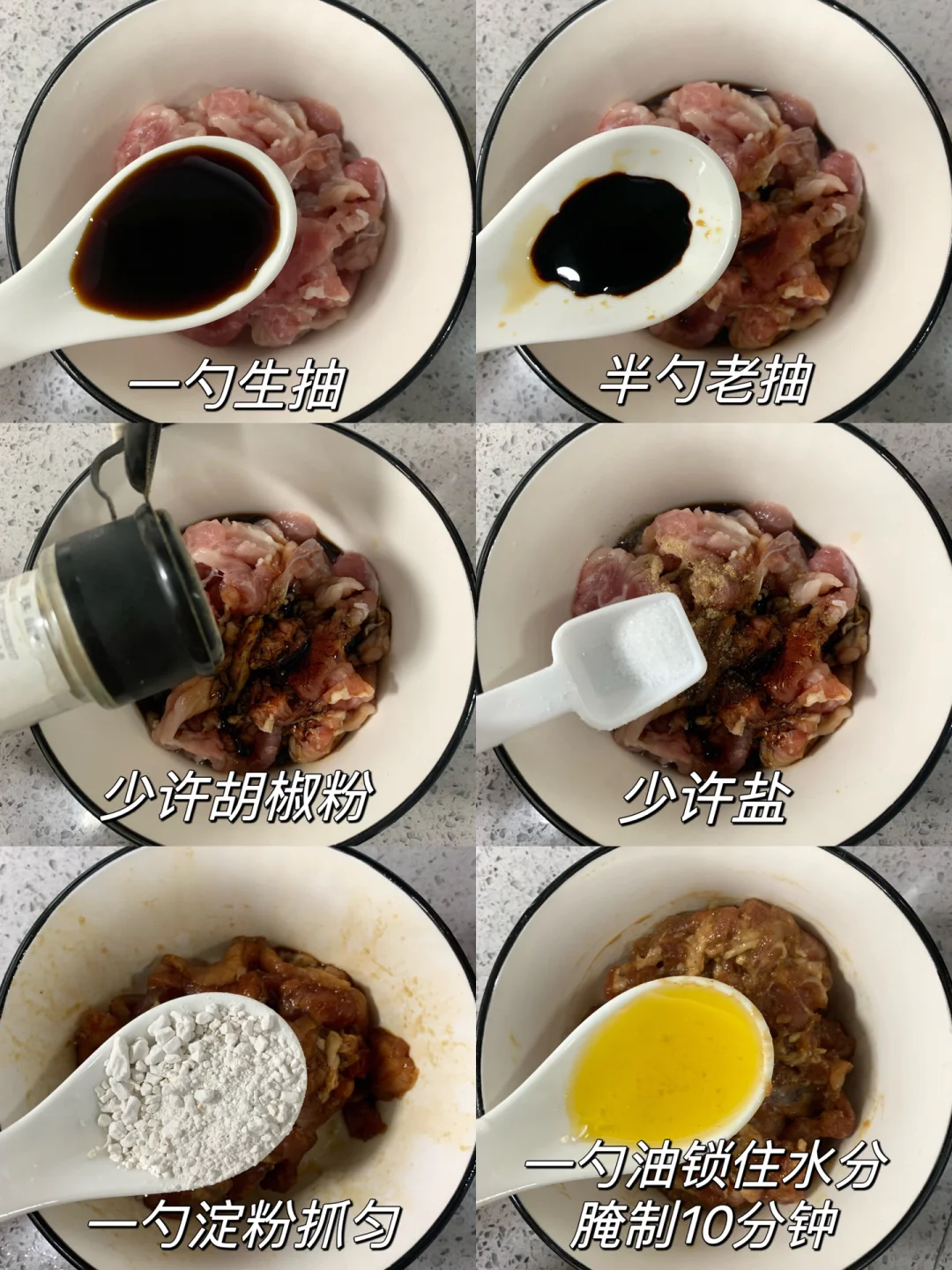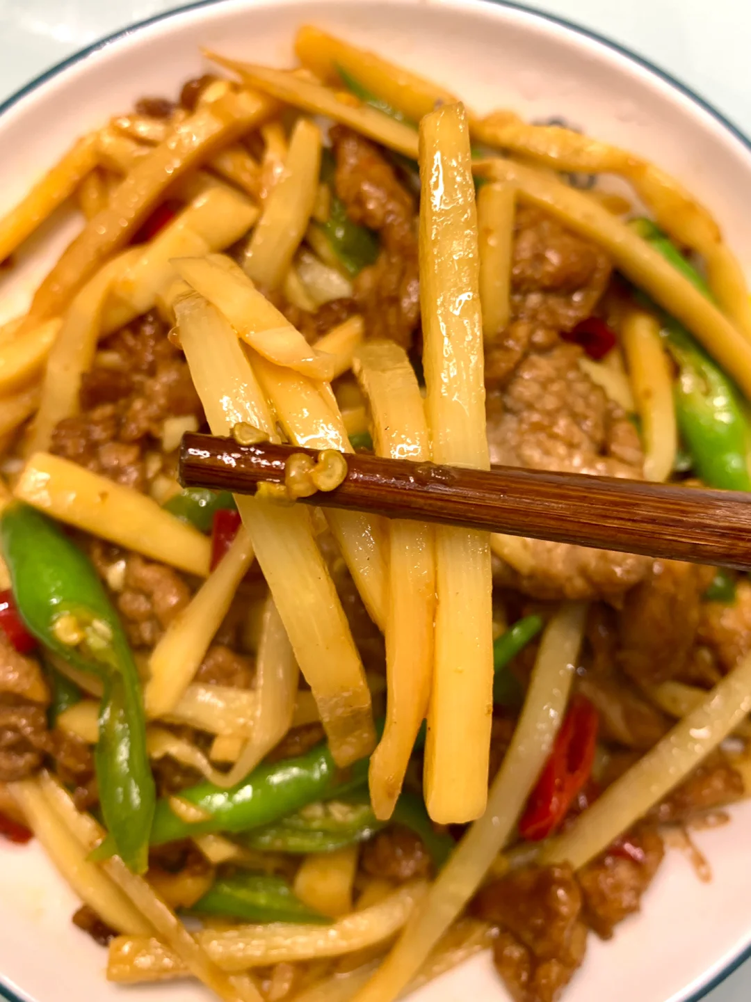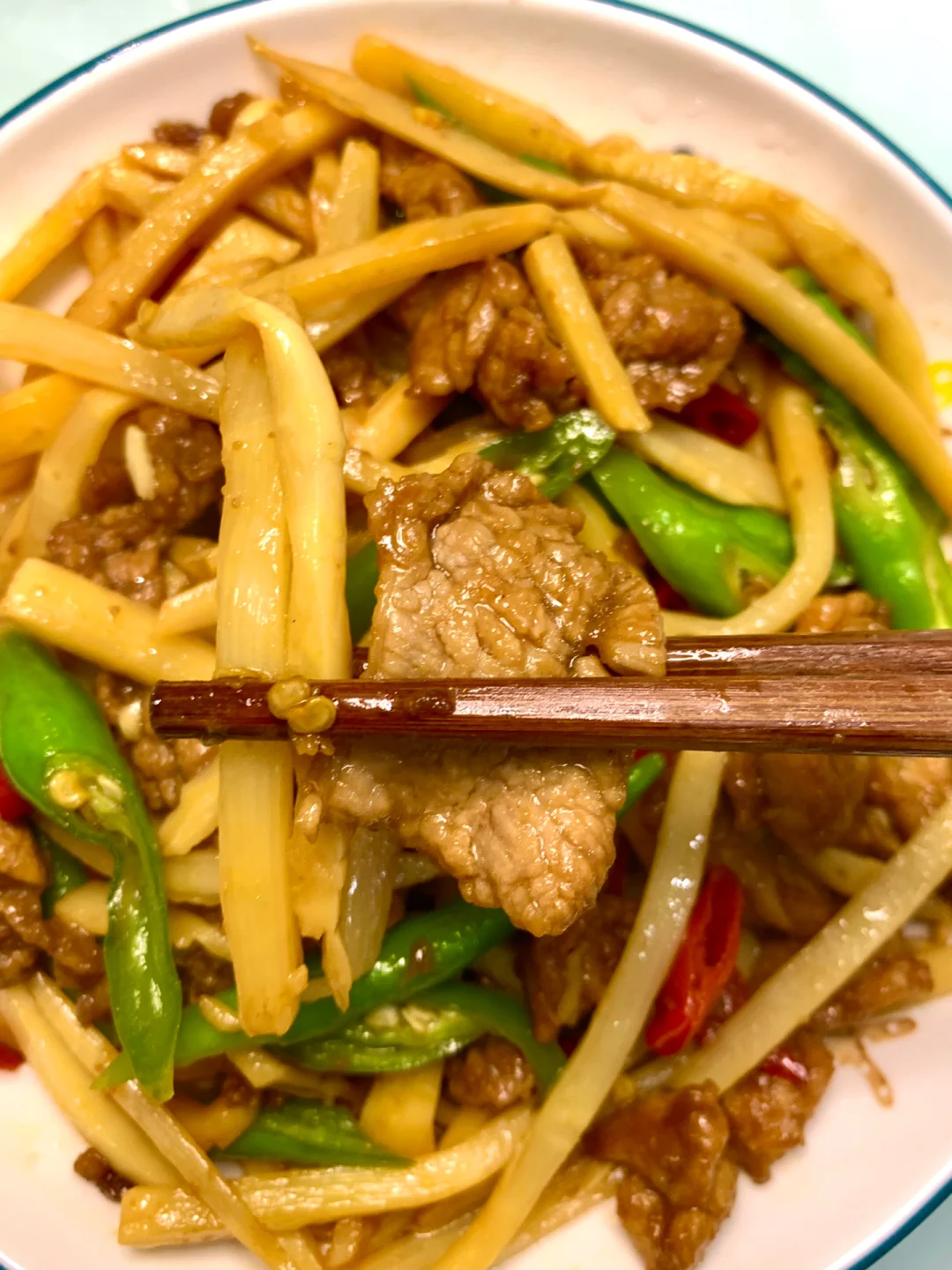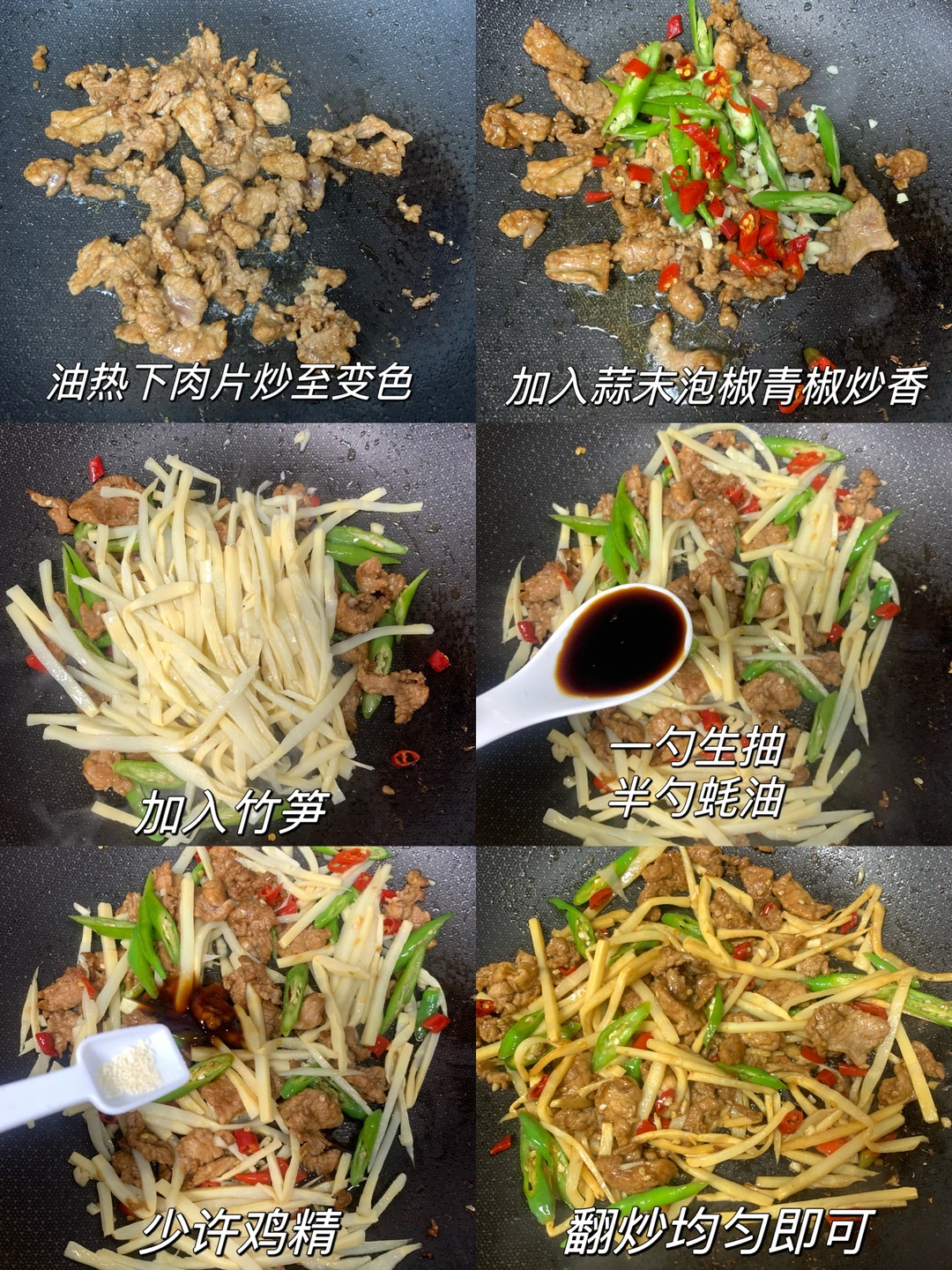 [彩虹R][彩虹R]爱吃笋的姐妹一定要试试这道竹笋炒肉[色色R][色色R]肉片一点也不柴超级入味,竹笋很嫩滑爽口,下饭太爽啦!! 食材:猪肉、竹笋(超市袋装竹笋)、泡椒、二荆条、蒜末 做法: 1⃣️瘦肉切片,加一勺生抽、半勺老抽、少许胡椒粉和盐、一勺淀粉,抓拌均匀,再加入一勺食用油锁住水分腌制10分钟 2⃣️锅中烧油,下肉片炒至变色,加入蒜末、泡椒、青椒炒香,下切好的竹笋翻炒(我买的火锅笋不用焯水) 3⃣️加入一勺生抽、半勺蚝油、少许鸡精,大火翻炒均匀即可~