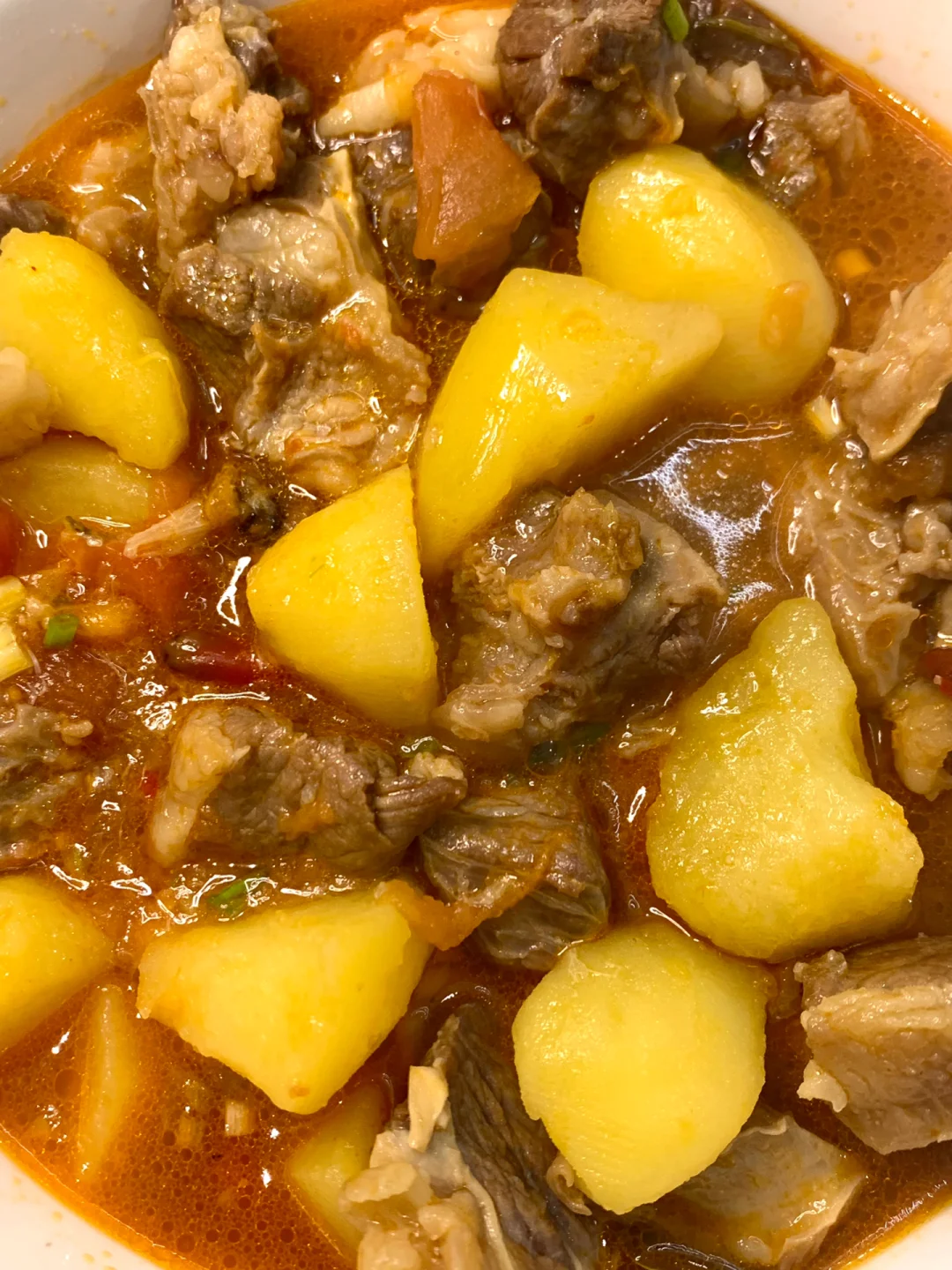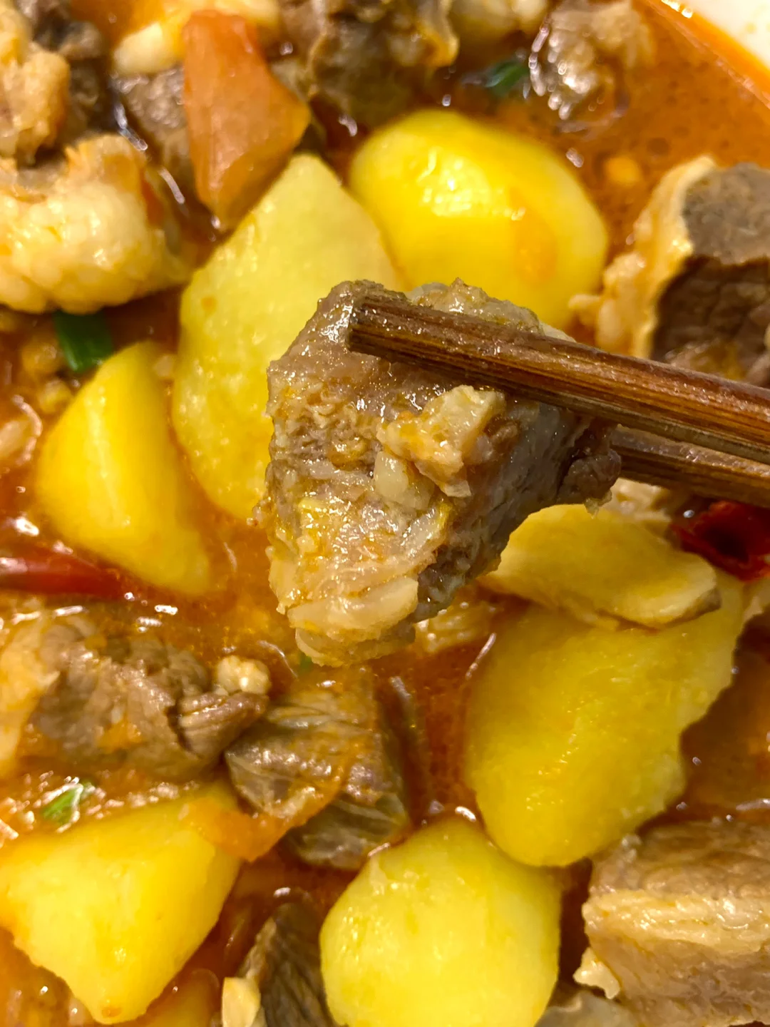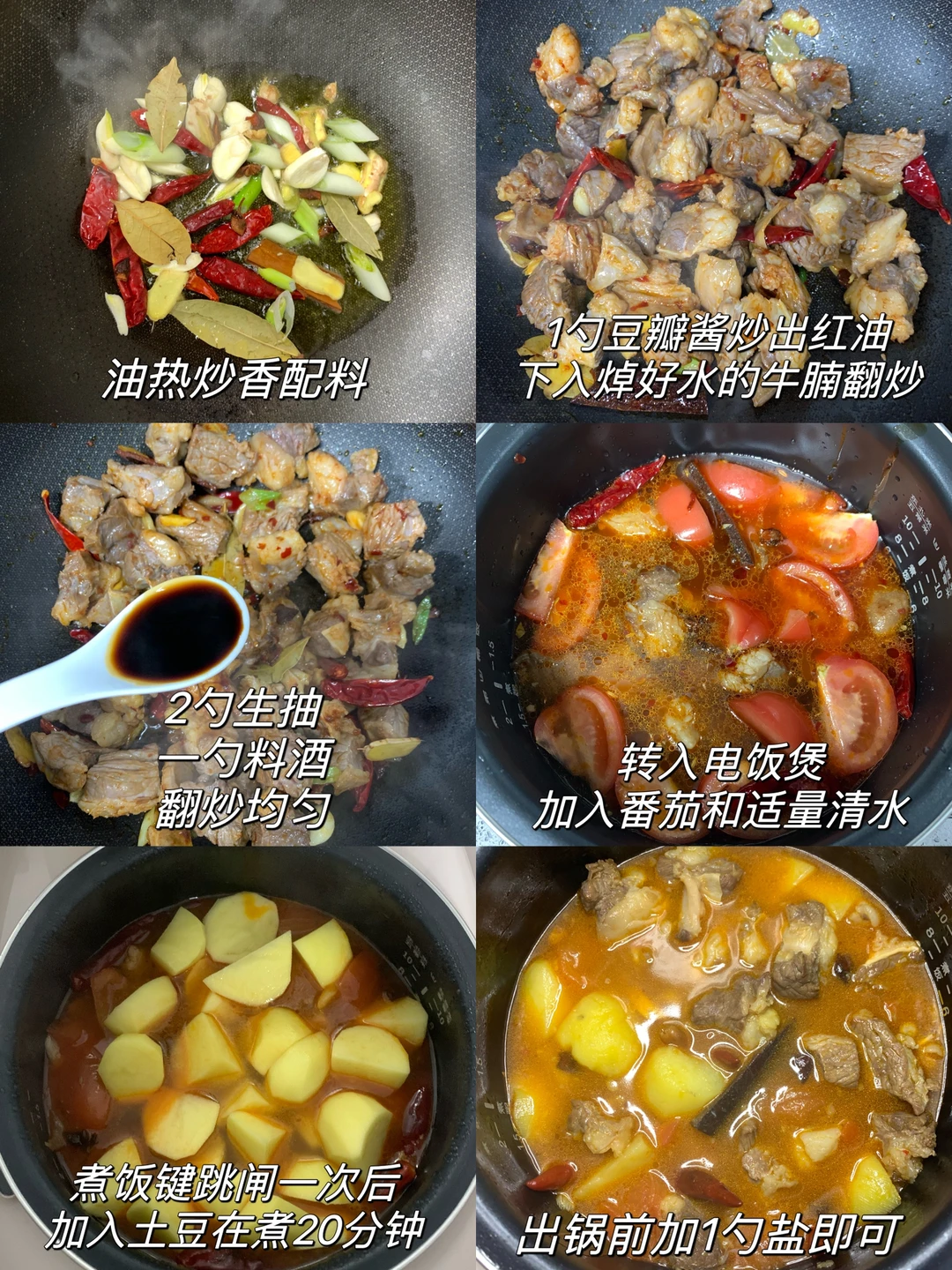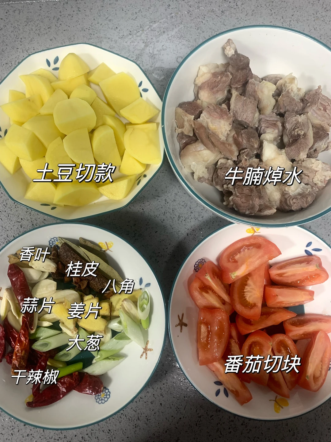 食材:牛腩、土豆、番茄、干辣椒、姜、蒜、大葱、桂皮、八角、香叶