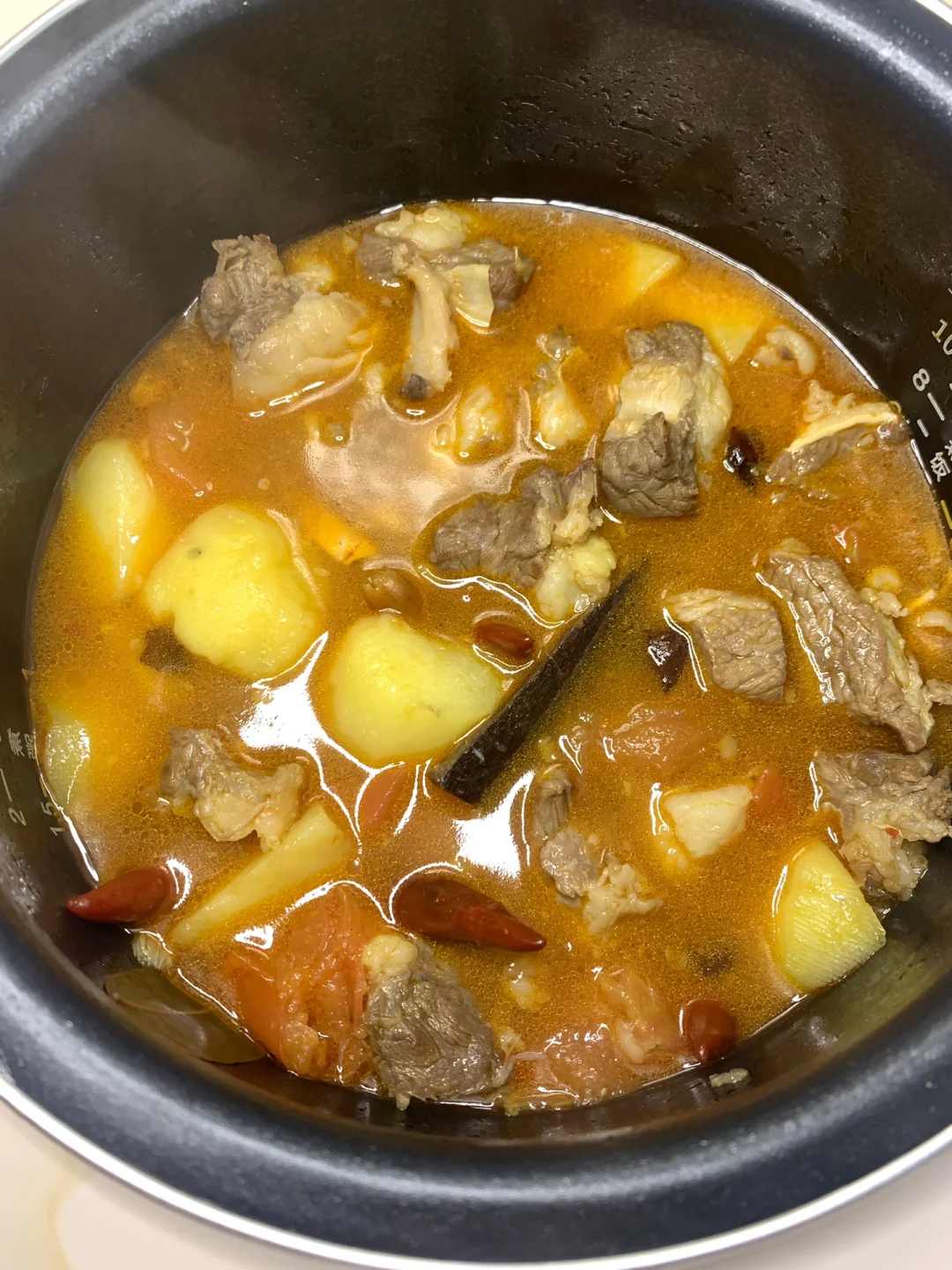 3⃣️倒入电饭煲,加番茄块和适量清水,按煮饭键煮至跳闸,再加入土豆块继续煮20-30分钟即可