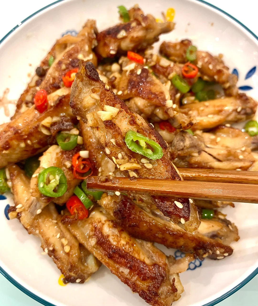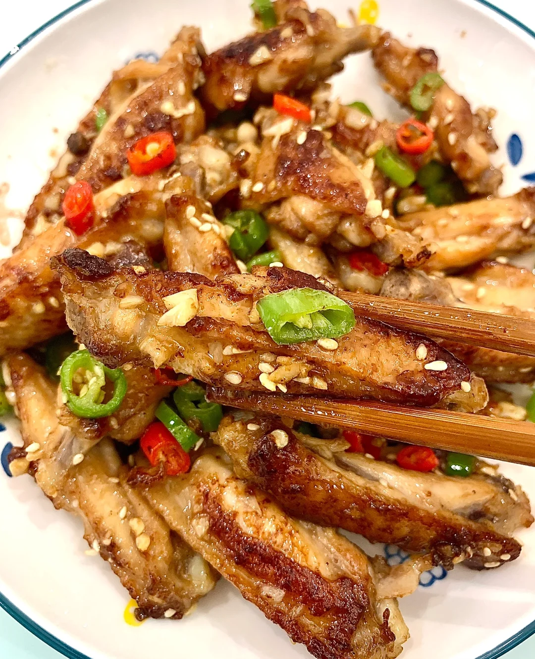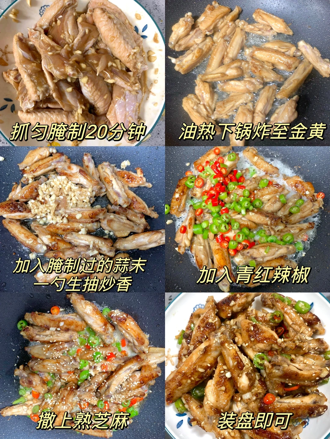 嘴馋的时候最爱吃香喷喷的蒜香鸡翅了,香得连骨头都想嚼了🤣做法超级简单!有任何人不会我都会难过的! [彩虹R][彩虹R]食材:鸡翅10个,一头大蒜切成蒜末 1⃣️鸡翅改刀切成两半,泡出血水沥干,加入2勺生抽、一勺料酒、一勺蚝油、适量盐和胡椒粉、一勺淀粉、蒜末腌制20分钟 2⃣️锅烧热,下入刮去蒜末的鸡翅(蒜末一起煎会糊),煎至两面金黄,加入腌制过的蒜末、一勺生抽炒香,加入青红辣椒翻炒均匀,撒上熟芝麻即可