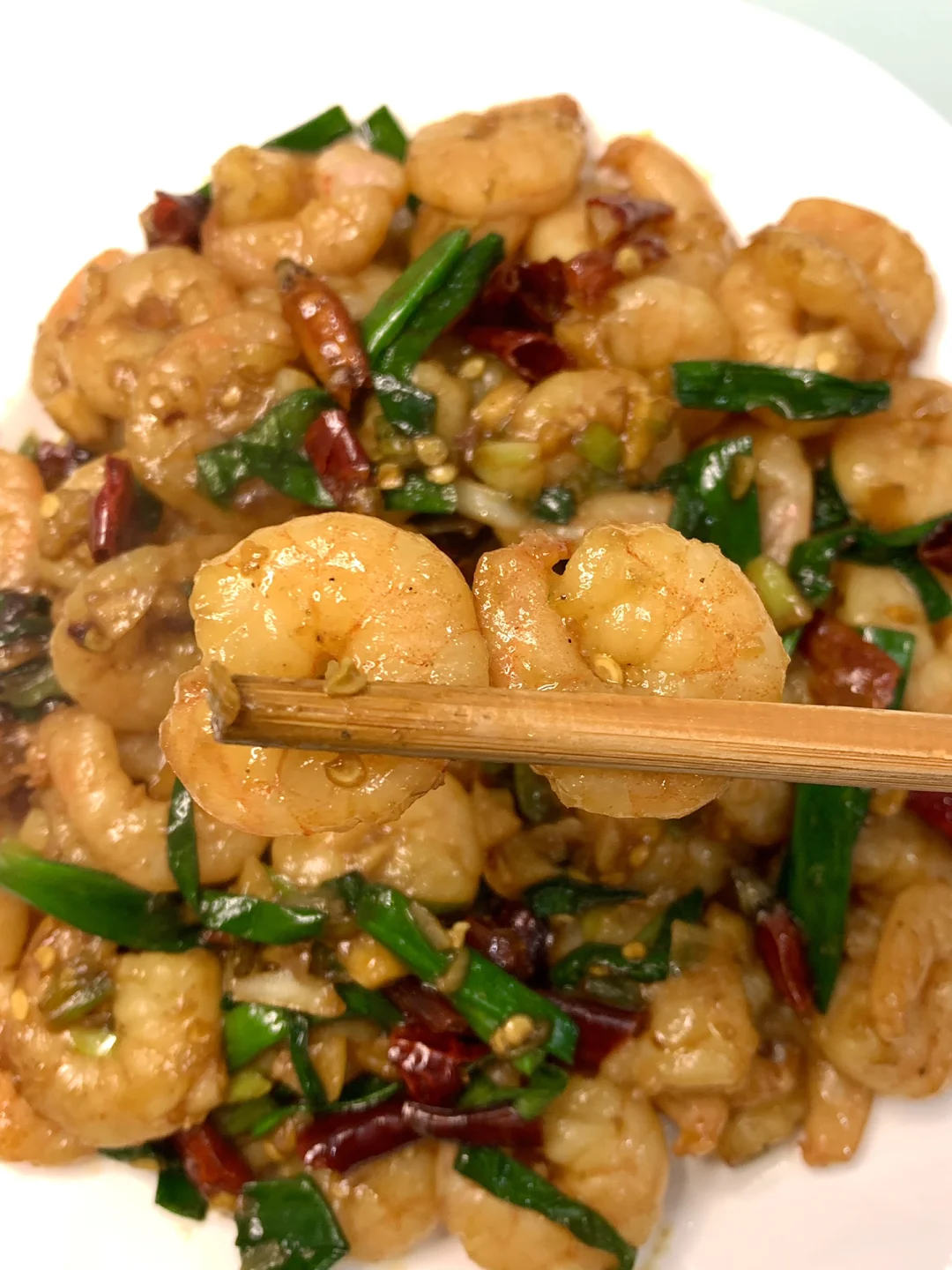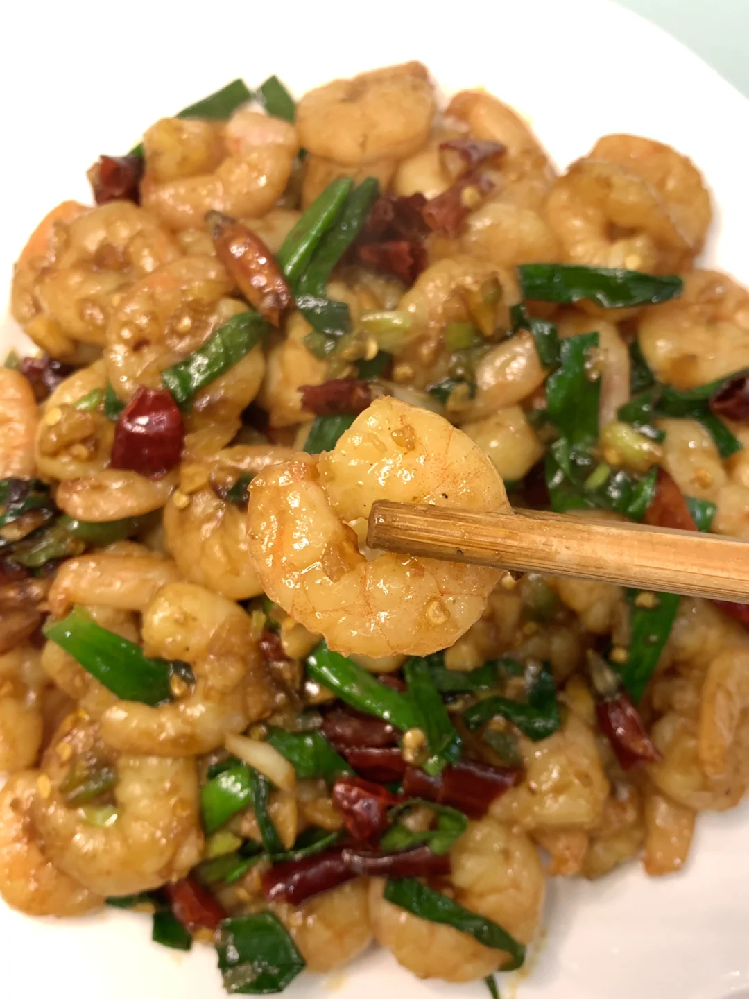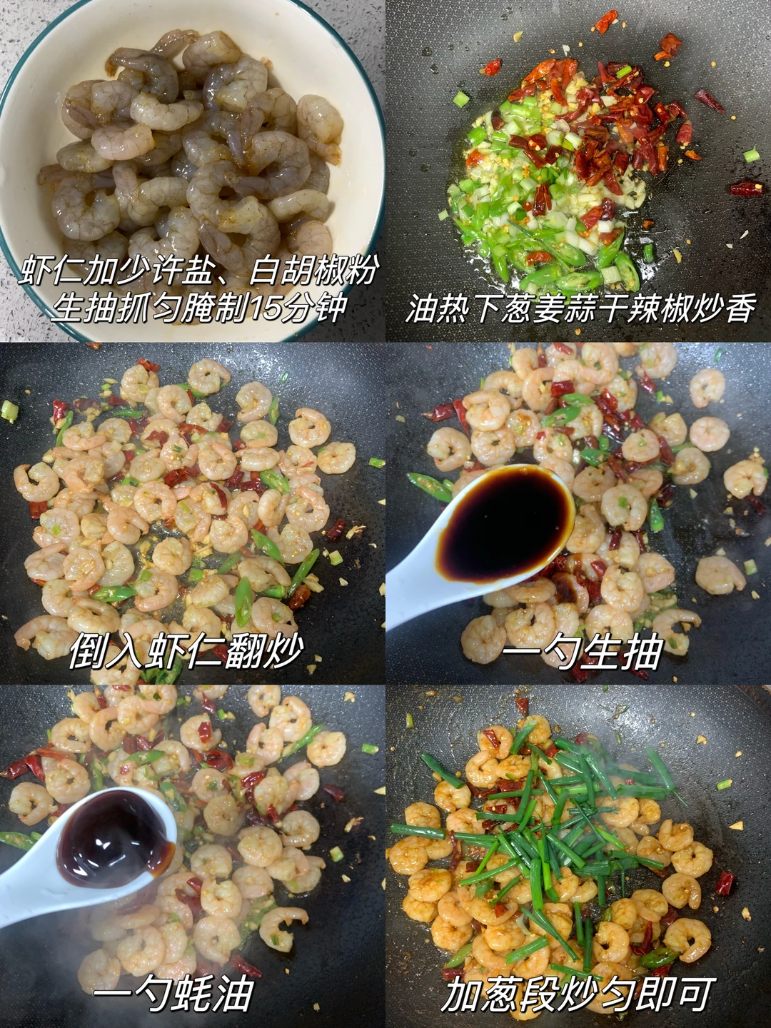 [彩虹R]今晚做的香辣虾仁香迷糊了!!超级入味,做少了都不够吃[色色R][色色R]一定要试试 食材:虾仁、葱、姜、蒜、干辣椒 做法: 1⃣️虾仁加少许盐和胡椒粉、生抽抓匀腌制15分钟 2⃣️锅中烧油,油热下葱姜蒜干辣椒炒香,加入虾仁翻炒均匀,再加入一勺生抽、一勺蚝油翻炒,撒上葱段炒匀即可