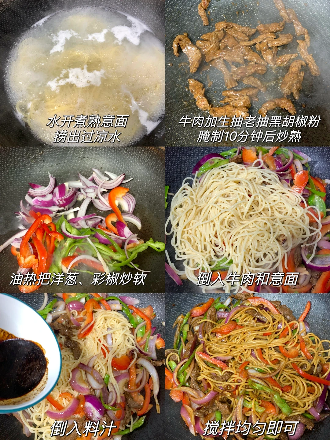好久没吃意面啦,今天在家做了,超好吃!!和西餐厅的味道一样!干净卫生做法超简单[赞R][赞R]几分钟搞定 食材:意面、牛肉、彩椒、青椒、洋葱 做法: 1⃣️牛肉切条,加一勺生抽、一勺老抽和适量黑胡椒粉搅匀腌制10分钟 2⃣️调个料汁:2勺生抽➕一勺老抽➕一勺蚝油➕半勺黑胡椒粉 3⃣️水开煮意面,煮熟捞出过凉水 4⃣️油热下牛肉,滑熟捞出,另起锅烧油,下彩椒青椒和洋葱炒软,倒入牛肉和意面,加入料汁炒匀即可