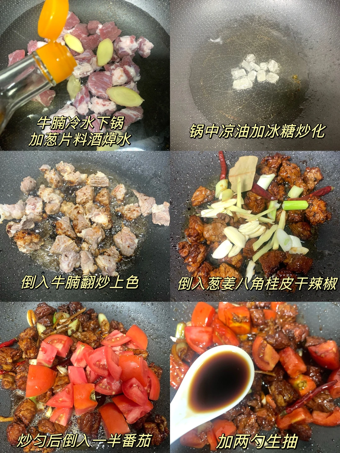 2⃣️热锅凉油下入冰糖小火炒化,加入牛腩翻炒上色,再加入葱、姜、蒜、八角、桂皮、干辣椒炒出香味,加入一半番茄块➕两勺生抽➕一勺老抽➕一勺蚝油,倒入热水没过食材,小火炖一小时