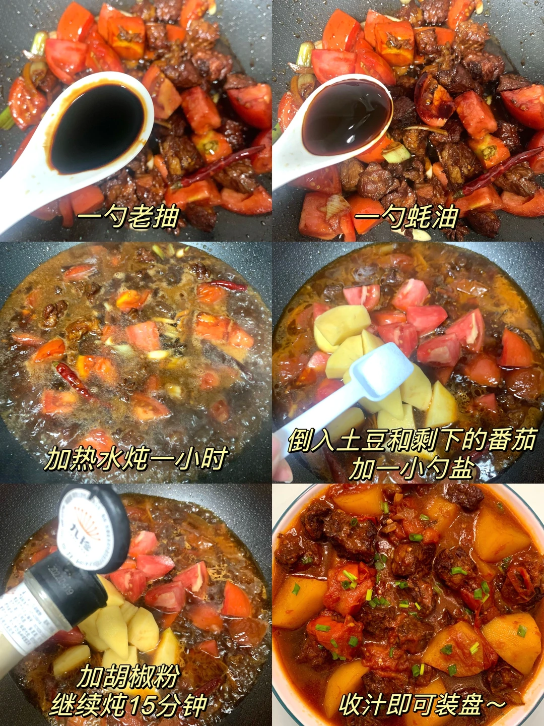 3⃣️开盖加入剩下的番茄块和土豆,加一小勺盐和胡椒粉,继续炖煮15分钟,收汁即可