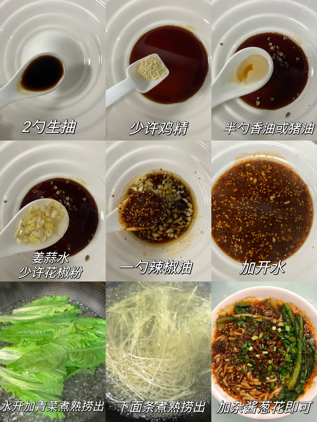 1⃣️调佐料:2勺生抽、少许鸡精、半勺芝麻油或猪油、姜蒜水(姜蒜末和清水比例为3:1)、少许花椒粉、一勺辣椒油,再加入适量开水
