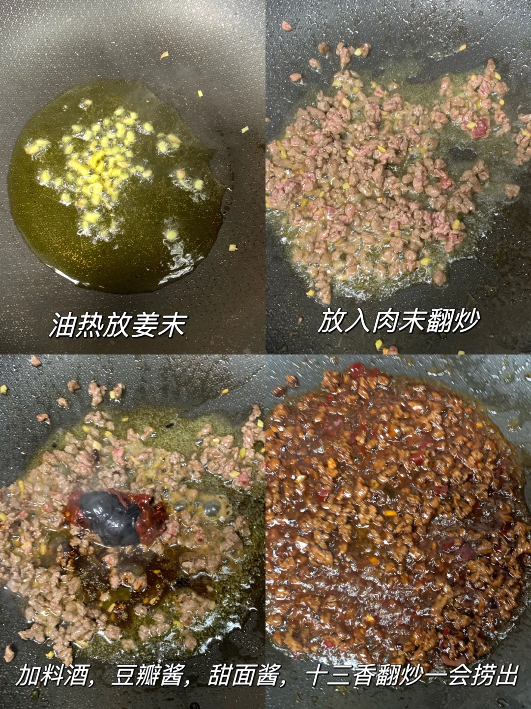 2⃣️炒杂酱:油热下姜末翻炒,加入肉末炒熟,加料酒、豆瓣酱、甜面酱、十三香(没有可不放)翻炒一会儿捞出
