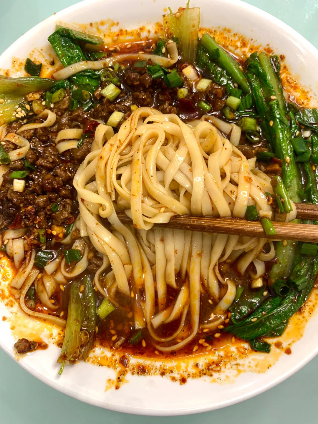 食材:挂面、肉末、葱花、青菜、花椒粉、姜、蒜、辣椒油(前面有教材)
