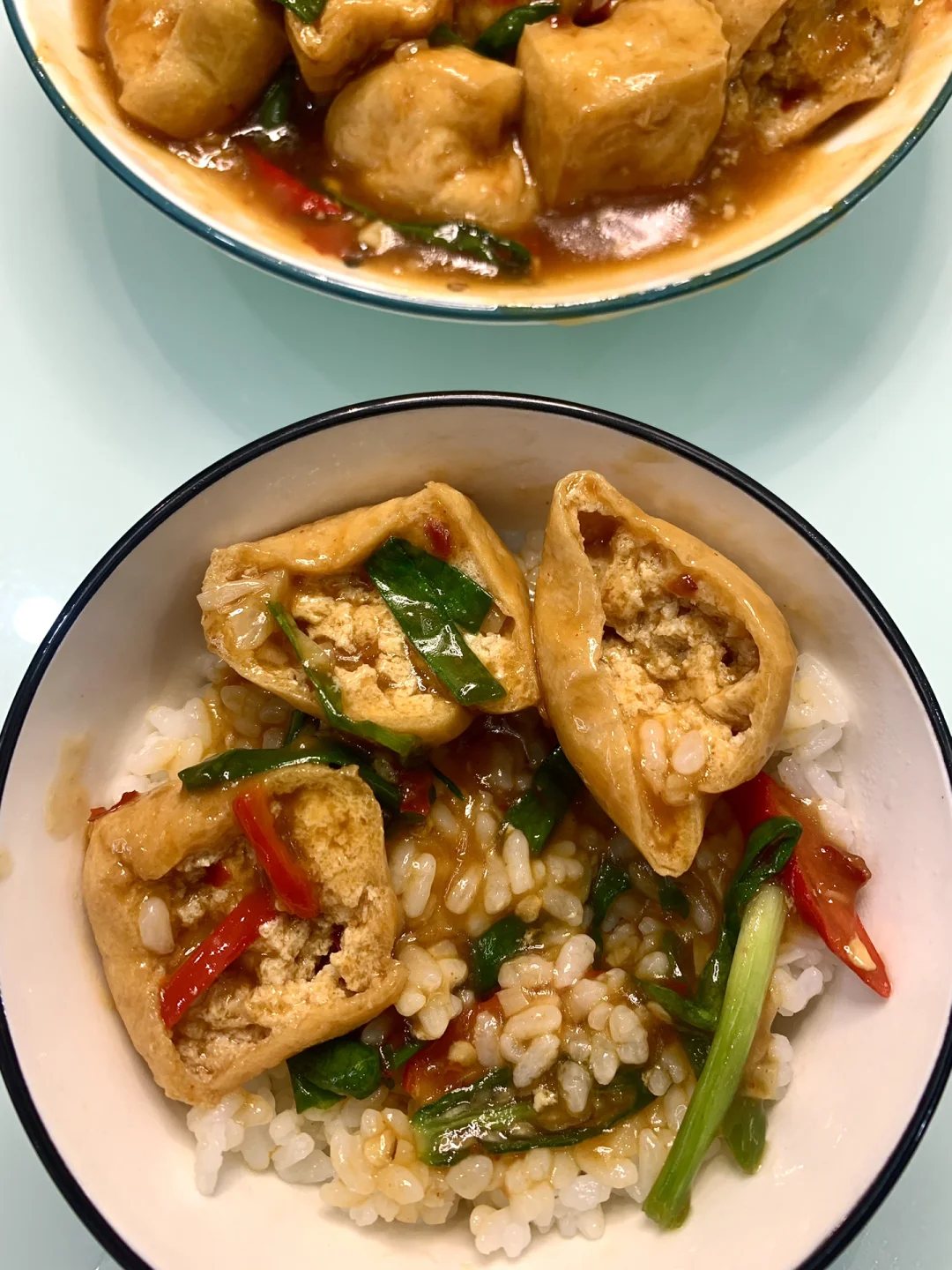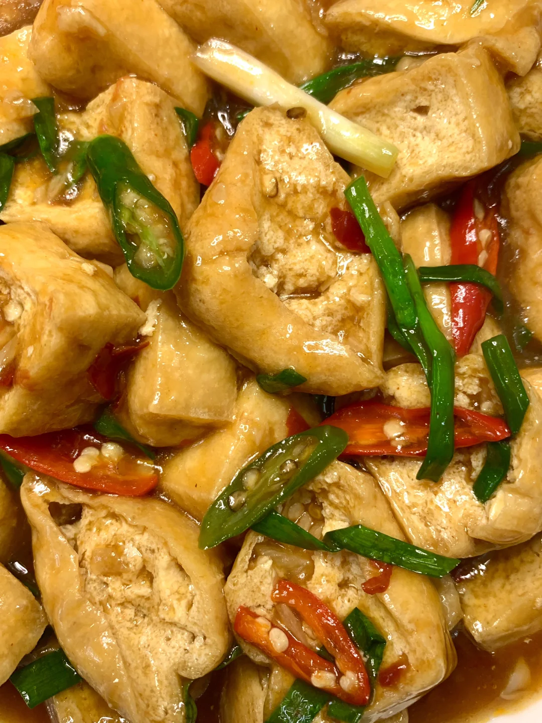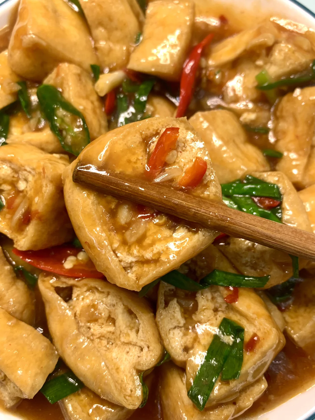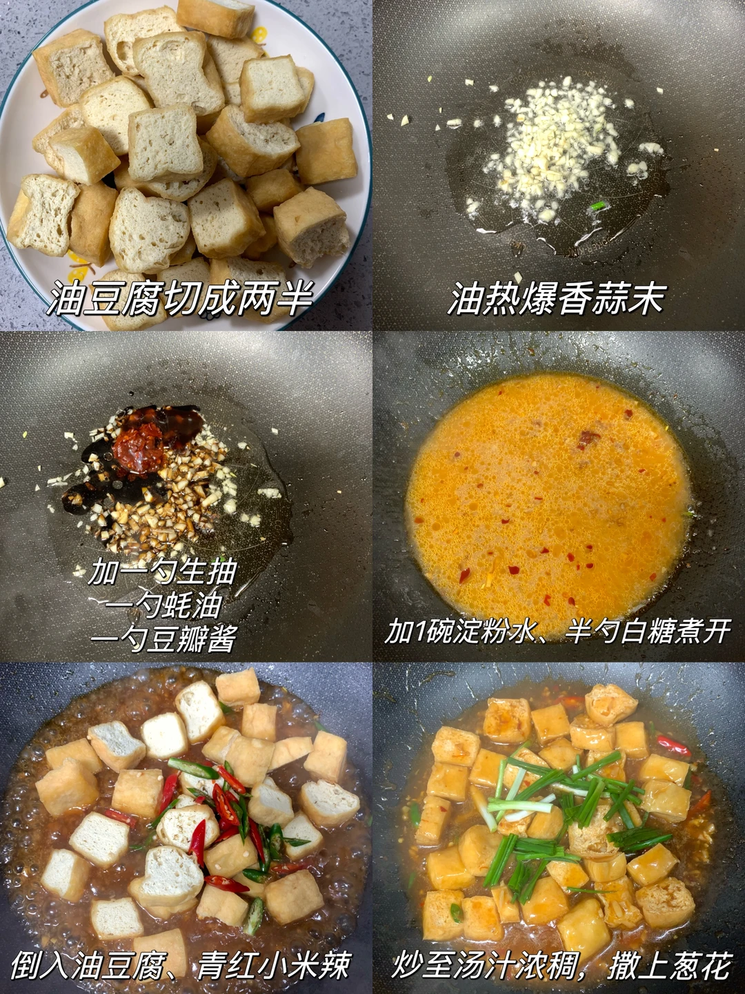 绝了!!油豆腐这样做真的超好吃!每一块油豆腐都吸满了汤汁,拌米饭真的绝[赞R][赞R]做这道菜一定要多煮点米饭,不然真不够吃[色色R] 食材:油豆腐、葱、蒜、青红小米辣 做法: 1⃣️油豆腐多半切开,油热炒香蒜末,加一勺生抽、一勺蚝油、一勺豆瓣酱炒出红油, 2⃣️倒入一碗淀粉水,加一勺白糖煮开,加入油豆腐和青红辣椒,炒至汤汁浓稠撒上葱段即可