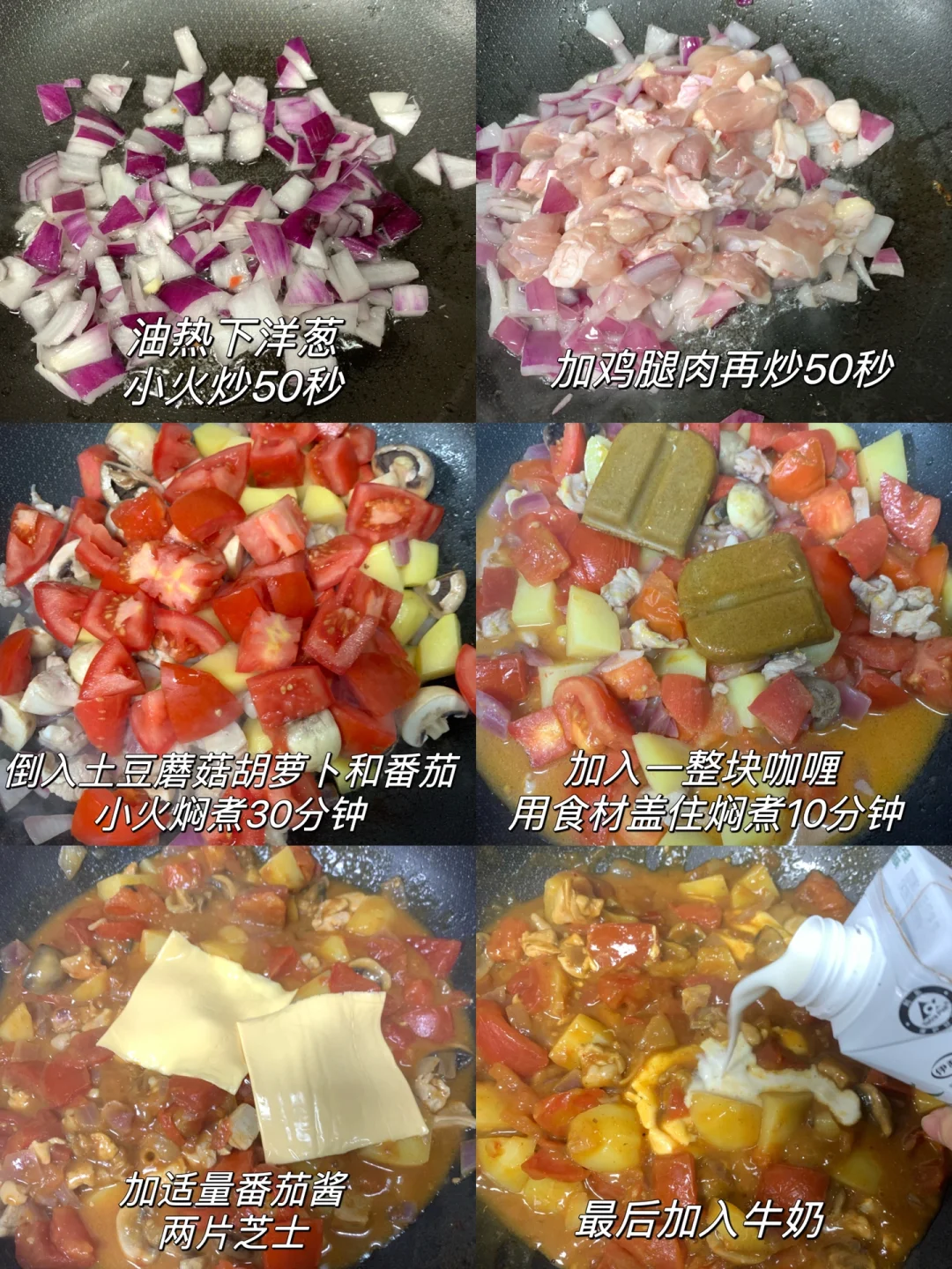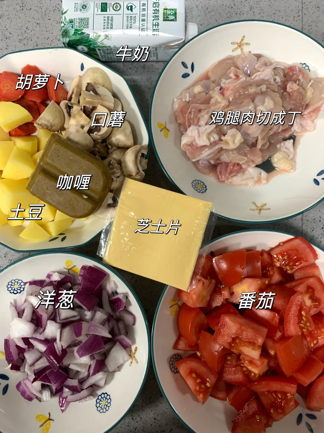 食材:鸡腿肉、番茄(怕酸的话用红彤彤的熟番茄不会很酸)、土豆、洋葱、口蘑、胡萝卜、咖喱块、芝士片、蕃茄酱、椰浆或牛奶