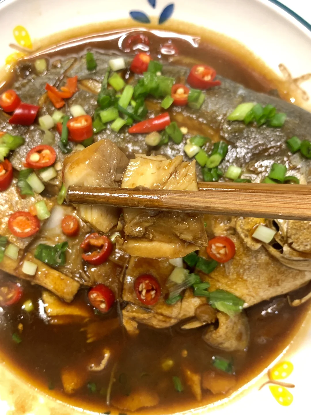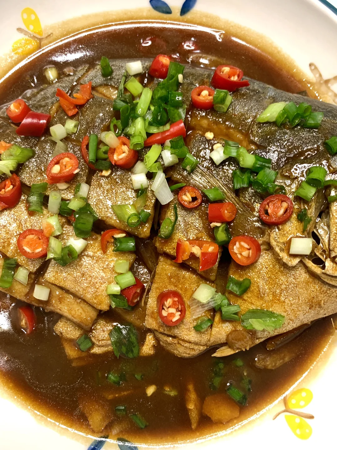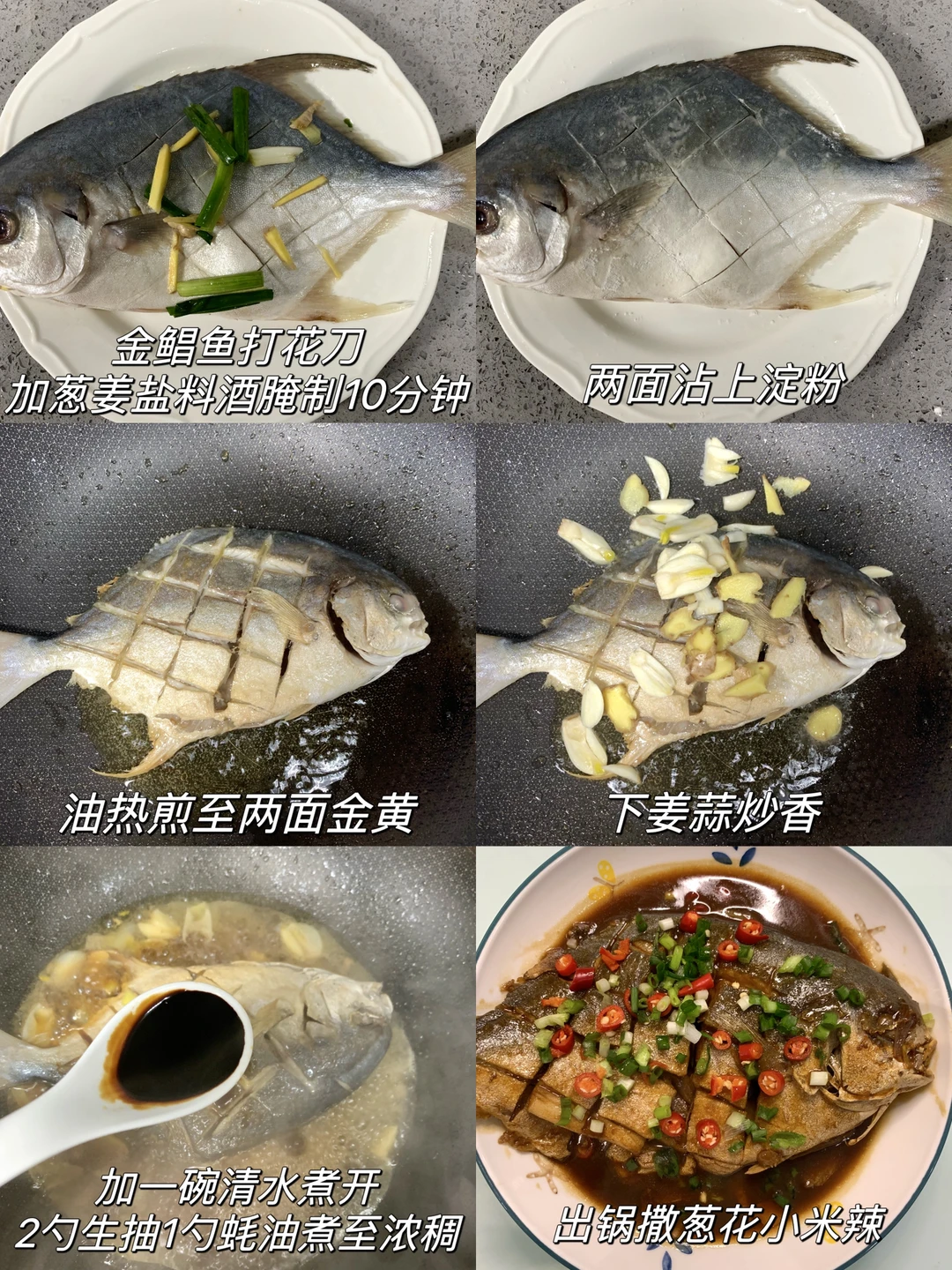 [彩虹R][彩虹R][彩虹R]今天被自己做的红烧金鲳鱼香迷糊了,感觉比其他鱼好吃,没什么刺[自拍R]怕刺星人可以放心吃,这么做出来很入味,真的绝啦!! 食材:金鲳鱼、姜、蒜、小米辣、葱花 做法: 1⃣️金鲳鱼处理好洗净,两面改花刀,加一勺盐、一勺料酒、适量葱姜摸匀,腌制10分钟 2⃣️摘掉葱姜,两面沾上淀粉,油热下锅炸至两面金黄,下入姜蒜炒香 3⃣️加入一碗清水煮开,加2勺生抽、一勺蚝油,煮至汤汁浓稠,出锅撒上葱花小米辣即可