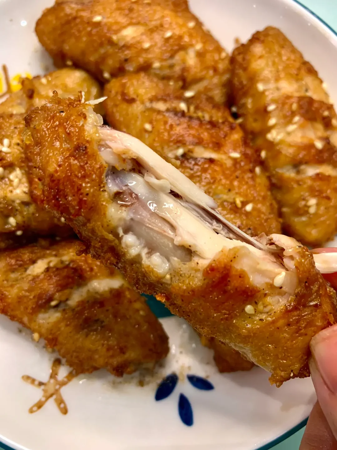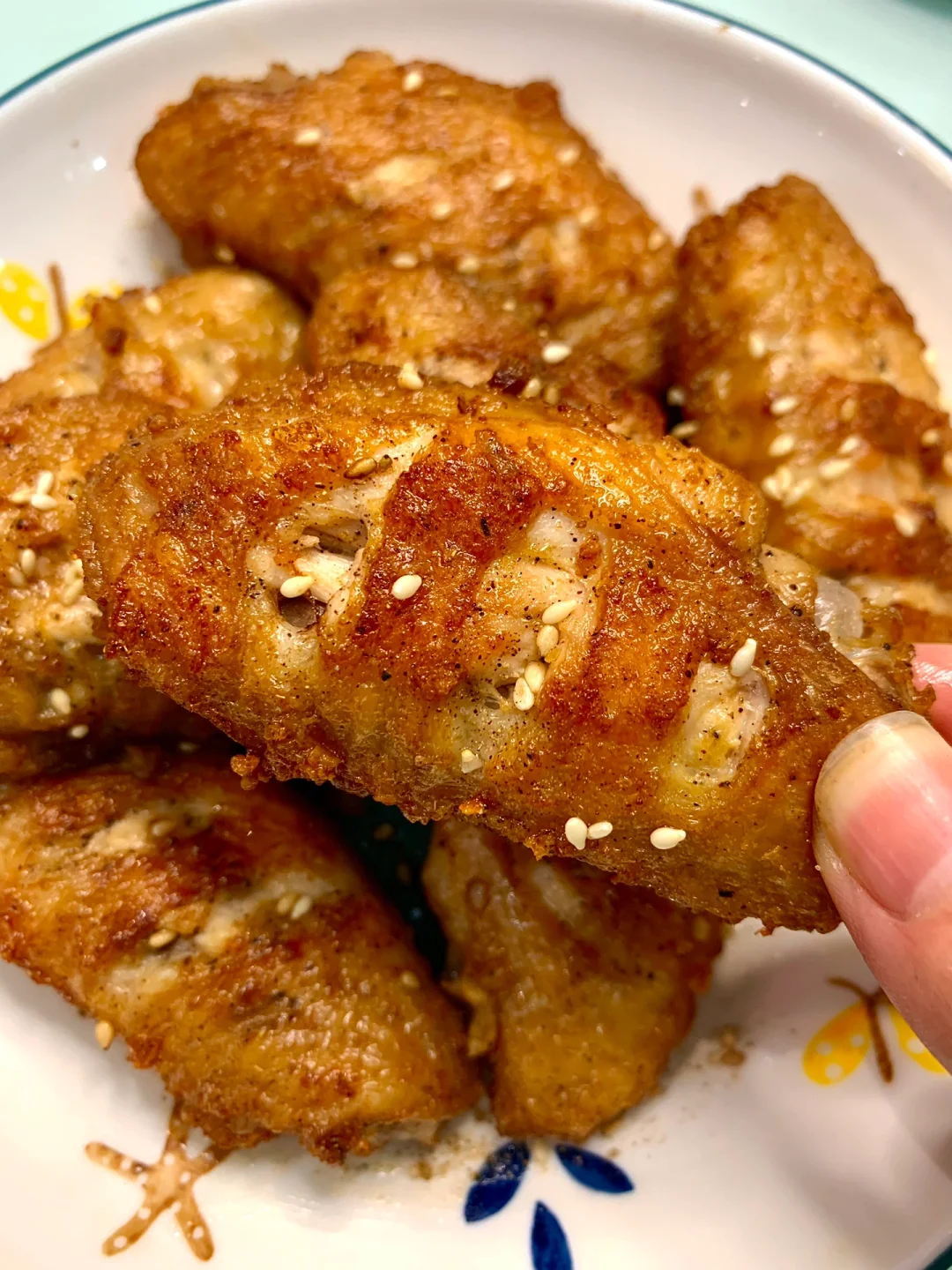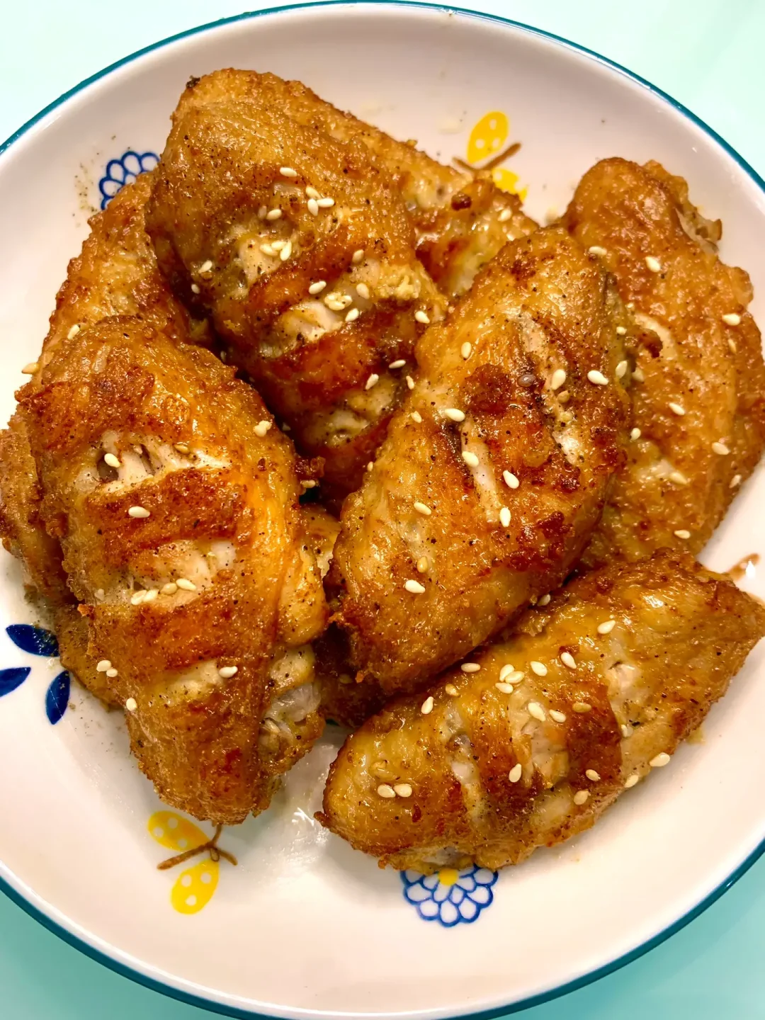 姐妹们鸡翅这么做真的绝!一口气直接炫5个![赞R]外酥里嫩~爱吃鸡翅的姐妹们一定要试试[害羞R][害羞R] 食材:鸡翅、鸡蛋、椒盐粉、黑胡椒粉、白芝麻 做法: 1⃣️鸡翅洗净两面划刀,加一勺料酒、两勺生抽、一勺蚝油、适量黑胡椒粉抓匀腌制半小时 2⃣️倒出多余的调料,打入一个鸡蛋,加一勺玉米淀粉抓匀下油锅炸,大火炸至定型后立马转小火 3⃣️炸十分钟左右,中途多翻面,出锅撒上椒盐粉、白芝麻即可~