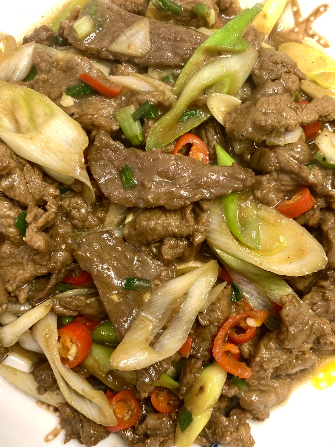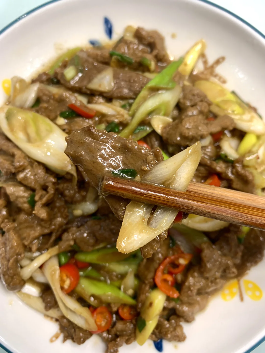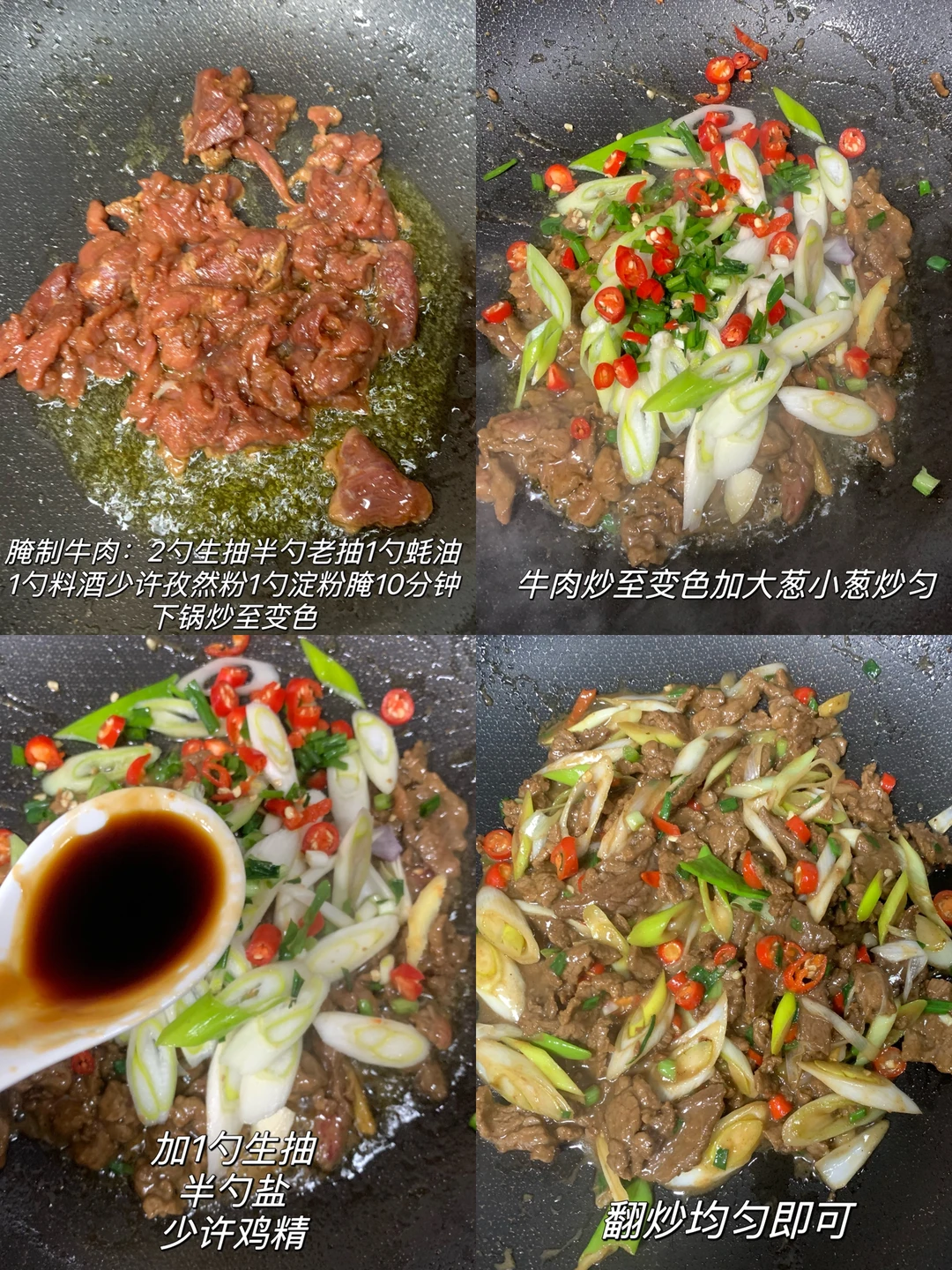 葱爆牛肉这样做太太太好吃啦[派对R][派对R]葱香味十足,牛肉很入味,超级下饭!!做饭很简单,十分钟就能搞定哦[暗中观察R] 食材:牛肉、大葱、小葱、小米辣 做法: 1⃣️牛肉切片,洗去血水沥干水分,加两勺生抽、一勺料酒、一勺蚝油、半勺老抽、适量孜然粉、一勺淀粉抓匀,淋上植物油腌制10分钟 2⃣️油热下牛肉炒至变色,加大葱小葱和小米辣翻炒几下,加一勺生抽、少许盐和鸡精大火炒匀即可